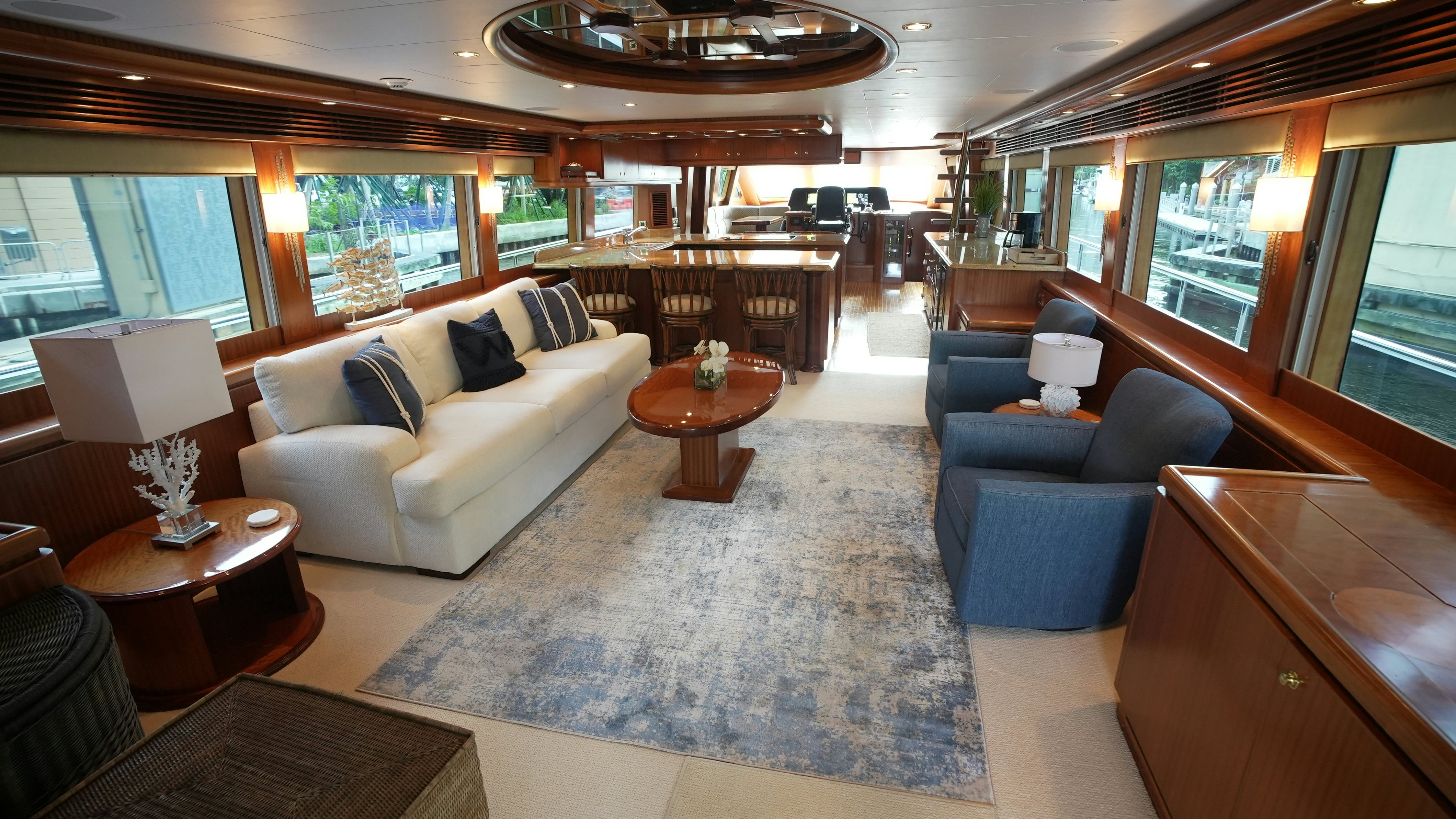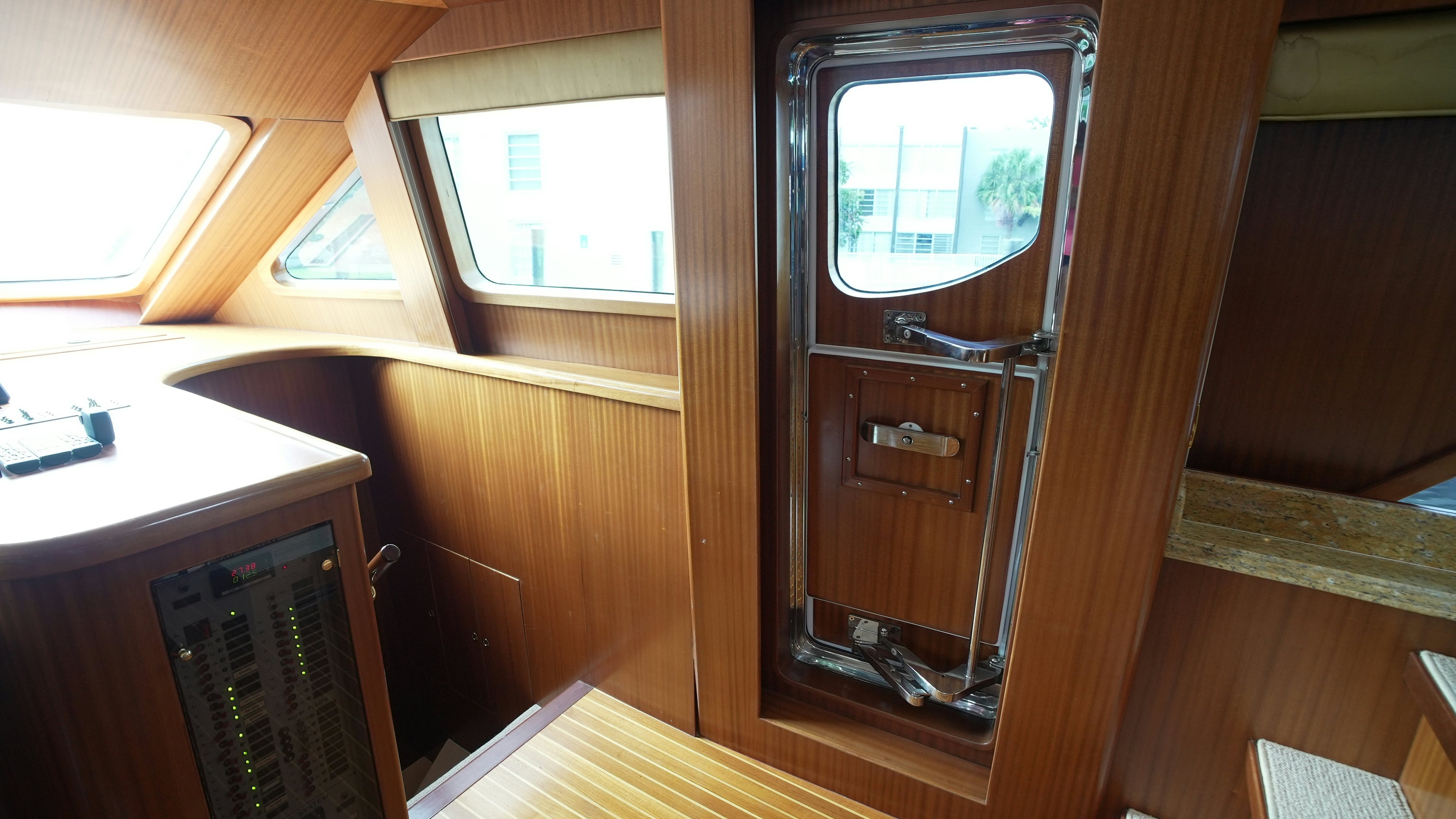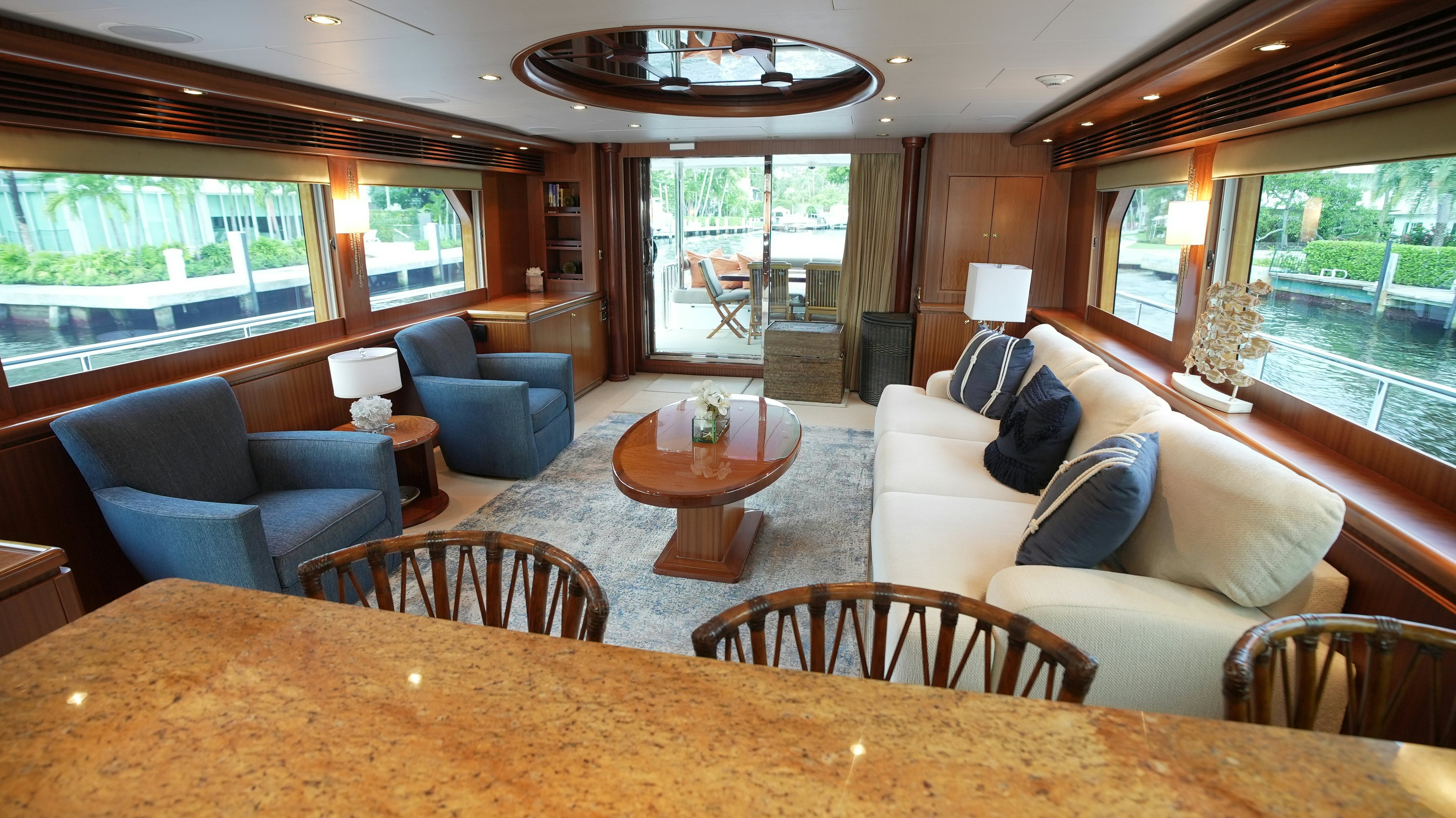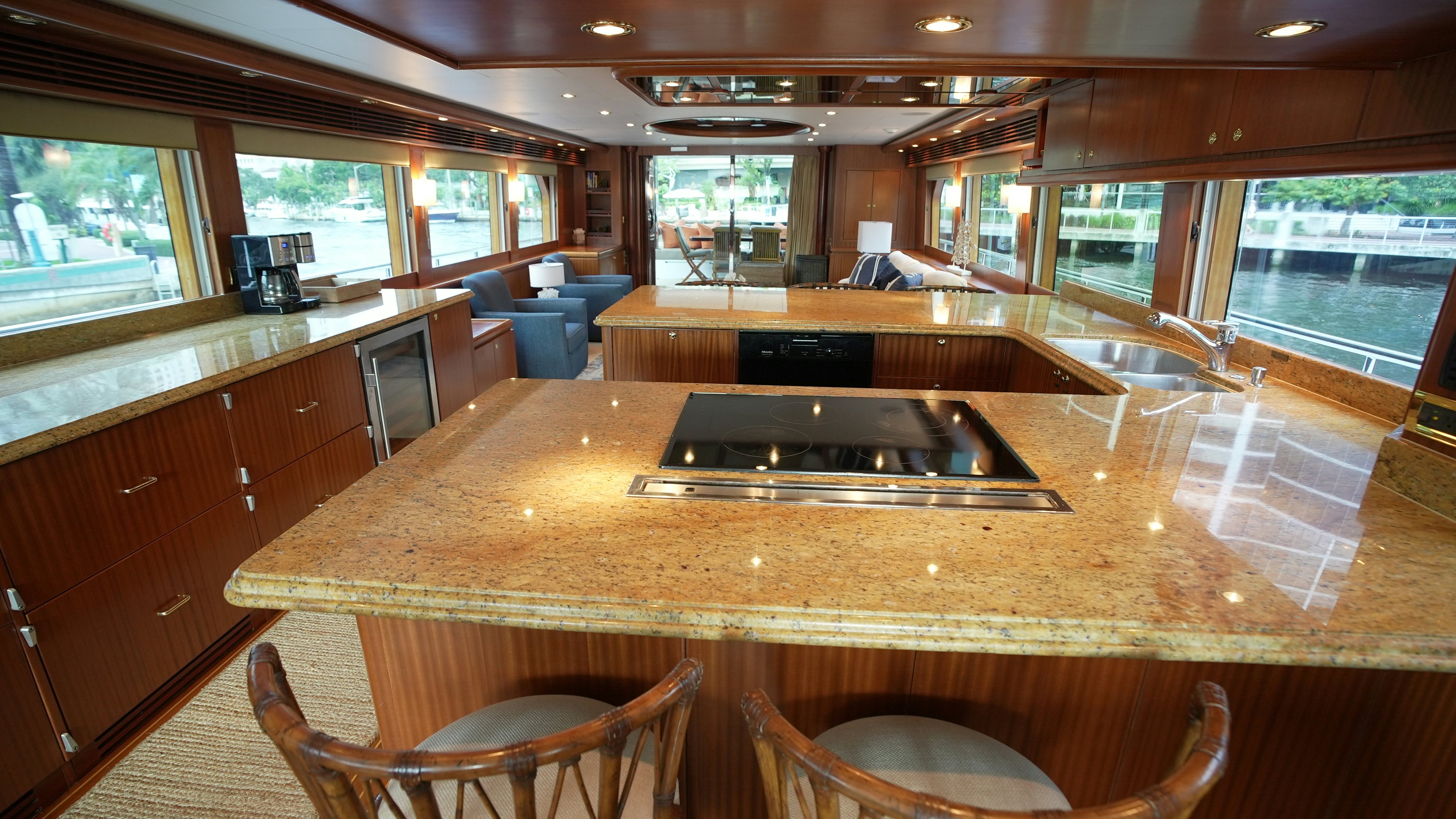 The yacht’s interior is arranged around a wide-open salon and galley configuration that maximizes space and guest interaction. The salon includes new furnishings (2022), high-gloss wood finishes, expansive side windows, and direct flow into the fully equipped galley, which features granite counters, Sub-Zero refrigeration, and a wine cooler. Teak and holly flooring and Sapelli cabinetry provide a durable and practical finish.