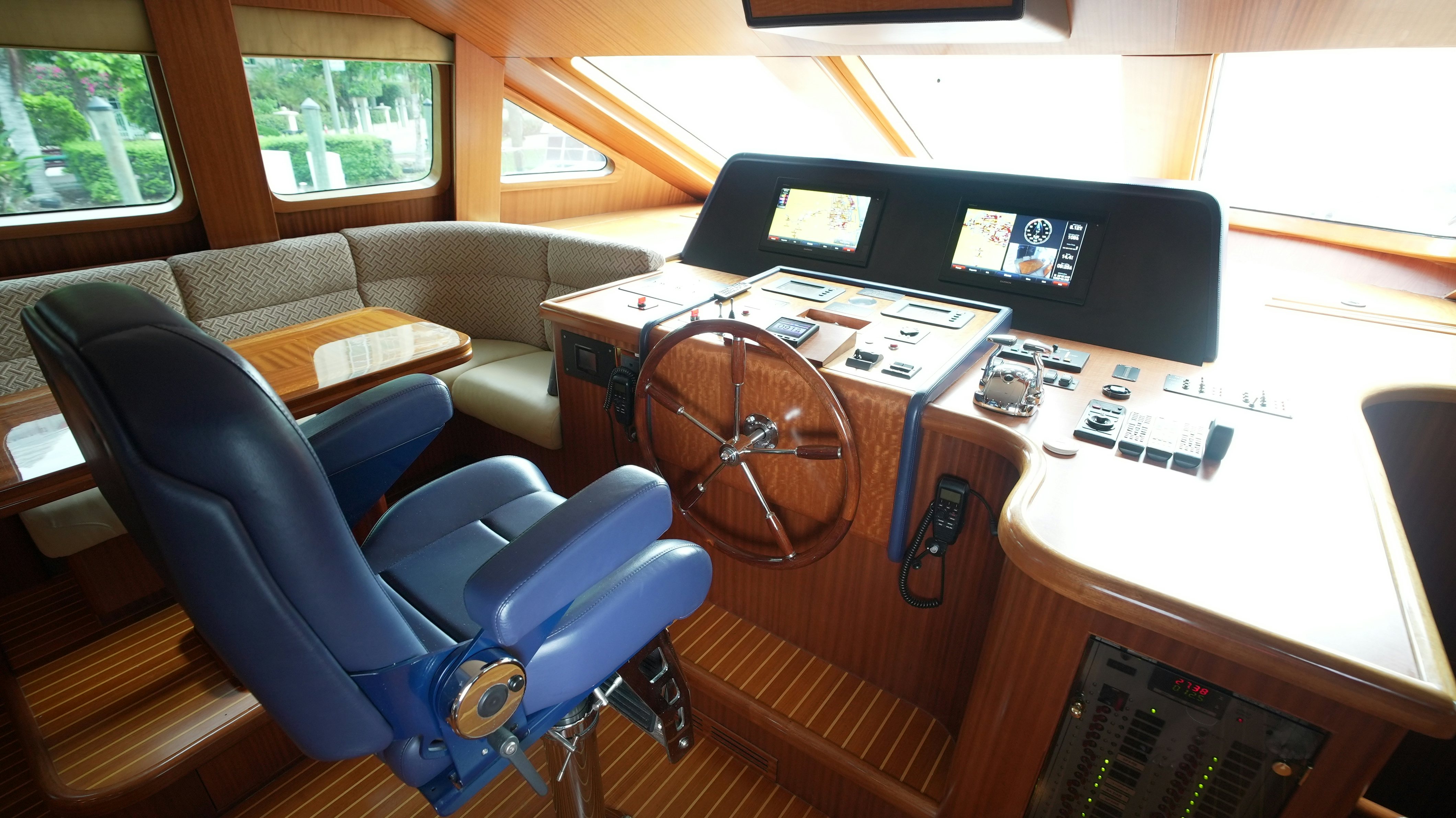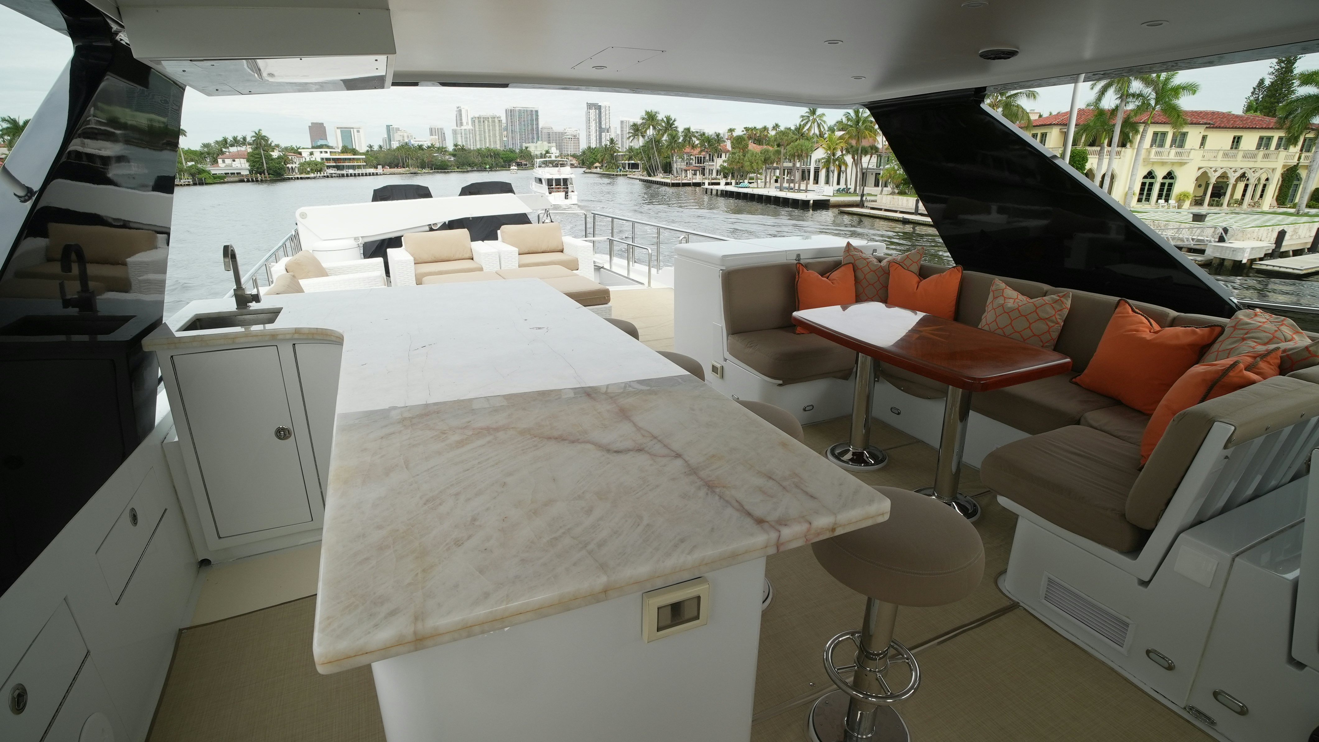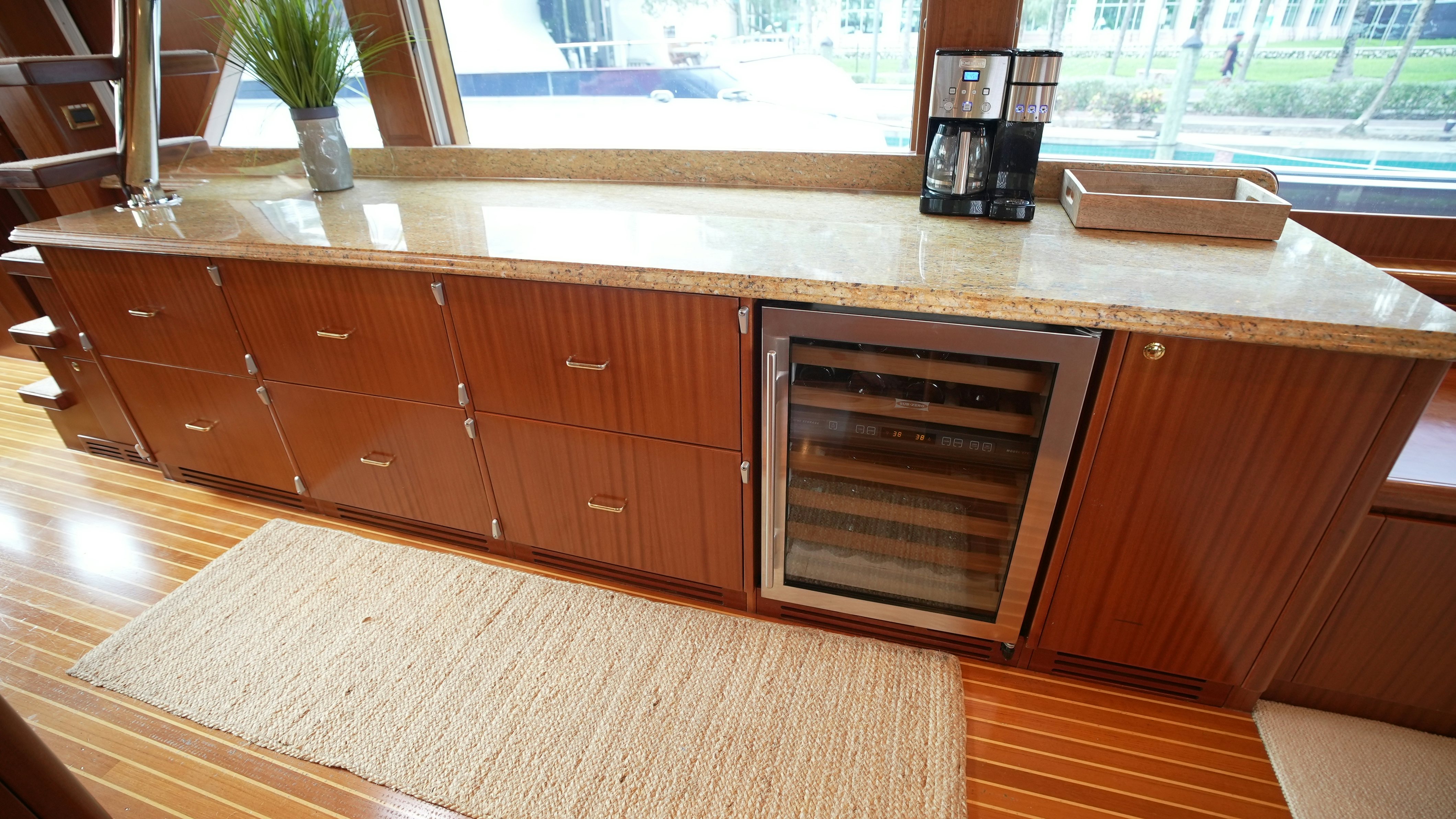 The yacht’s interior is arranged around a wide-open salon and galley configuration that maximizes space and guest interaction. The salon includes new furnishings (2022), high-gloss wood finishes, expansive side windows, and direct flow into the fully equipped galley, which features granite counters, Sub-Zero refrigeration, and a wine cooler. Teak and holly flooring and Sapelli cabinetry provide a durable and practical finish.