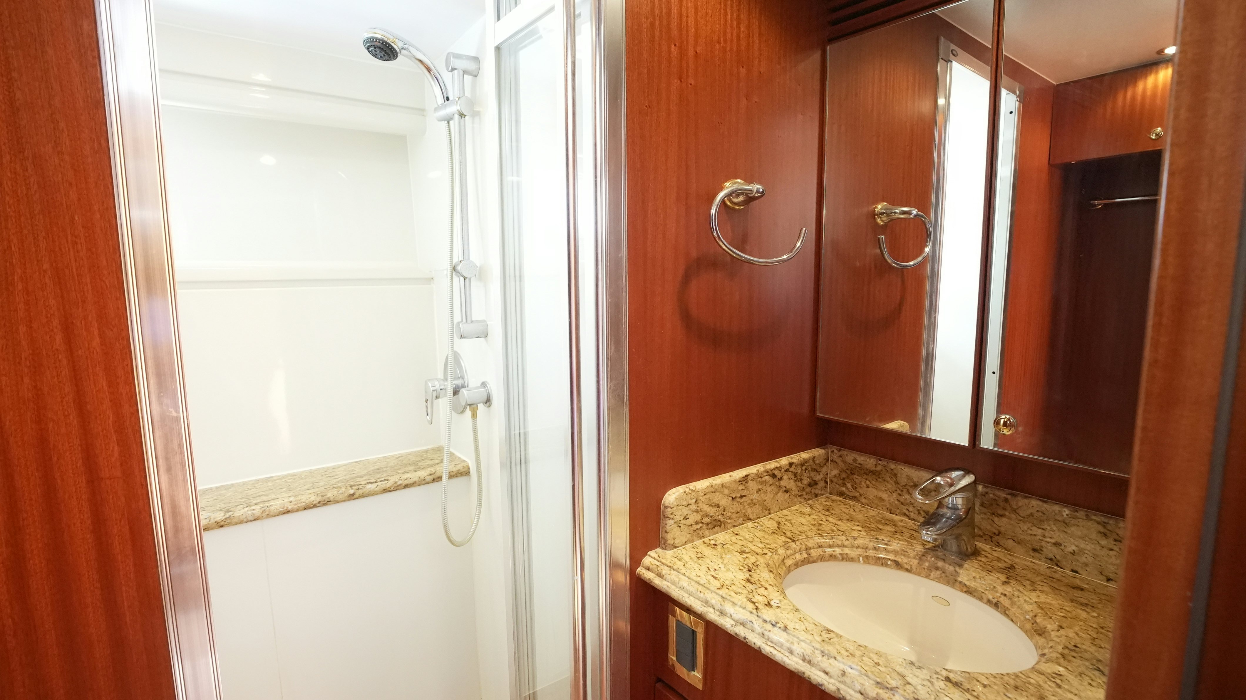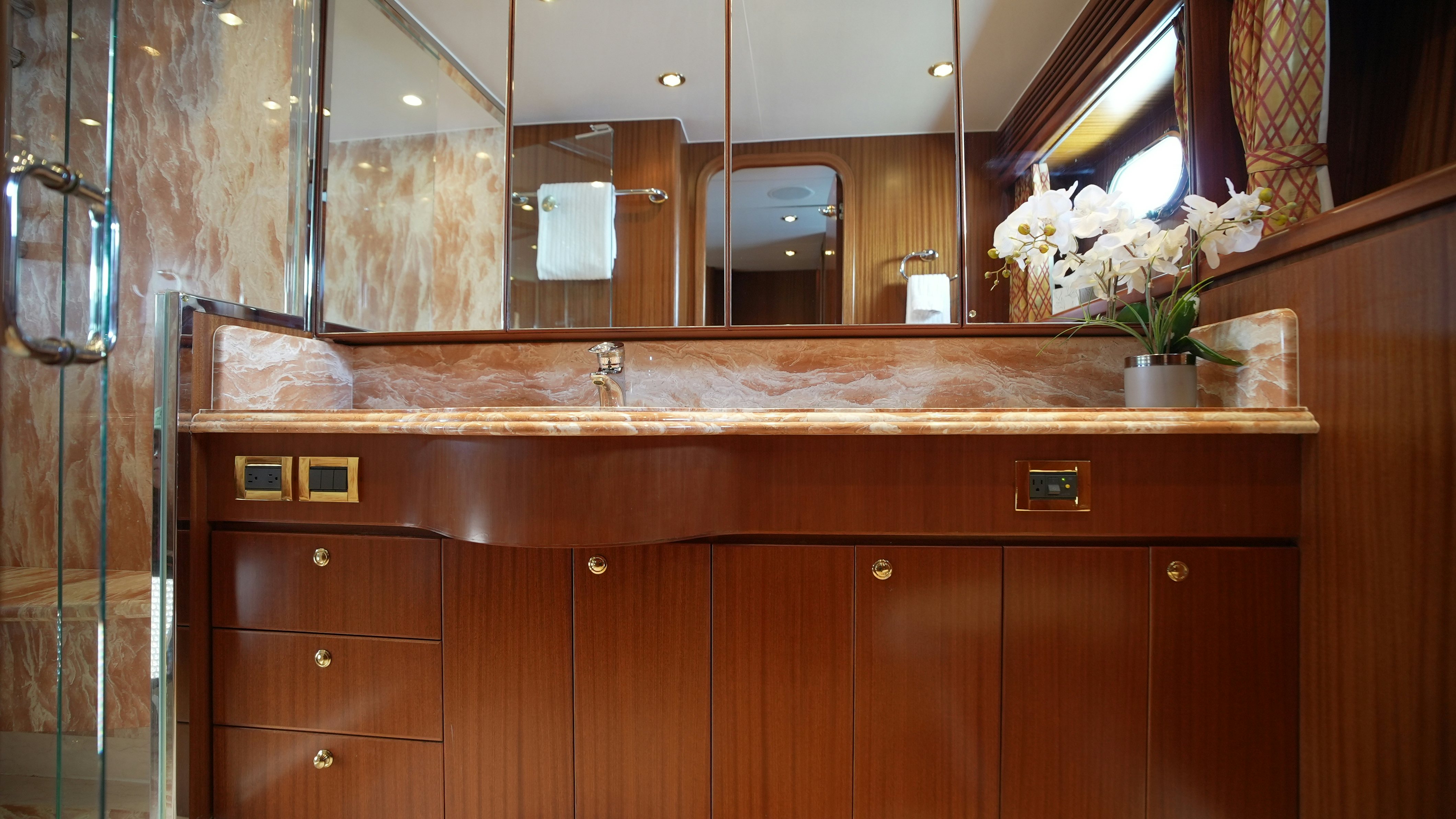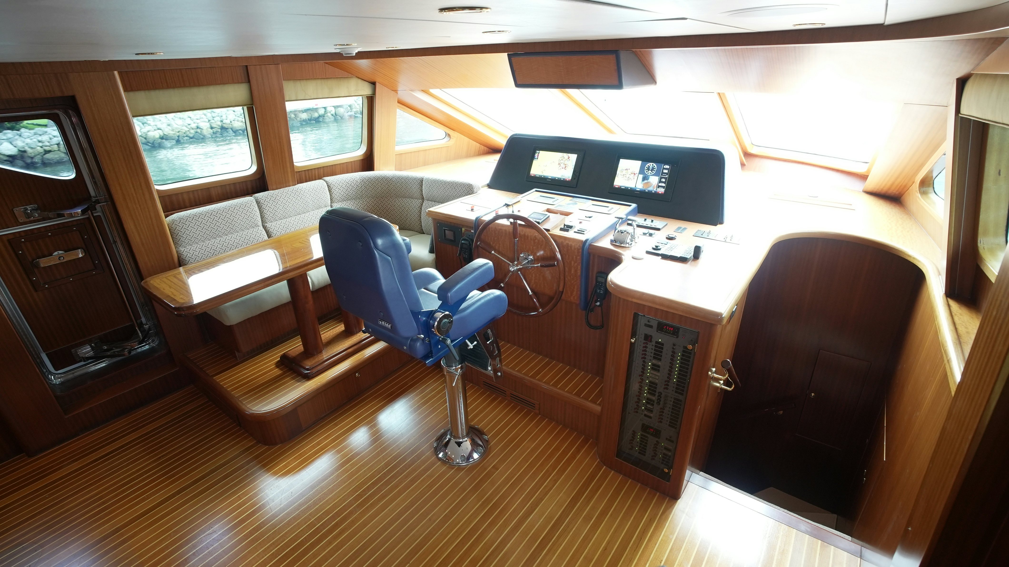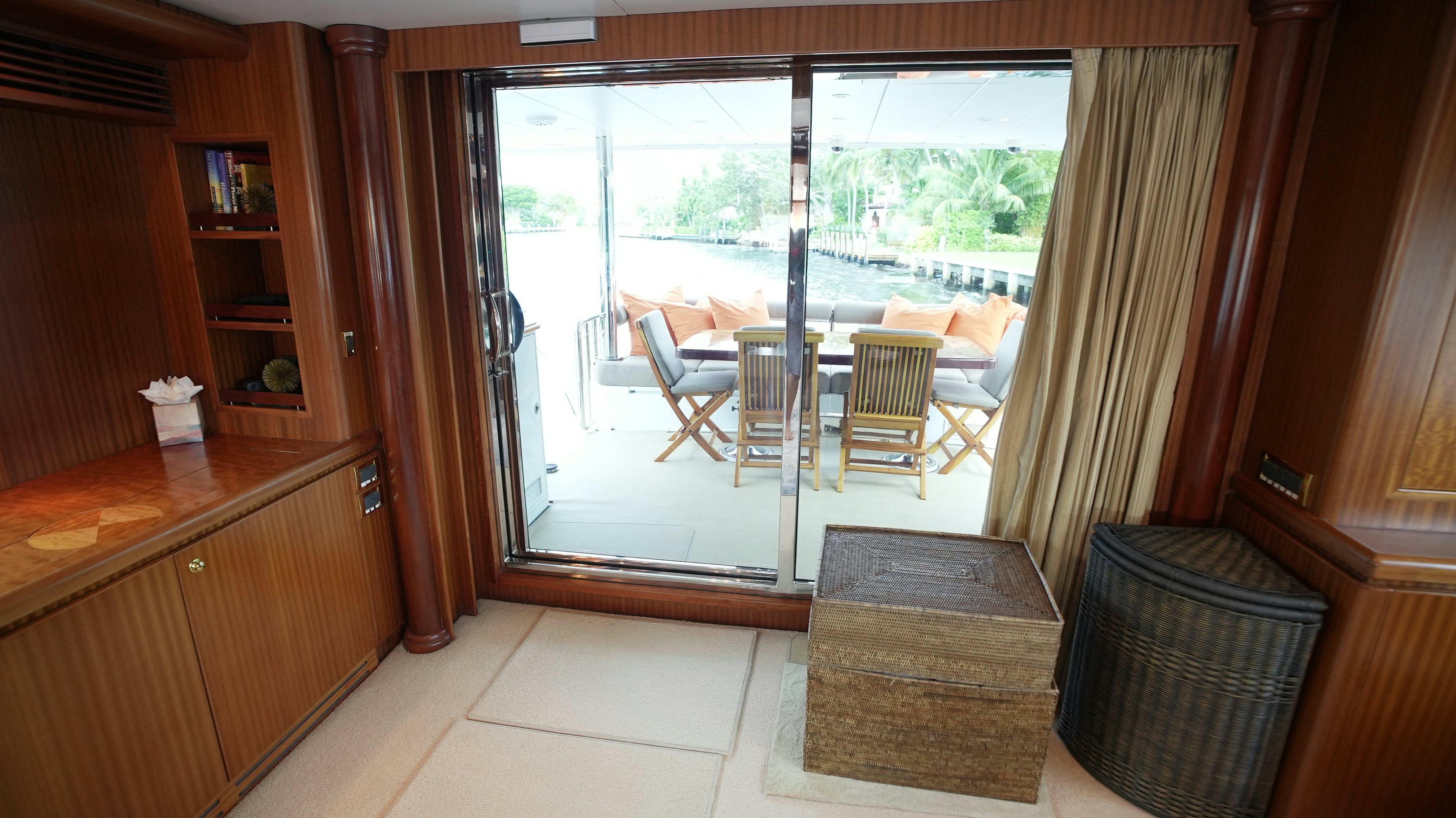 The yacht’s interior is arranged around a wide-open salon and galley configuration that maximizes space and guest interaction. The salon includes new furnishings (2022), high-gloss wood finishes, expansive side windows, and direct flow into the fully equipped galley, which features granite counters, Sub-Zero refrigeration, and a wine cooler. Teak and holly flooring and Sapelli cabinetry provide a durable and practical finish.