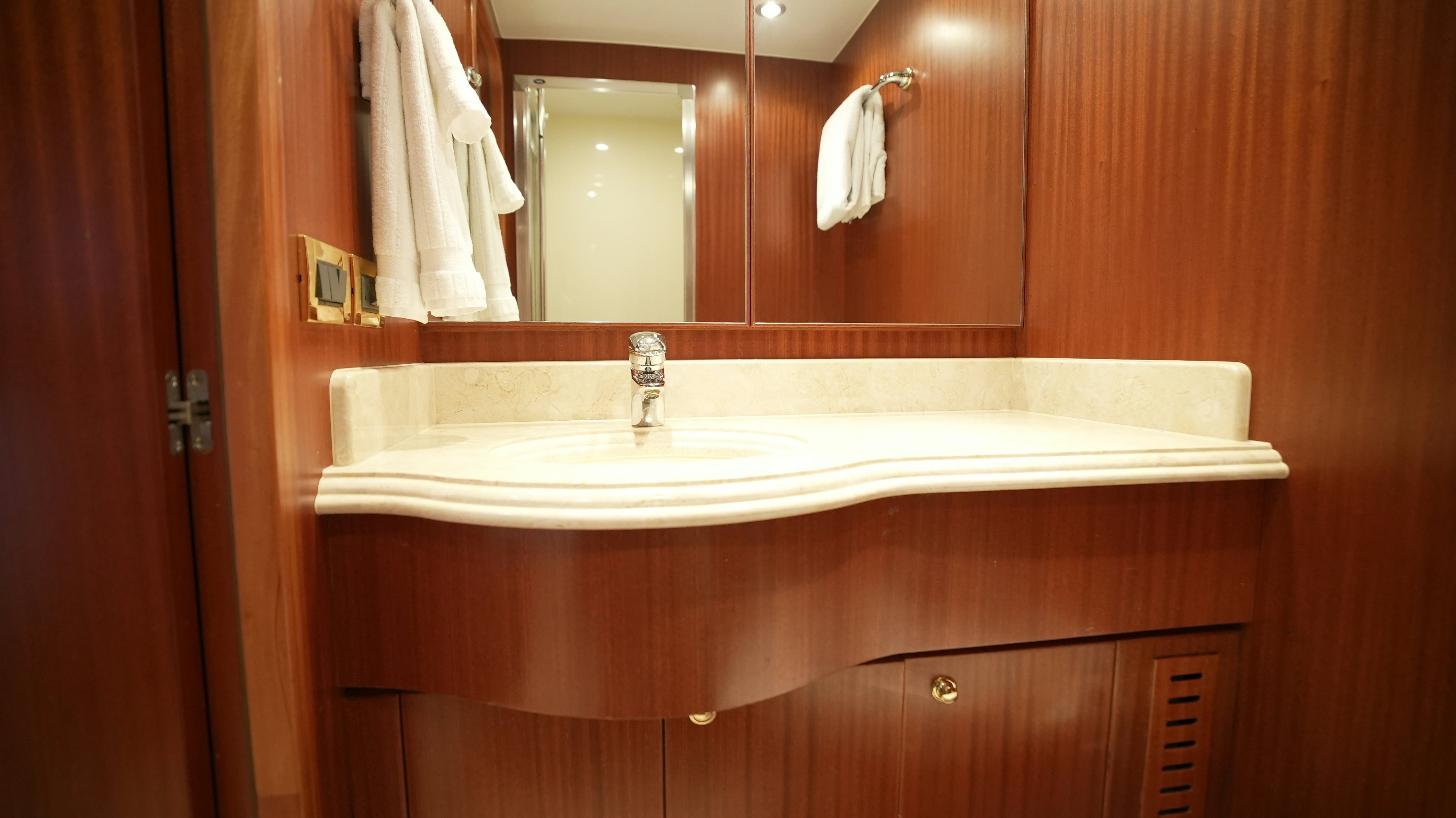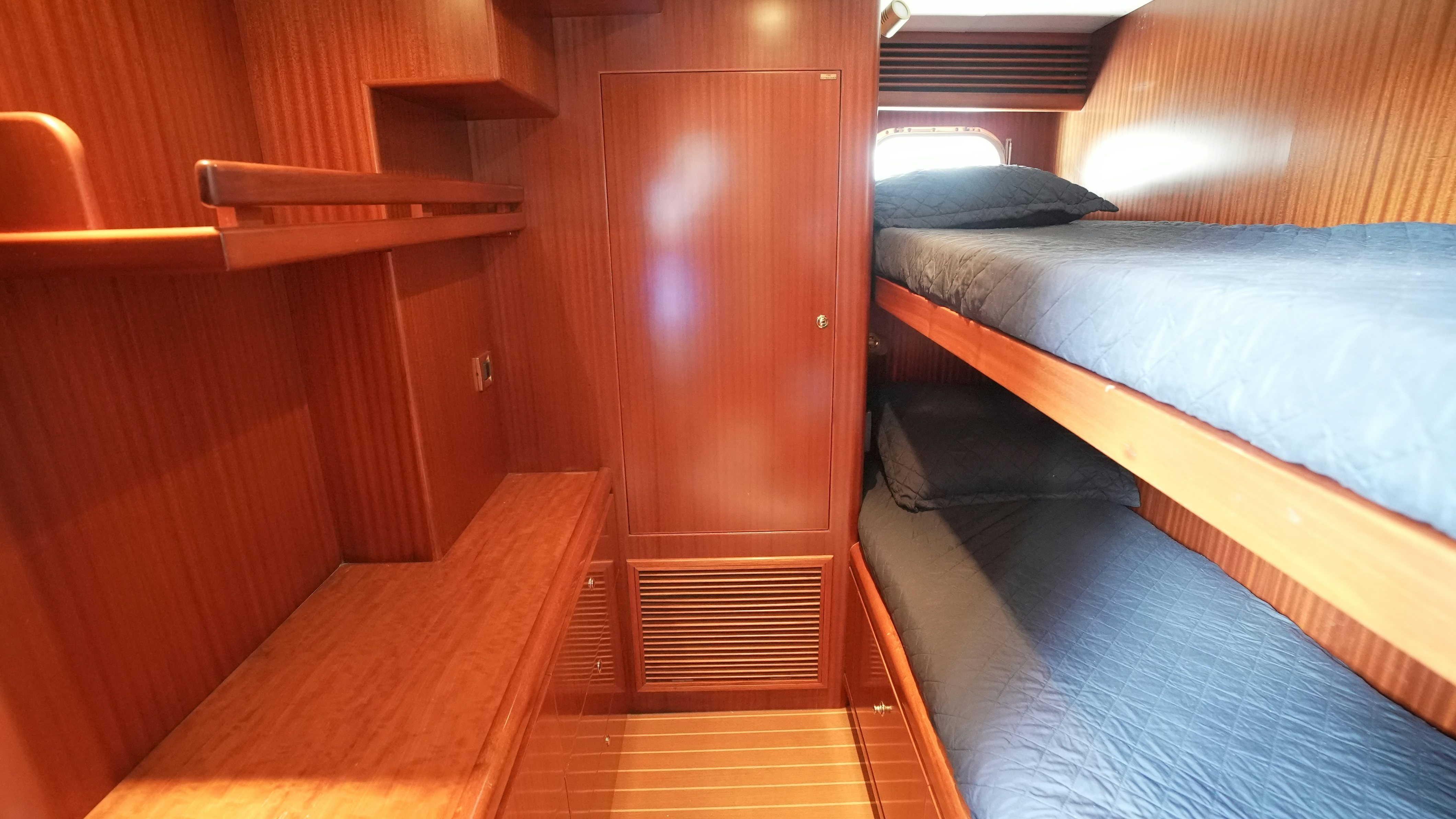 Accommodations for eight guests are arranged across four staterooms, each with en-suite baths. The full-beam master features a king bed, large closets, his-and-her heads, and substantial storage. The forward VIP offers a queen berth, balanced cabinetry, and a spacious head. Two twin cabins are positioned to port and starboard; one was converted to a queen in 2019 for greater flexibility. All staterooms are fitted with upgraded smart TVs and updated carpeting (2021).