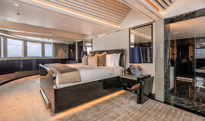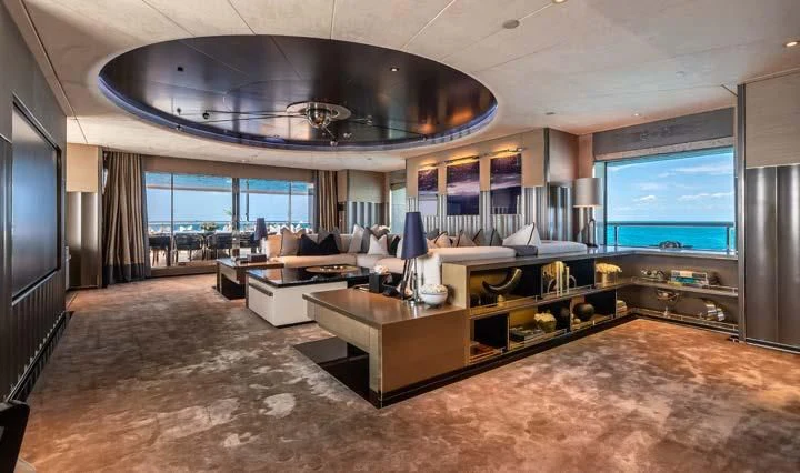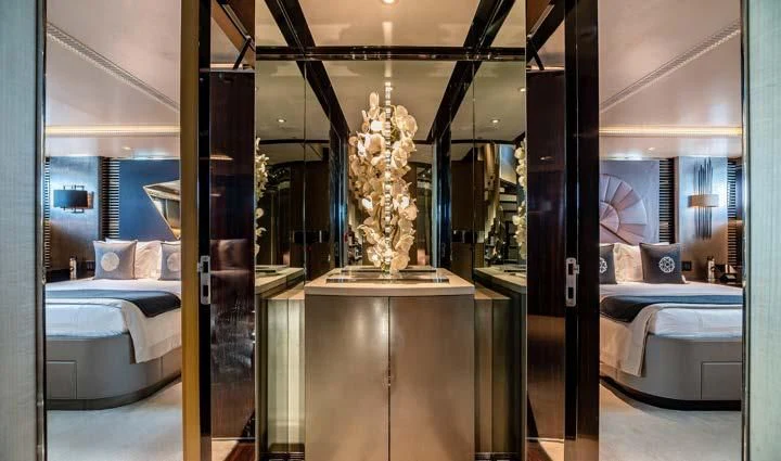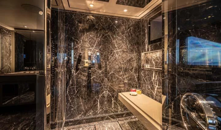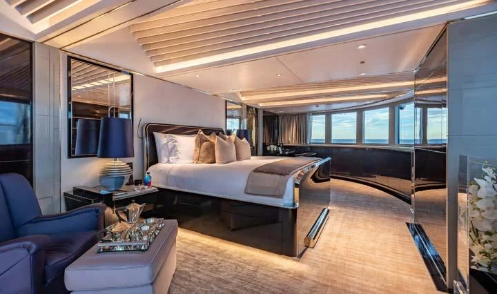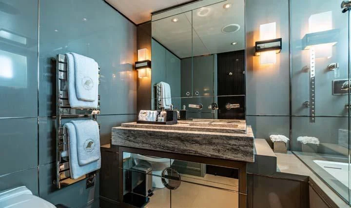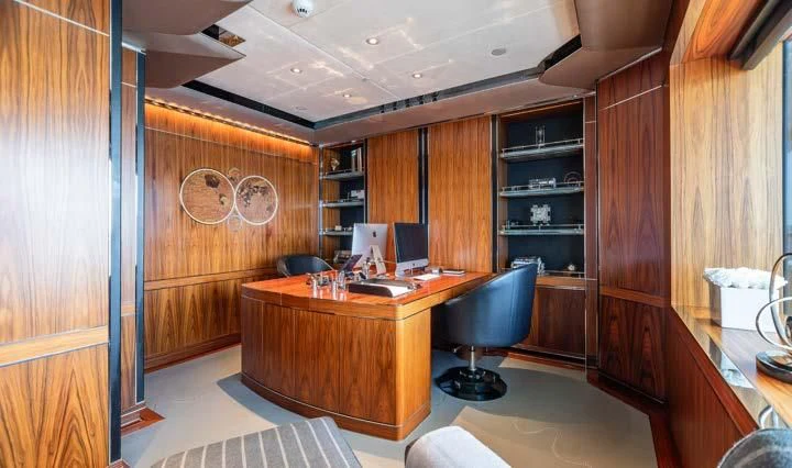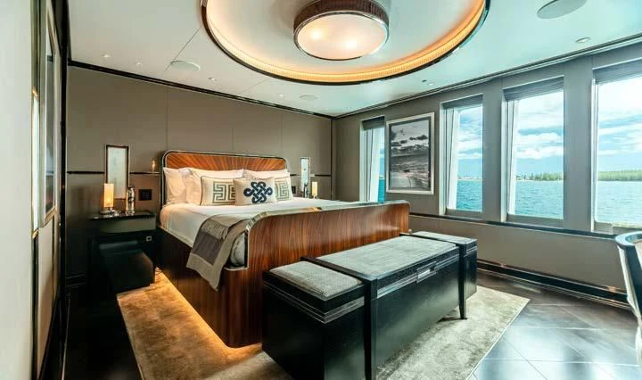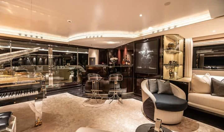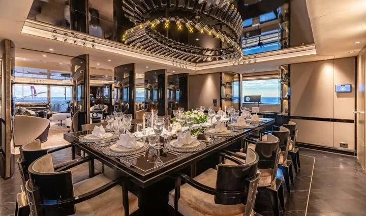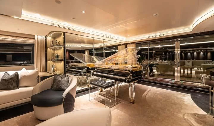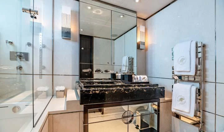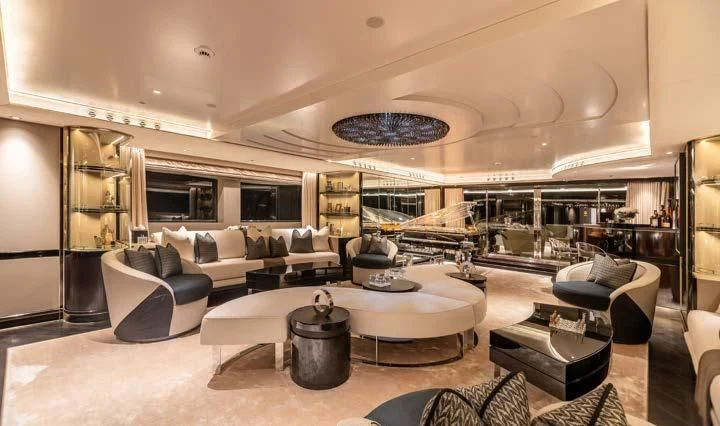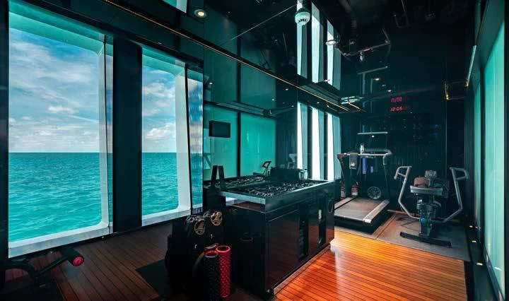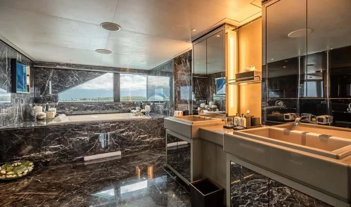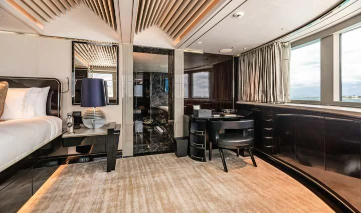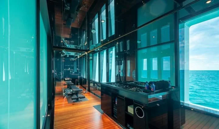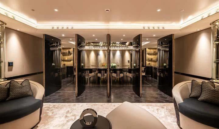 The interior spaces of SEALION are designed to provide the ultimate luxury experience for the guests on board. The interior design of the space features a striking contrast between dark elements such as Macassar ebony, black lacquer, black jet beading, and dark stained oak flooring, and lighter elements such as an off-white deck head, a silvery-white long-piled art silk carpet, and upholstery in shades of taupe and metallic silver. The warmth of the leather wall paneling helps to balance out the coolness of the metallic tones. Almond gold and Perspex are also used as accents throughout, with almond gold plating on the many fittings and dividing strips and Perspex on the Schimmel Grand Piano by the aft deck doors. The main salon and dining area are sophisticated and formal, with a beautiful combination of dark and light elements that create a sense of elegance and refinement. The skylounge is spacious and comfortable, with ample lounge areas and a cinema room ideal for relaxation and entertainment. The gym on the main deck offers incredible views and is a great place to work out while enjoying the passing scenery.