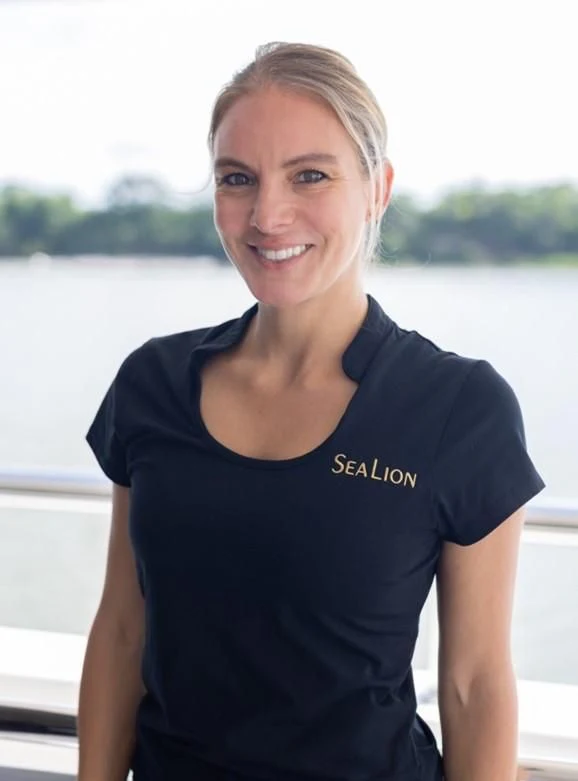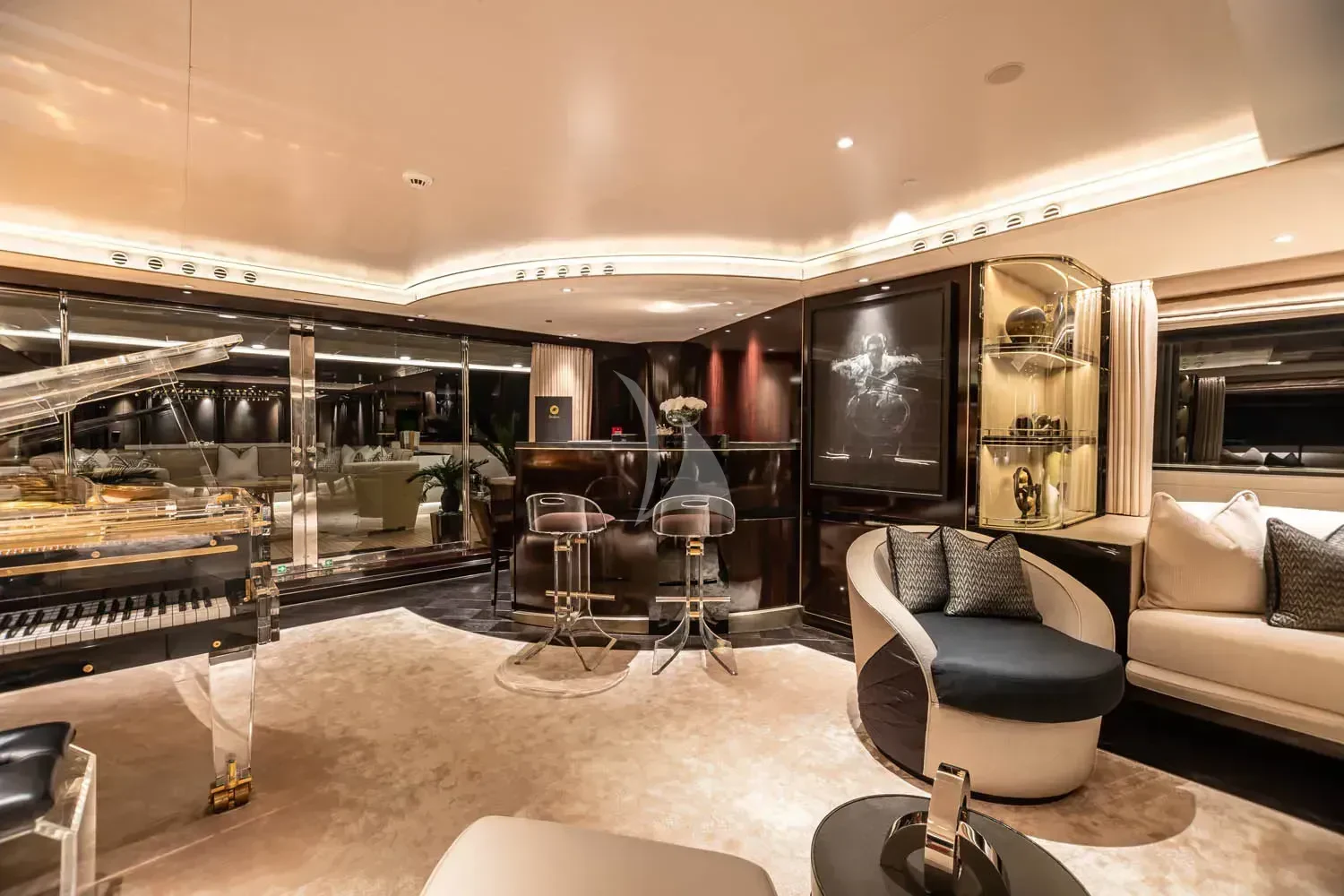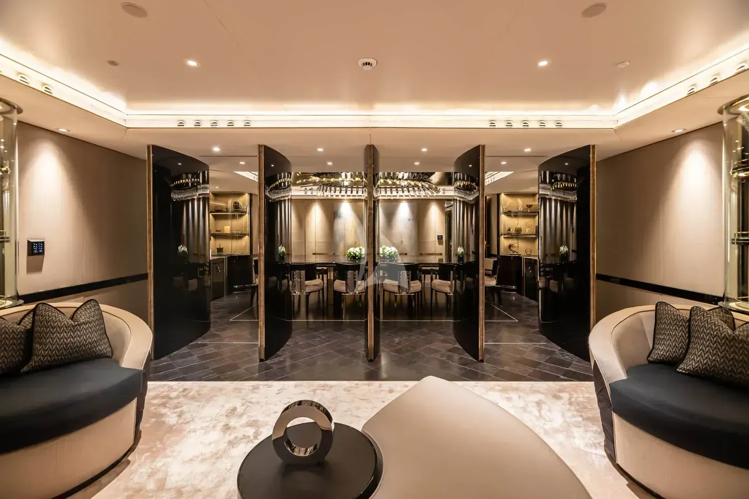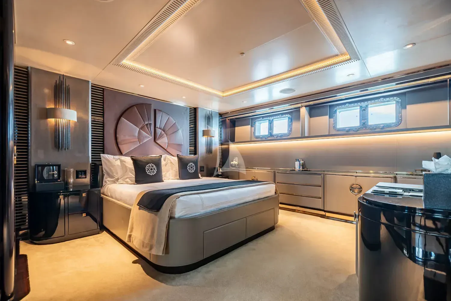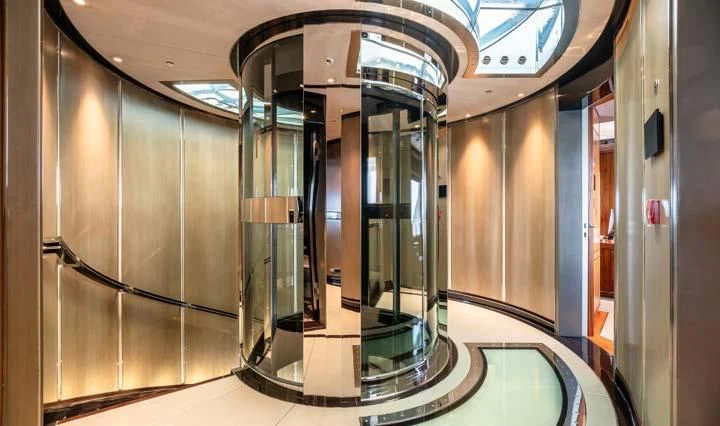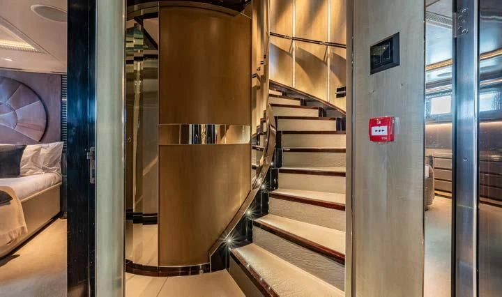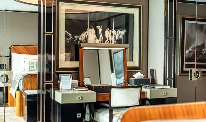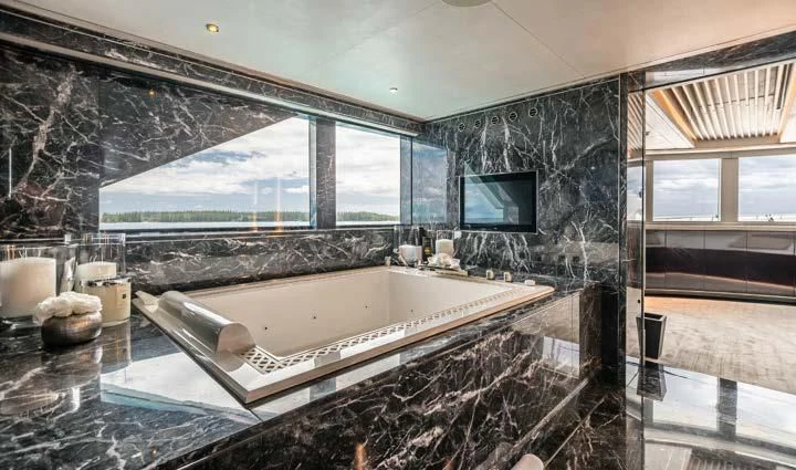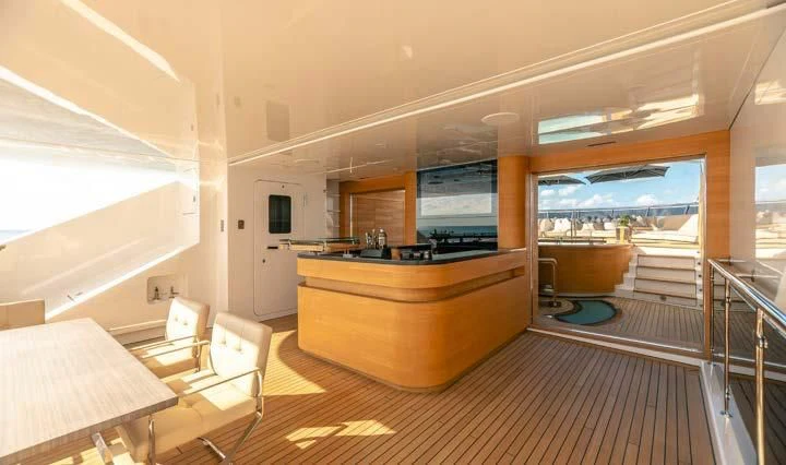 The interior spaces of SEALION are designed to provide the ultimate luxury experience for the guests on board. The interior design of the space features a striking contrast between dark elements such as Macassar ebony, black lacquer, black jet beading, and dark stained oak flooring, and lighter elements such as an off-white deck head, a silvery-white long-piled art silk carpet, and upholstery in shades of taupe and metallic silver. The warmth of the leather wall paneling helps to balance out the coolness of the metallic tones. Almond gold and Perspex are also used as accents throughout, with almond gold plating on the many fittings and dividing strips and Perspex on the Schimmel Grand Piano by the aft deck doors. The main salon and dining area are sophisticated and formal, with a beautiful combination of dark and light elements that create a sense of elegance and refinement. The skylounge is spacious and comfortable, with ample lounge areas and a cinema room ideal for relaxation and entertainment. The gym on the main deck offers incredible views and is a great place to work out while enjoying the passing scenery.