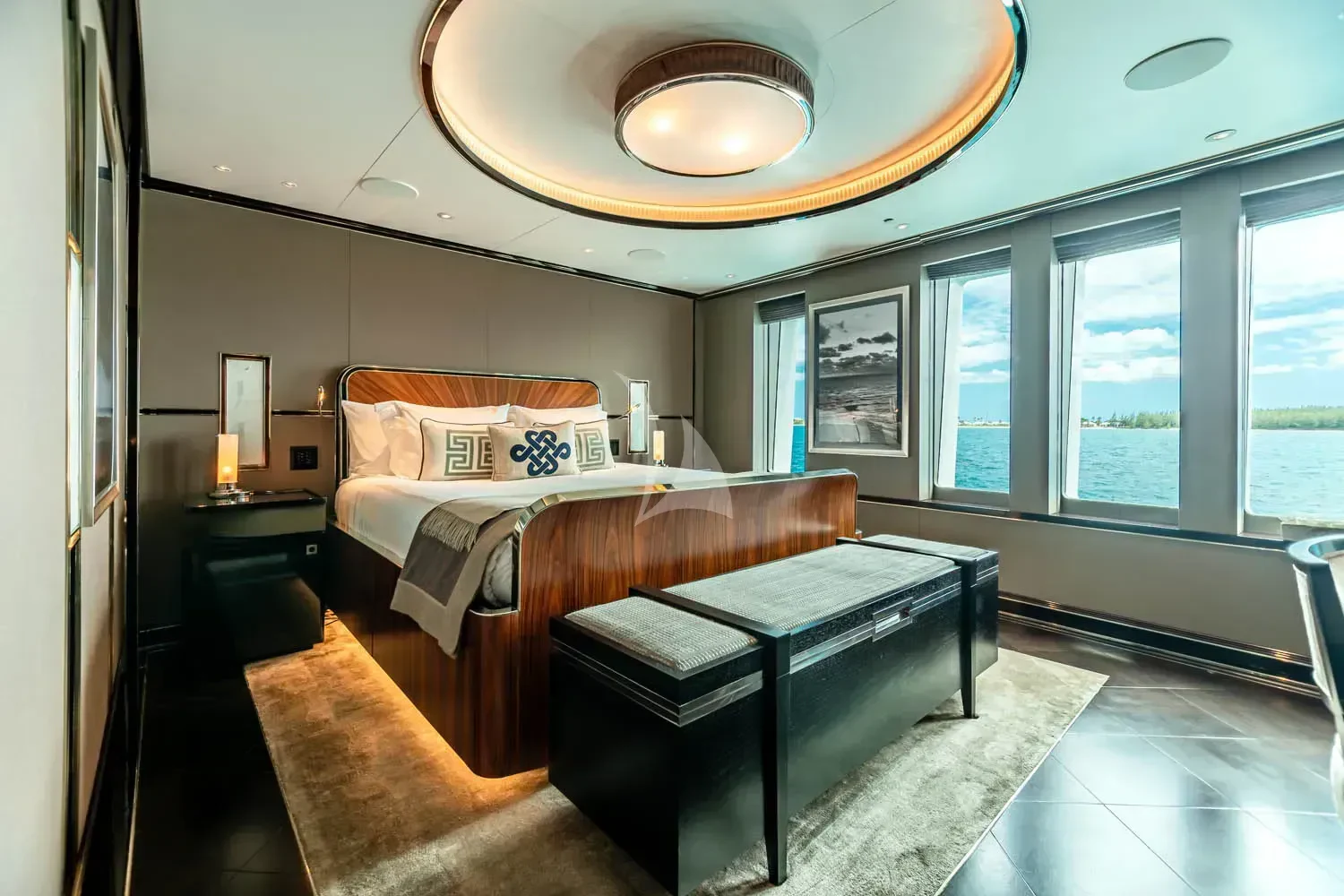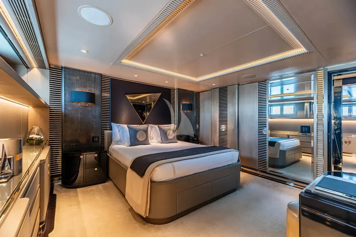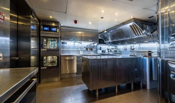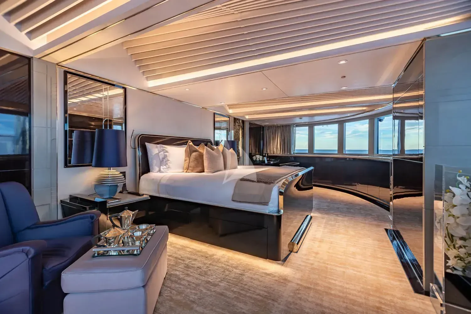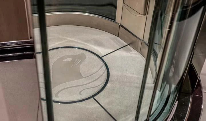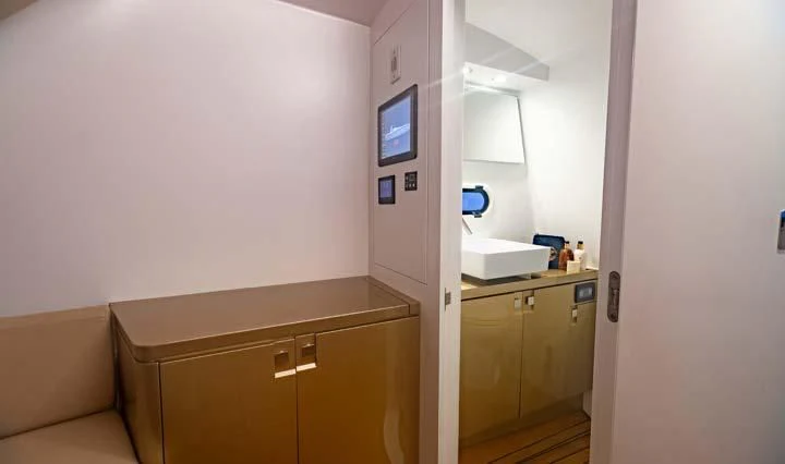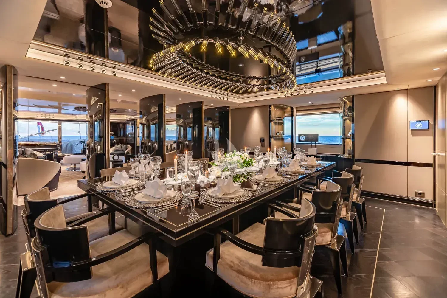 The interior spaces of SEALION are designed to provide the ultimate luxury experience for the guests on board. The interior design of the space features a striking contrast between dark elements such as Macassar ebony, black lacquer, black jet beading, and dark stained oak flooring, and lighter elements such as an off-white deck head, a silvery-white long-piled art silk carpet, and upholstery in shades of taupe and metallic silver. The warmth of the leather wall paneling helps to balance out the coolness of the metallic tones. Almond gold and Perspex are also used as accents throughout, with almond gold plating on the many fittings and dividing strips and Perspex on the Schimmel Grand Piano by the aft deck doors. The main salon and dining area are sophisticated and formal, with a beautiful combination of dark and light elements that create a sense of elegance and refinement. The skylounge is spacious and comfortable, with ample lounge areas and a cinema room ideal for relaxation and entertainment. The gym on the main deck offers incredible views and is a great place to work out while enjoying the passing scenery.