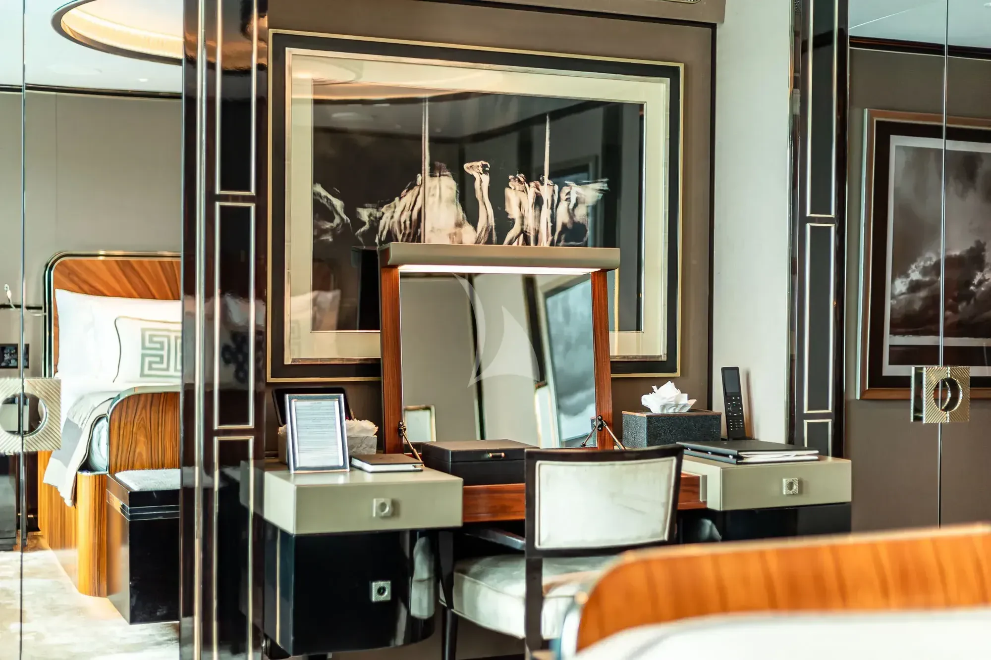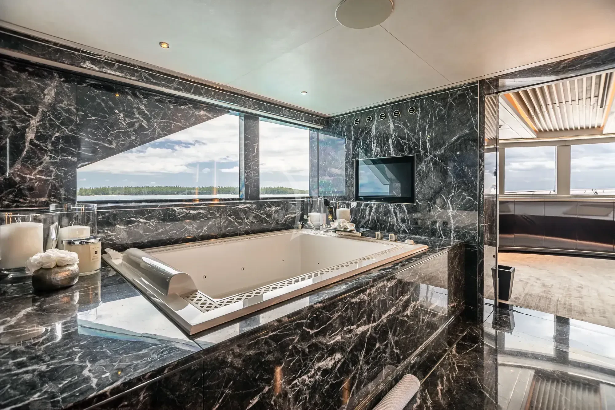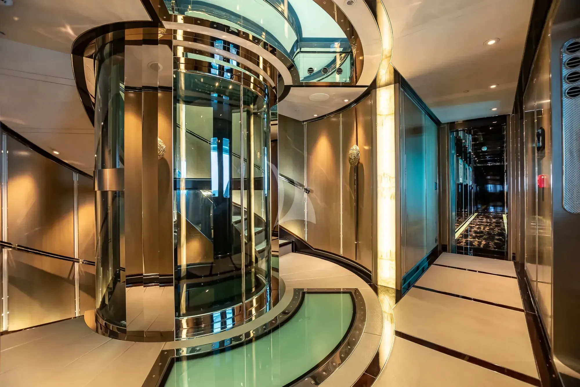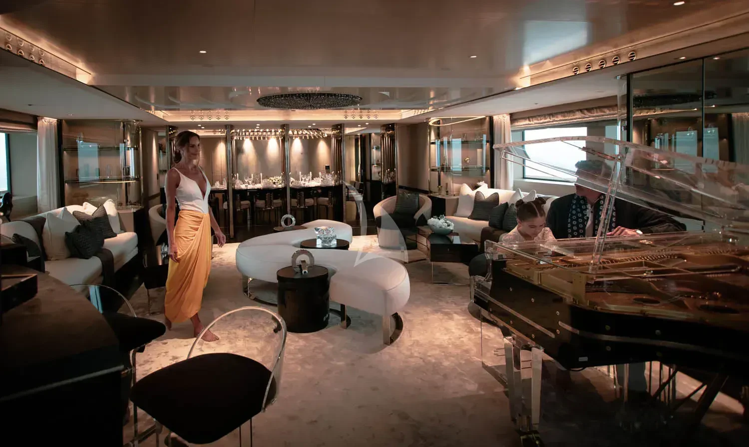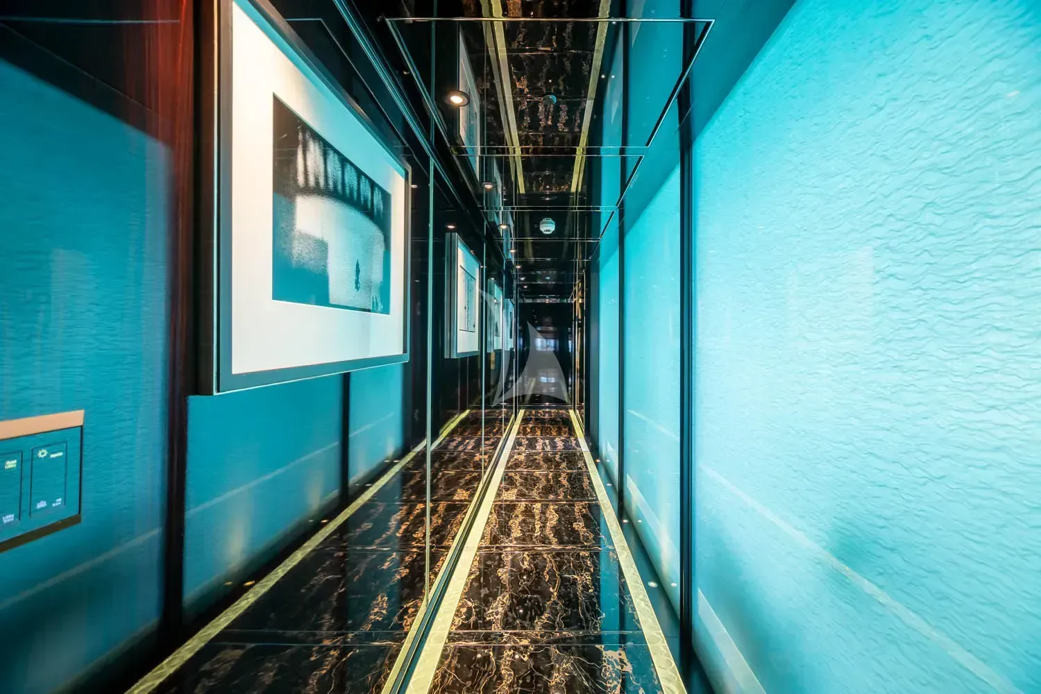 The interior spaces of SEALION are designed to provide the ultimate luxury experience for the guests on board. The interior design of the space features a striking contrast between dark elements such as Macassar ebony, black lacquer, black jet beading, and dark stained oak flooring, and lighter elements such as an off-white deck head, a silvery-white long-piled art silk carpet, and upholstery in shades of taupe and metallic silver. The warmth of the leather wall paneling helps to balance out the coolness of the metallic tones. Almond gold and Perspex are also used as accents throughout, with almond gold plating on the many fittings and dividing strips and Perspex on the Schimmel Grand Piano by the aft deck doors. The main salon and dining area are sophisticated and formal, with a beautiful combination of dark and light elements that create a sense of elegance and refinement. The skylounge is spacious and comfortable, with ample lounge areas and a cinema room ideal for relaxation and entertainment. The gym on the main deck offers incredible views and is a great place to work out while enjoying the passing scenery.