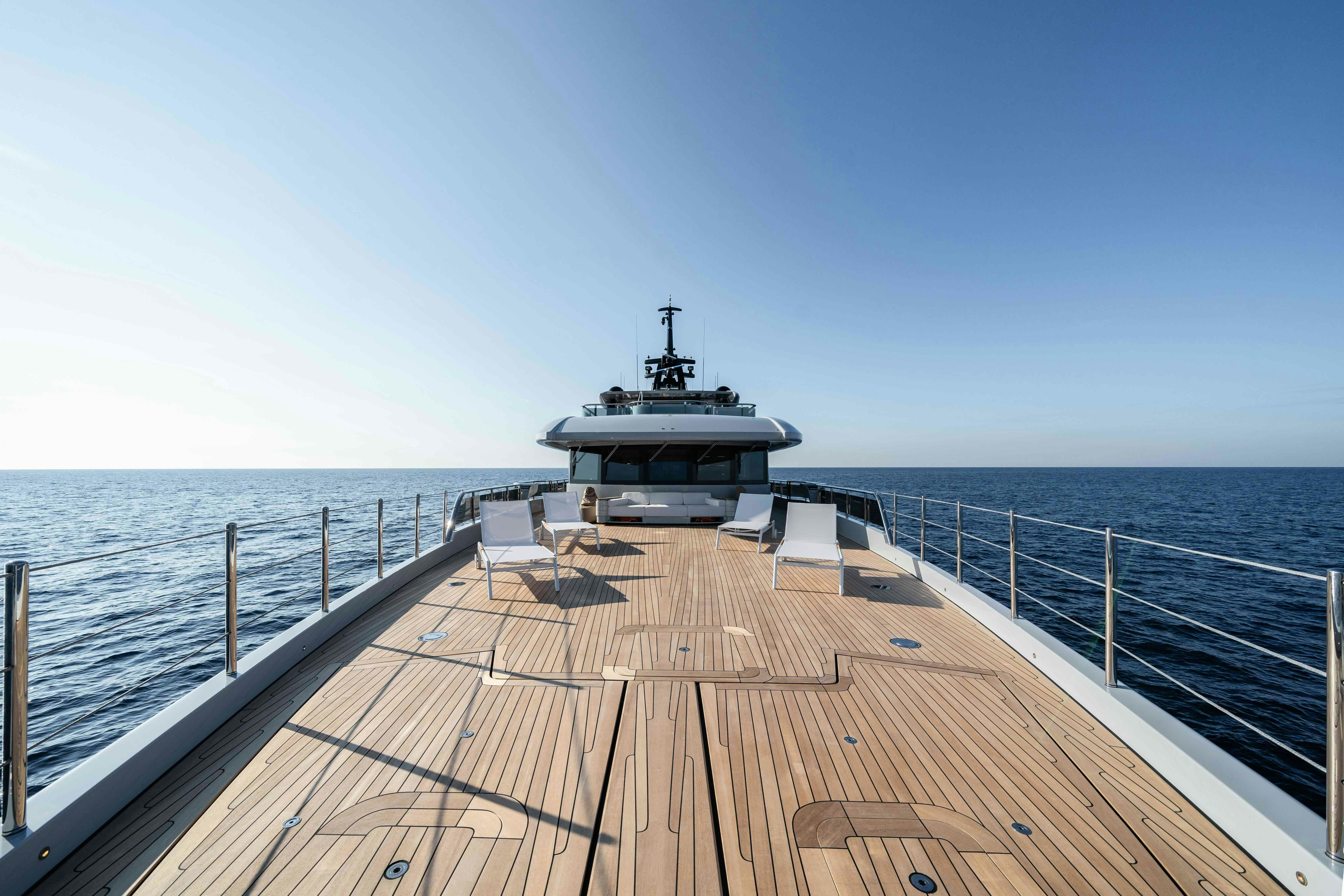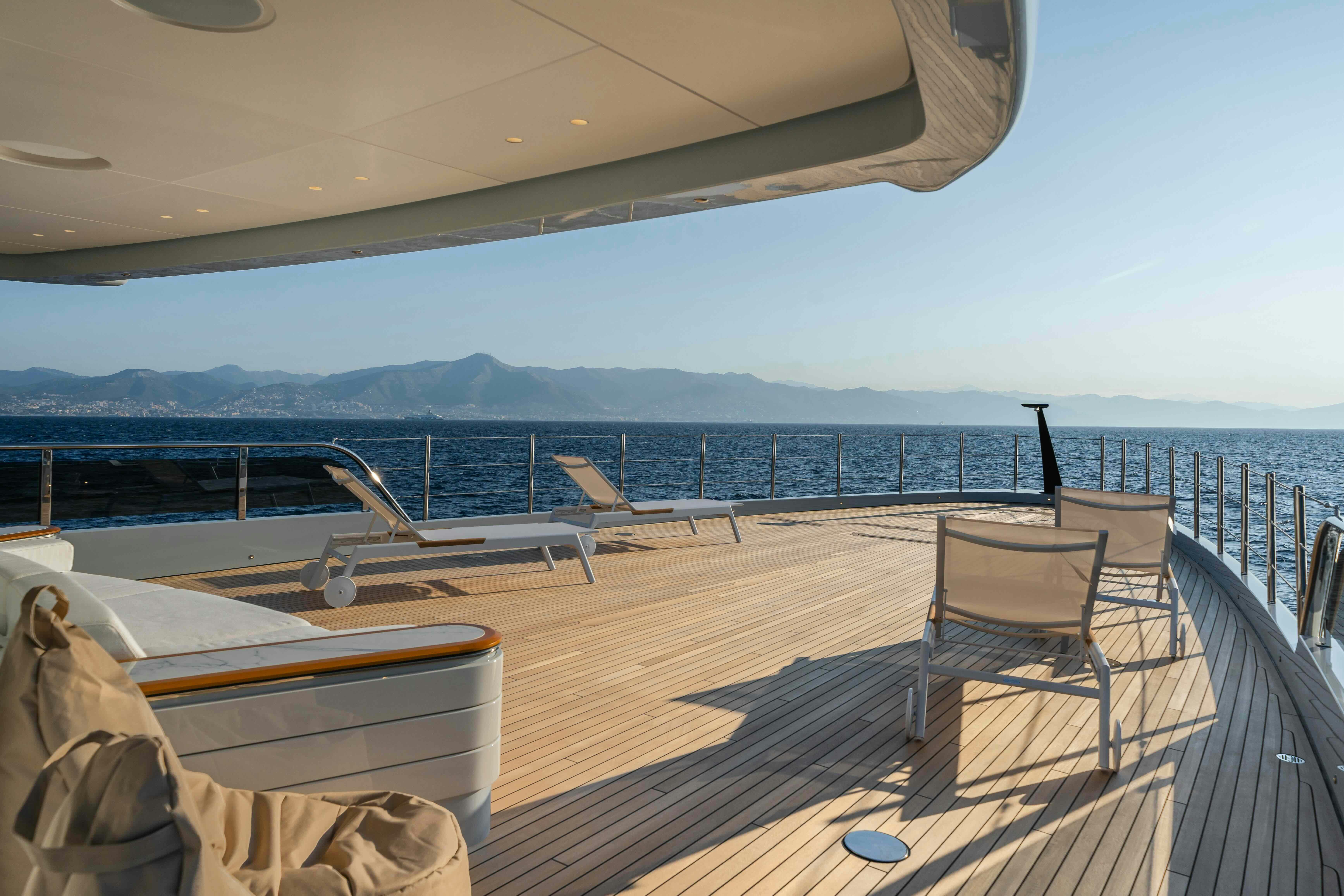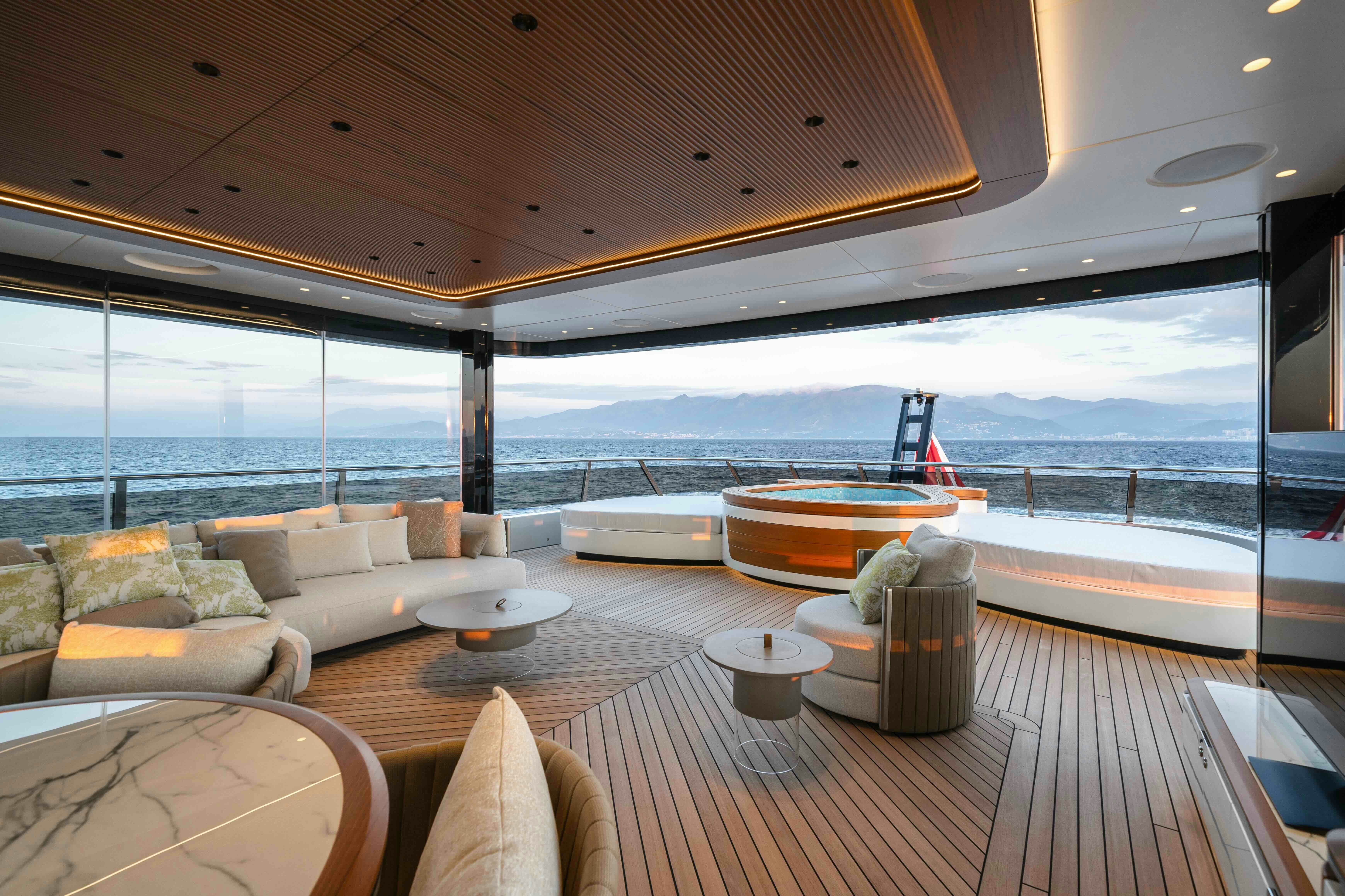 Exterior designs by Nuvolari Lenard elevate SERENISSIMA I's aesthetic appeal. The main deck aft accommodates the primary guest tender to port, with additional guest seating. The central staircase leads down to the generous swim platform and there is a secondary tender garage forward on the main deck to accommodate the rescue tender and Jet Skis. Walkaround side decks on her bridge deck lead to the flush foredeck where guests can sit back and admire unobstructed views of the horizon. Her sundeck is the primary alfresco entertainment space, boasting chic glass panels midships to split up and shelter the aft area. Forward is a large Jacuzzi flanked by sunpads and a dining table for 10 can be found under the hardtop shelter. There is a cozy firepit aft, perfect for conversations and relaxation under the stars.