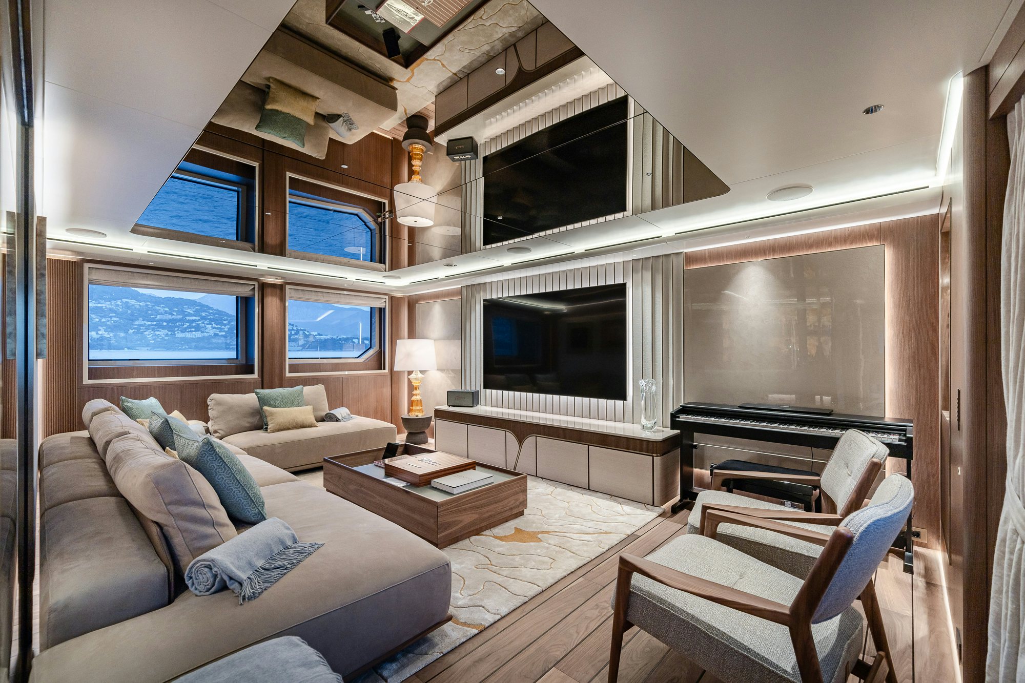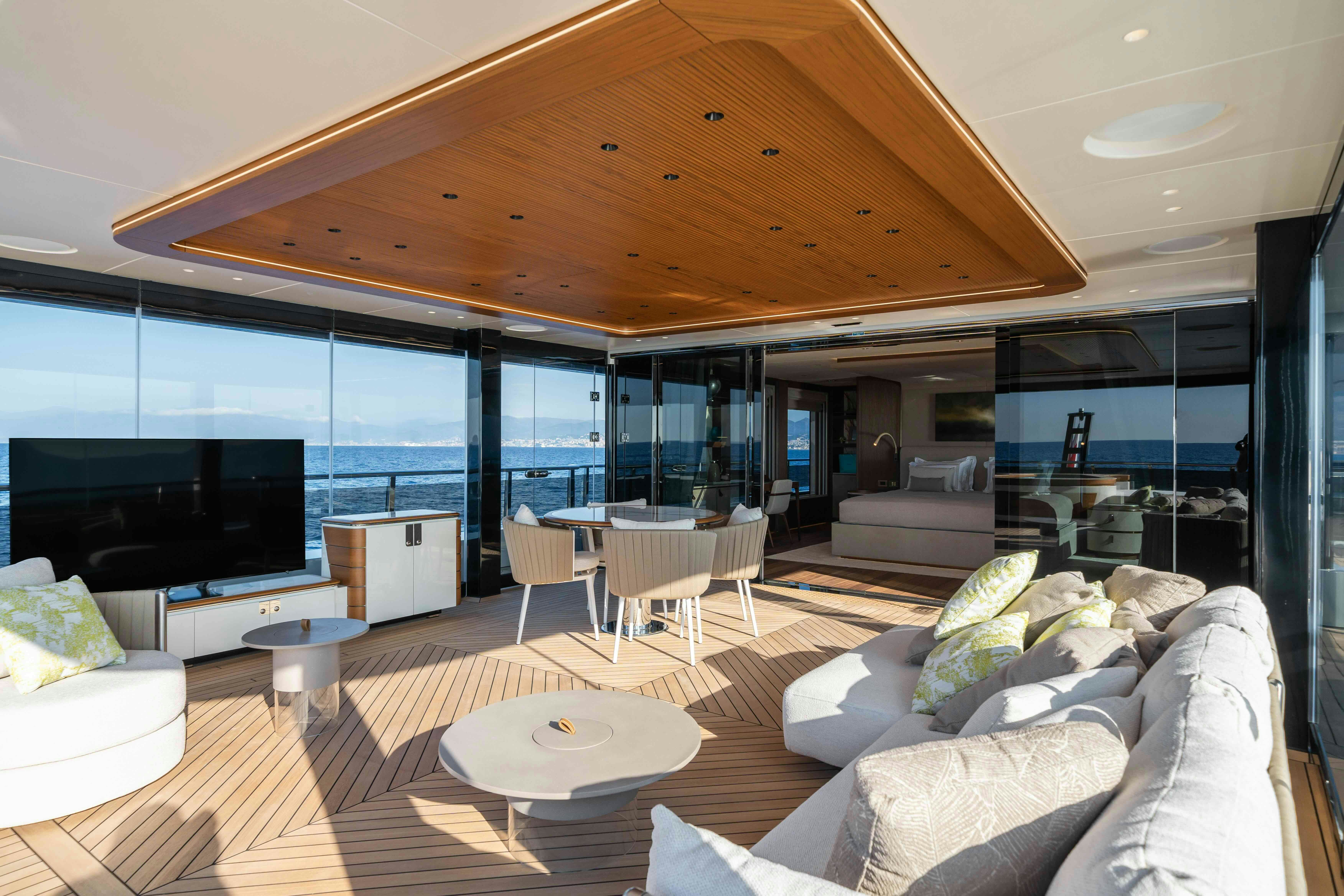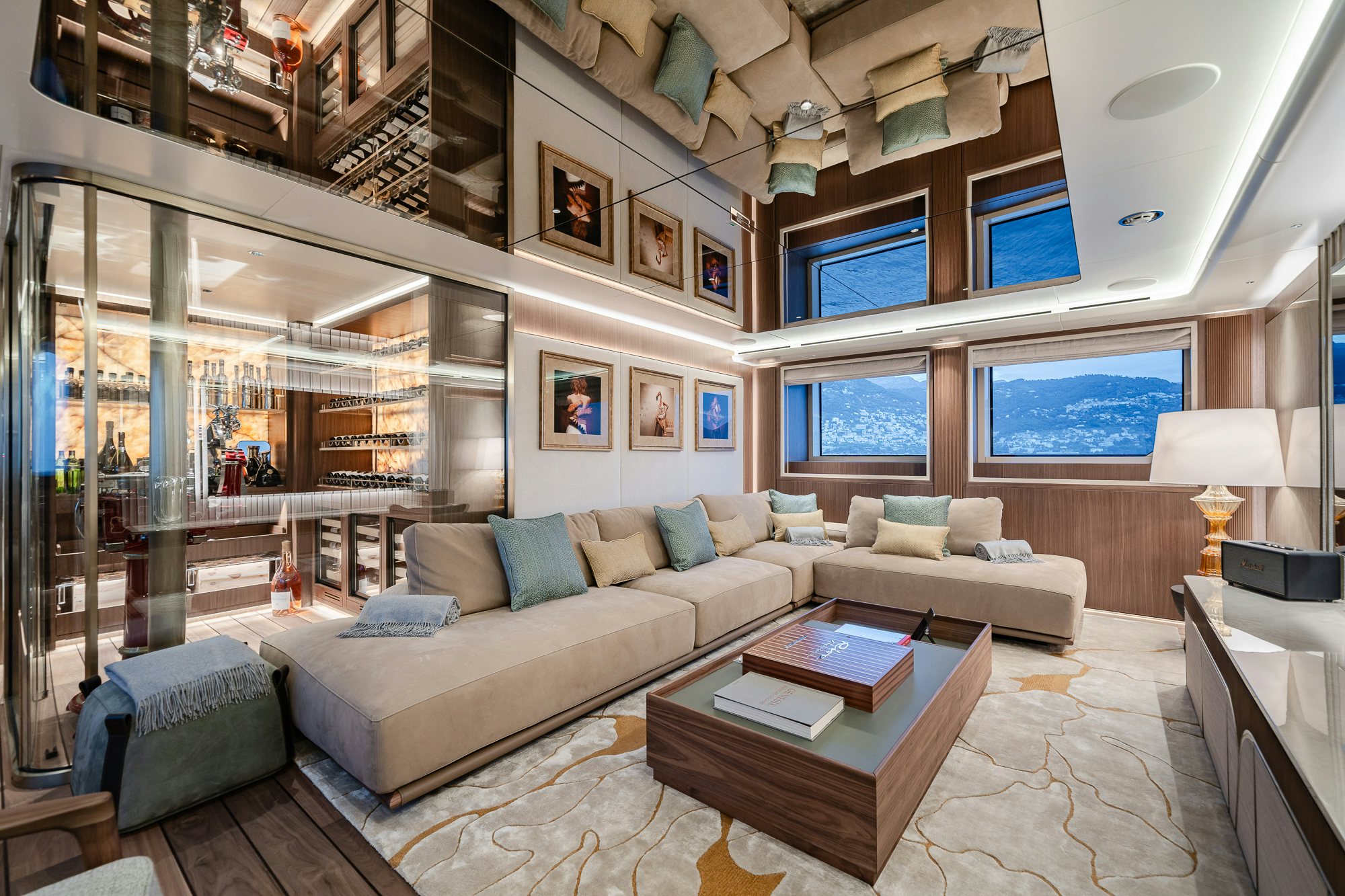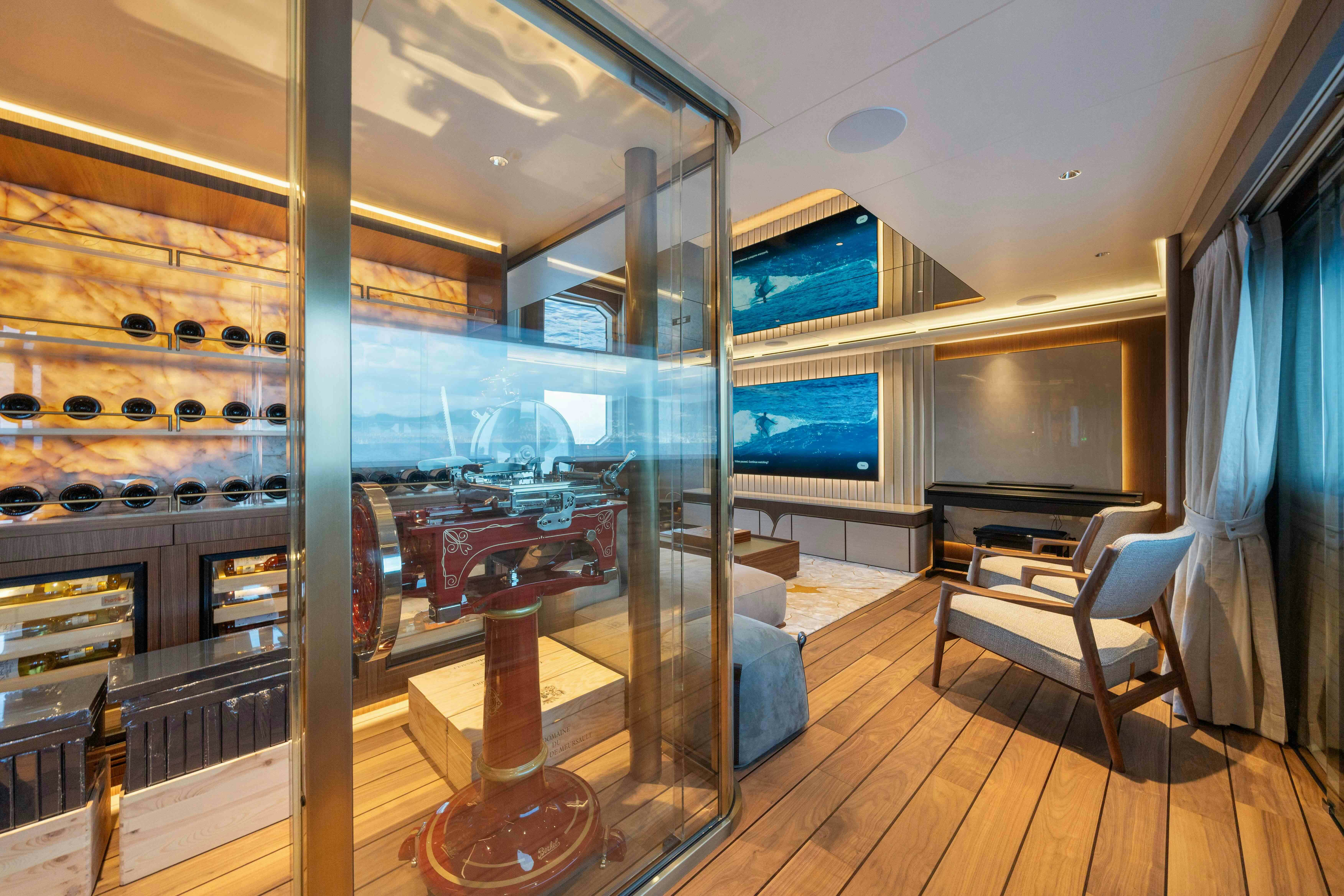 At the heart of SERENISSIMA I's design is an upper private owner’s deck, offering sweeping views and private outdoor space. Her two Jacuzzis—one nestled on the sundeck and the other situated on the owner’s deck aft—and a gentleman’s lounge with a cinema room, complemented by a drop-down balcony and walk-in wine cellar, contribute to her immersive onboard experience.