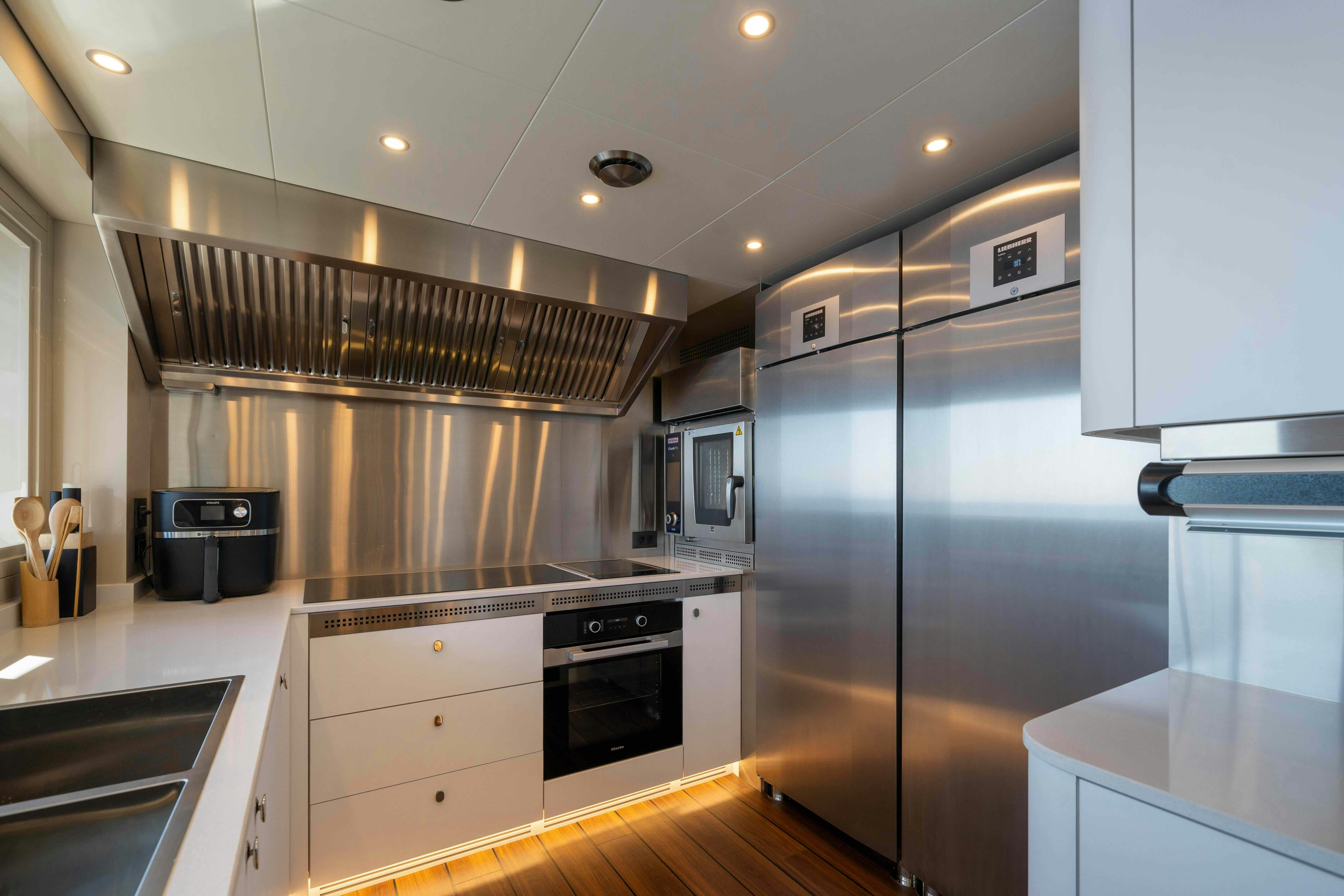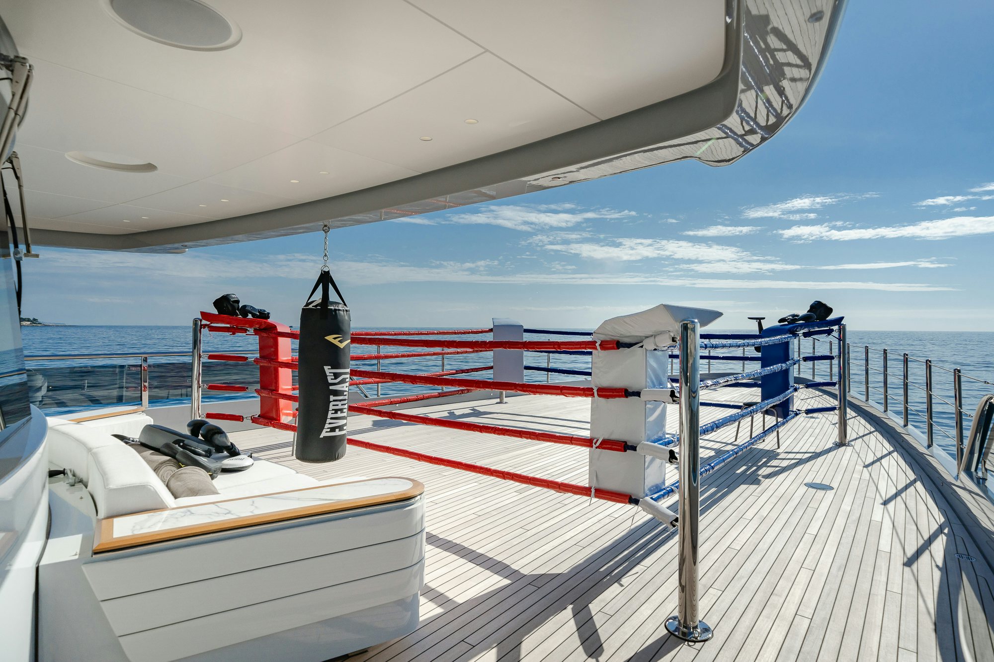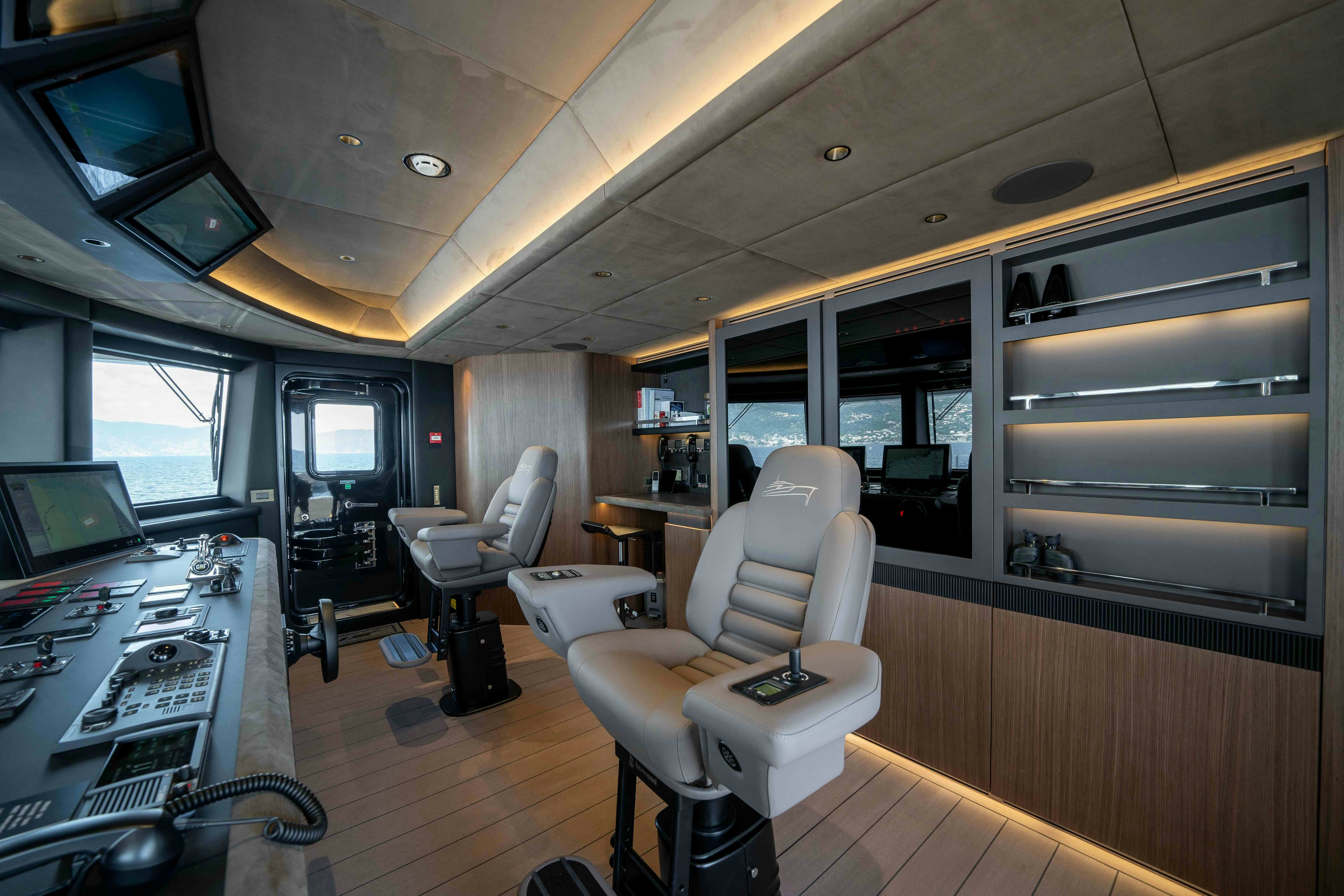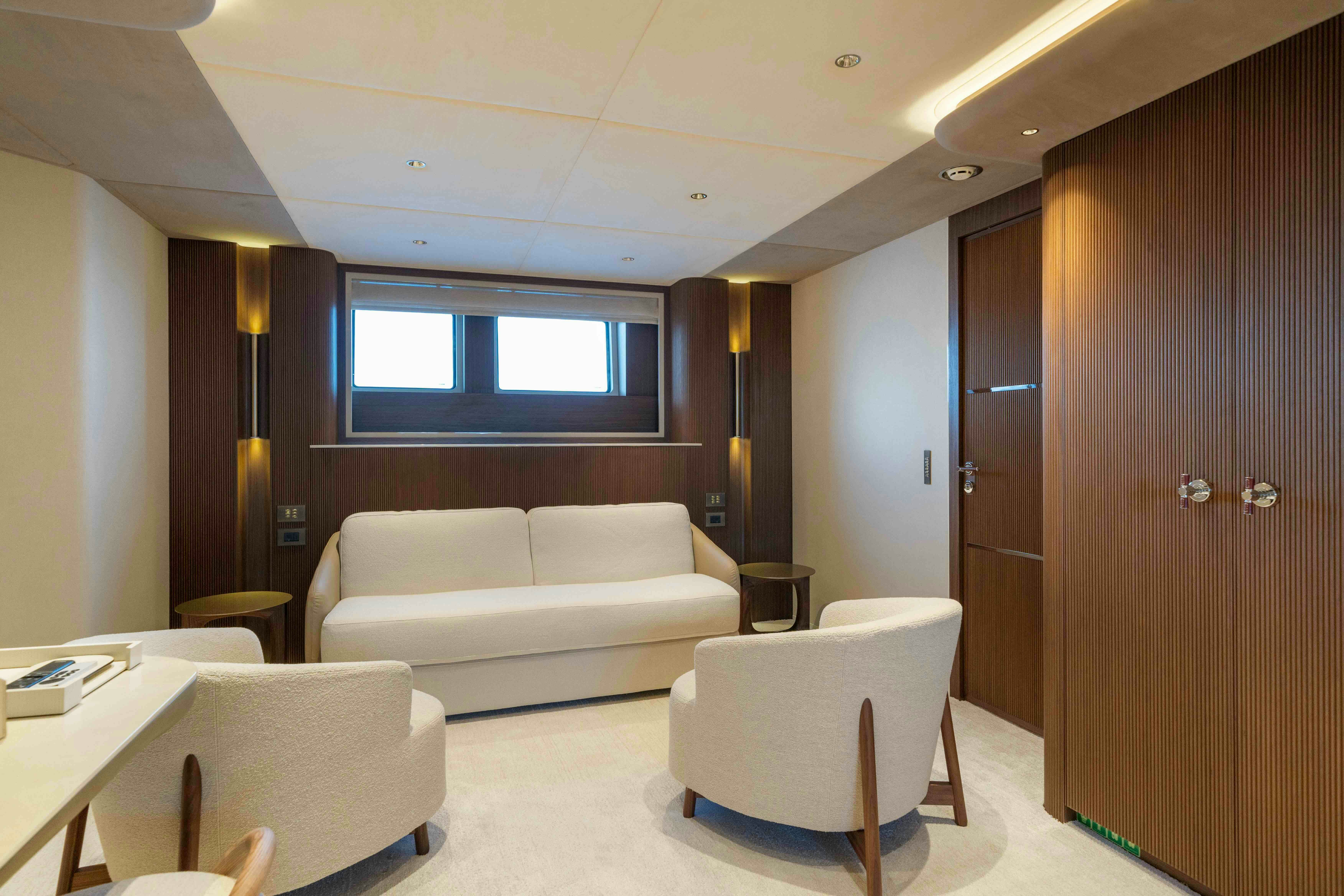 At the heart of SERENISSIMA I's design is an upper private owner’s deck, offering sweeping views and private outdoor space. Her two Jacuzzis—one nestled on the sundeck and the other situated on the owner’s deck aft—and a gentleman’s lounge with a cinema room, complemented by a drop-down balcony and walk-in wine cellar, contribute to her immersive onboard experience.