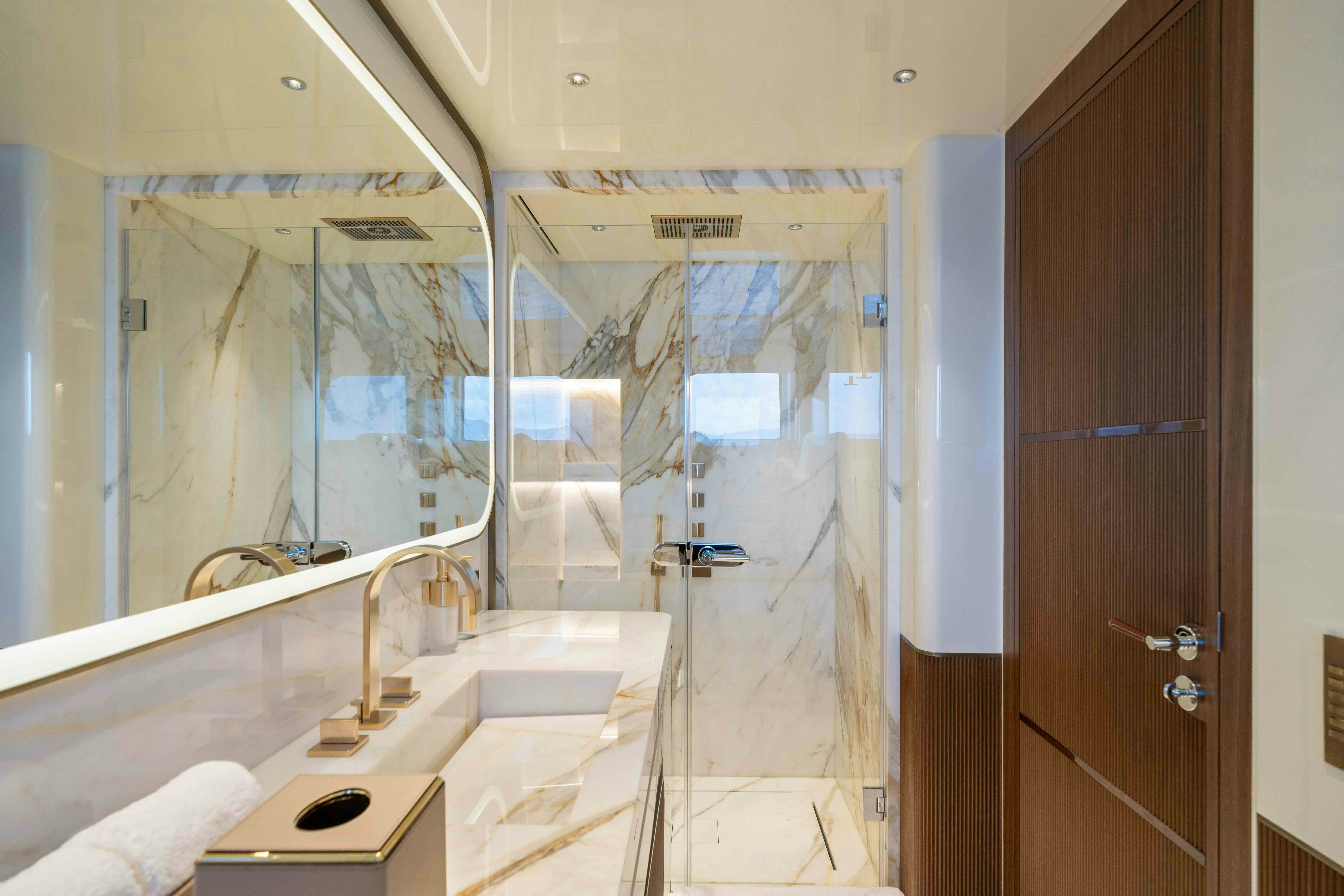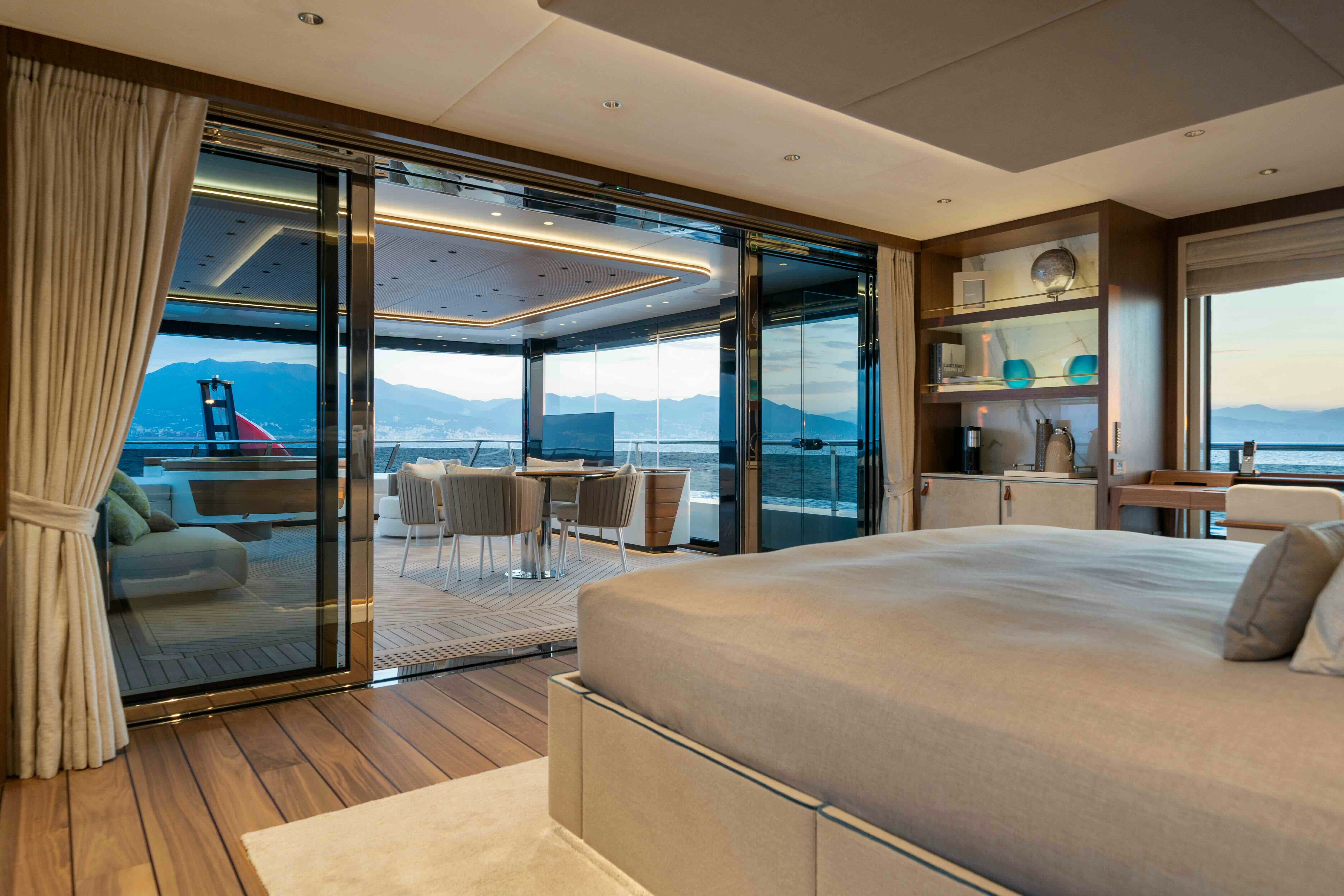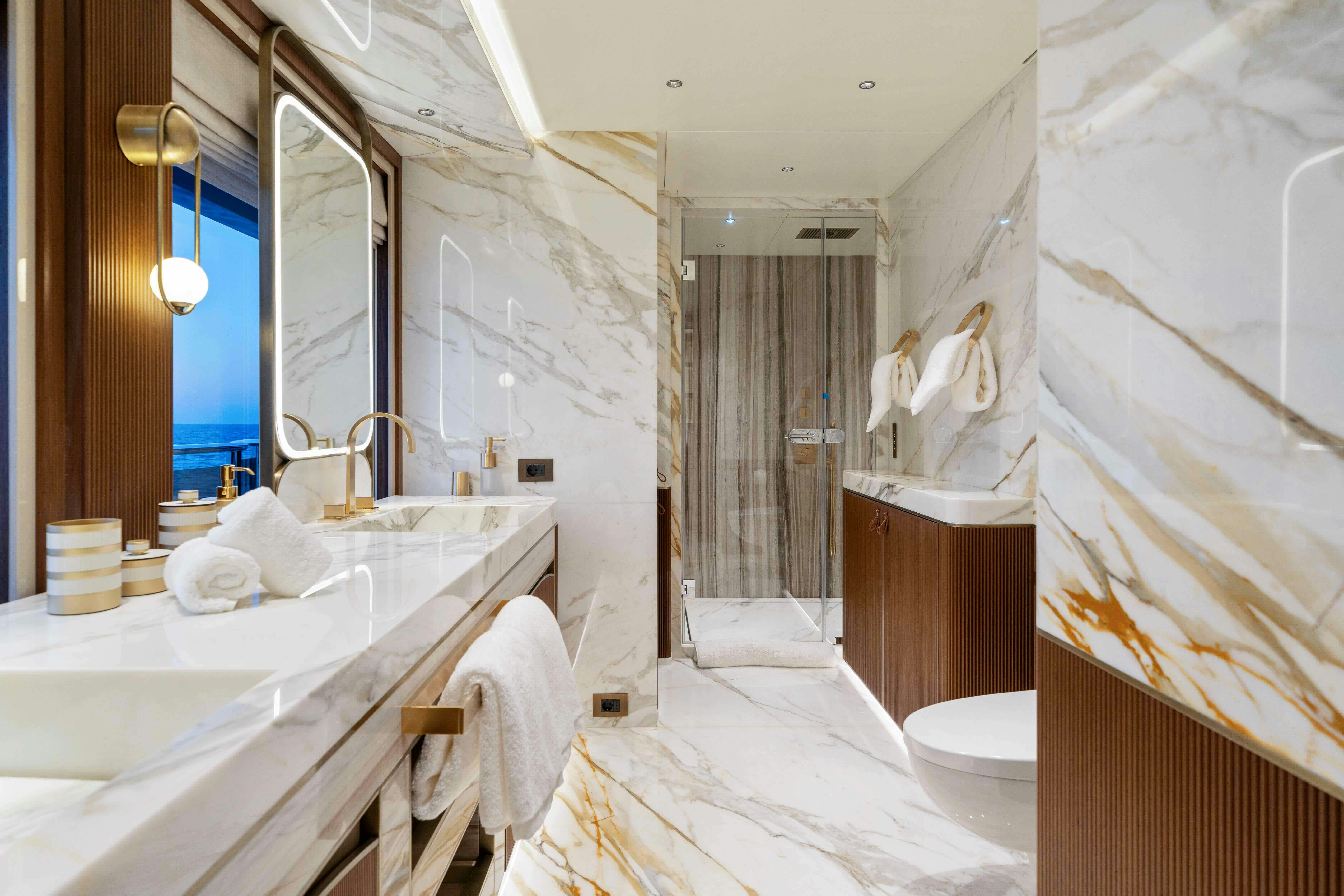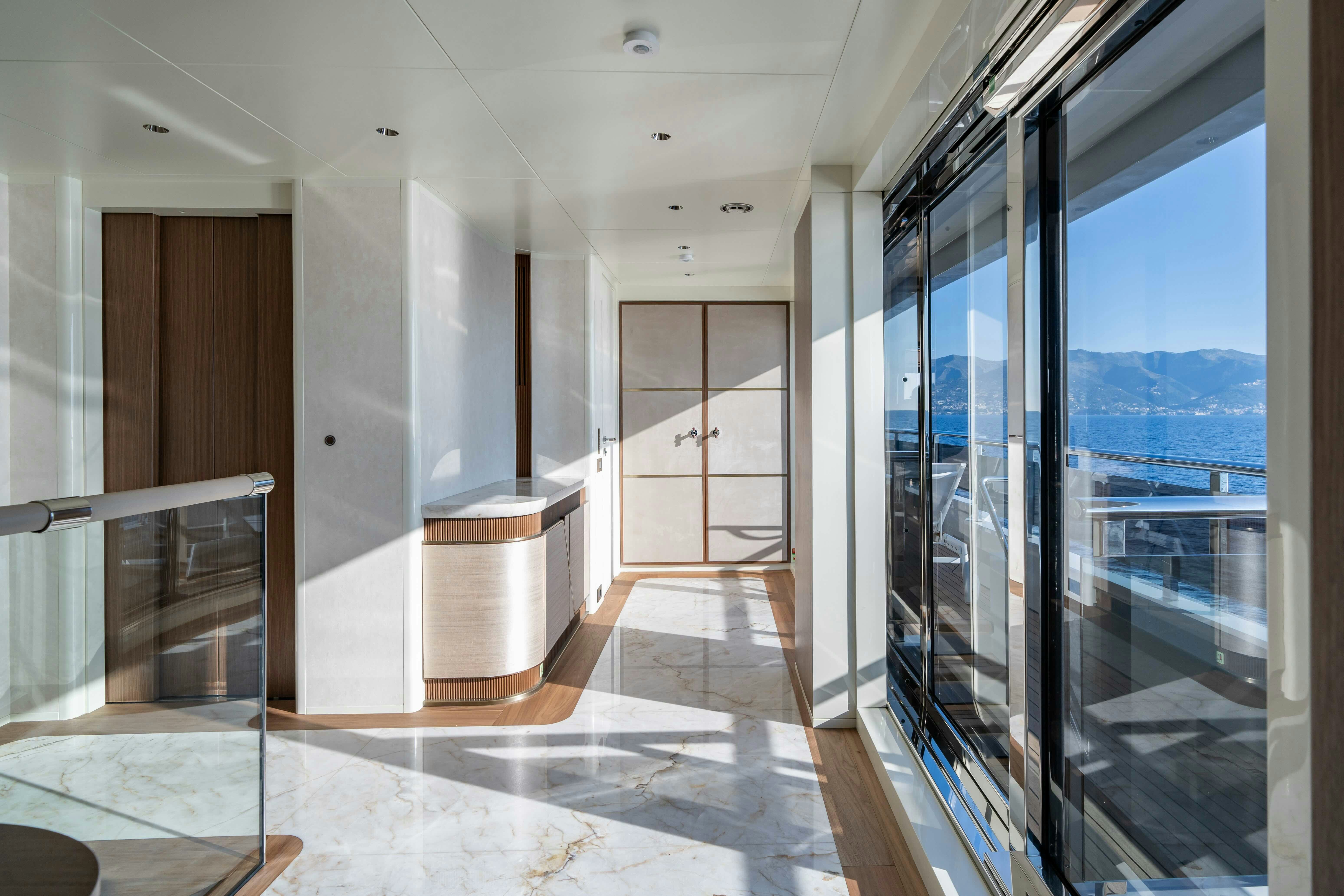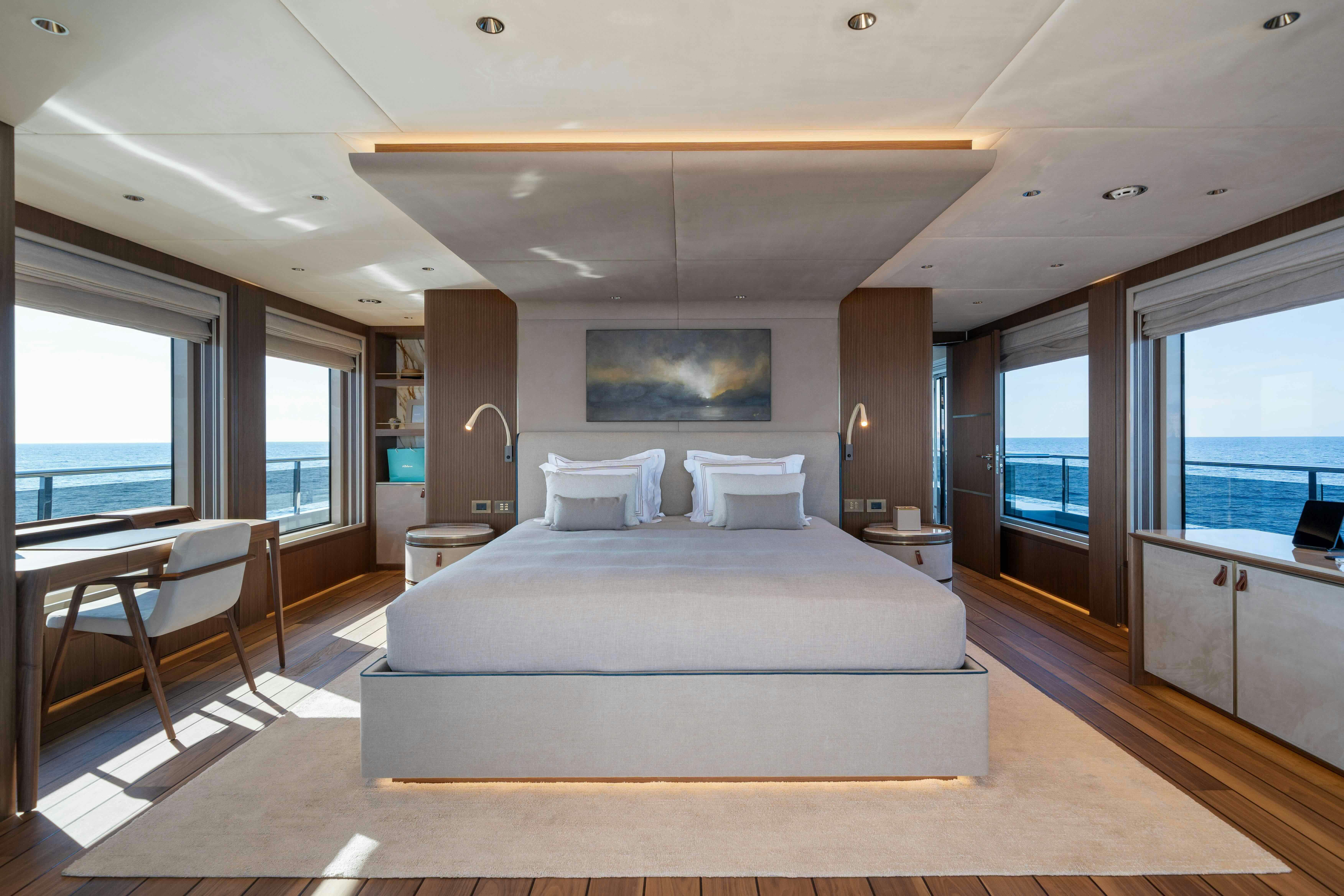 SERENISSIMA I showcases a contemporary and airy interior. The traditional aft main salon and dining room lead through to the midship guest lobby. She welcomes 10 guests in five beautifully appointed cabins. The master cabin, situated on the bridge deck aft, boasts a walk-in wardrobe and a lavish en-suite bathroom with sea-view windows and direct access to a private deck adorned with a small dining area, sunpads and a Jacuzzi—a sanctuary of tranquility. The lower deck features four additional guest cabins, including twin en-suite cabins forward and aft cabins that can be configured as doubles or opened to create a full-beam VIP suite. Nine crewmembers are welcome in five crew cabins on the lower deck. Beyond the guest accommodations, SERENISSIMA I features an elevator connecting all interior decks for effortless movement throughout the yacht.