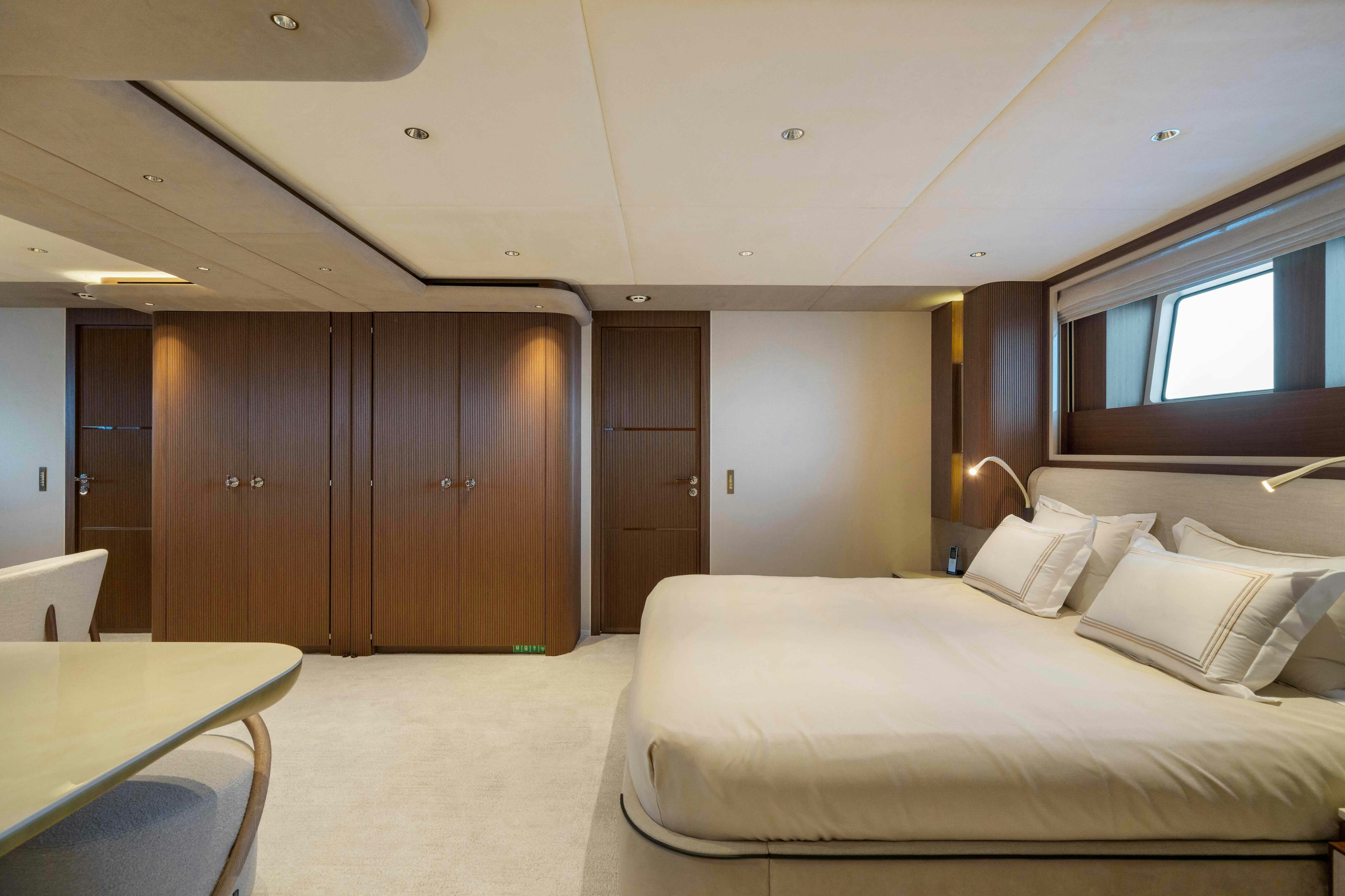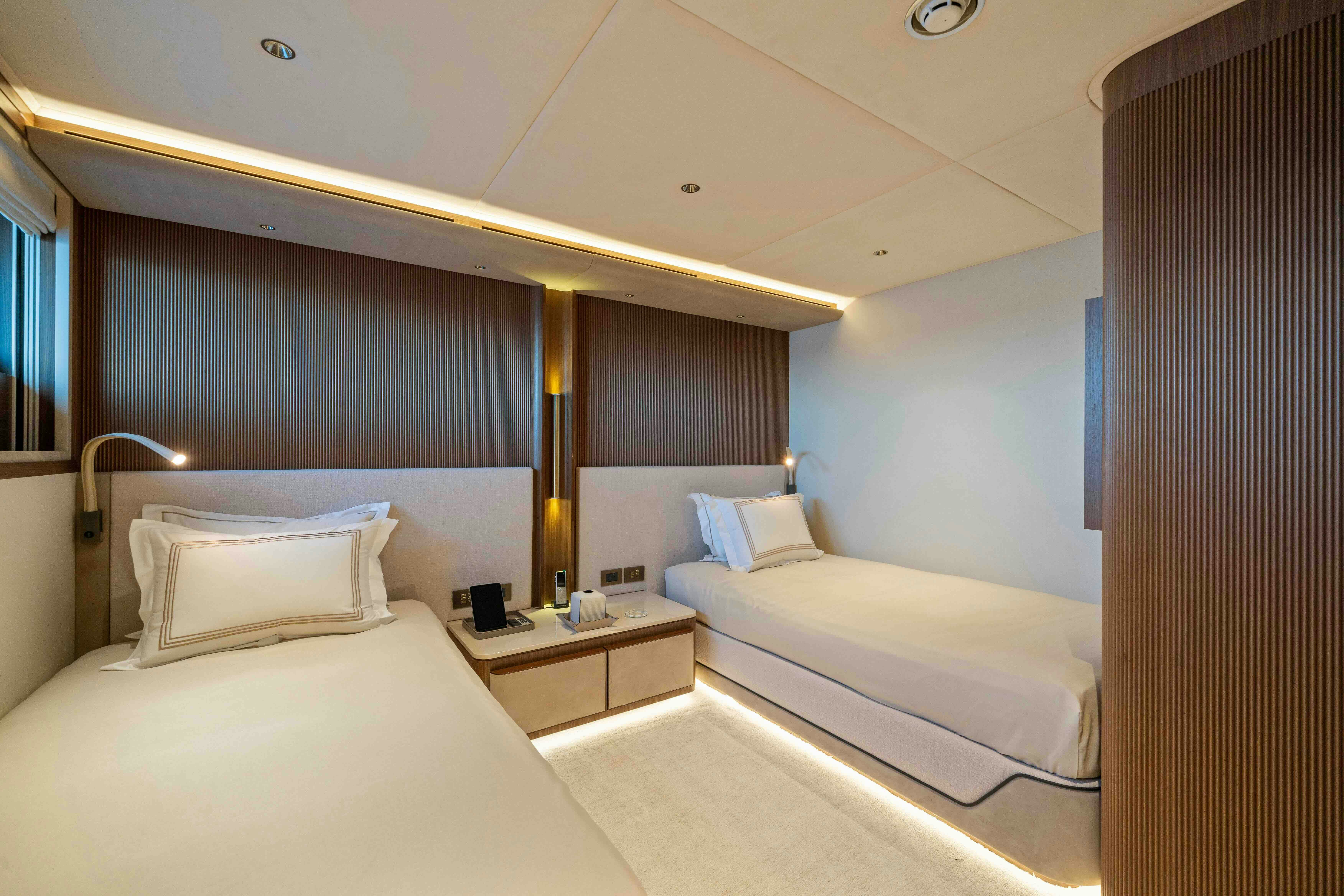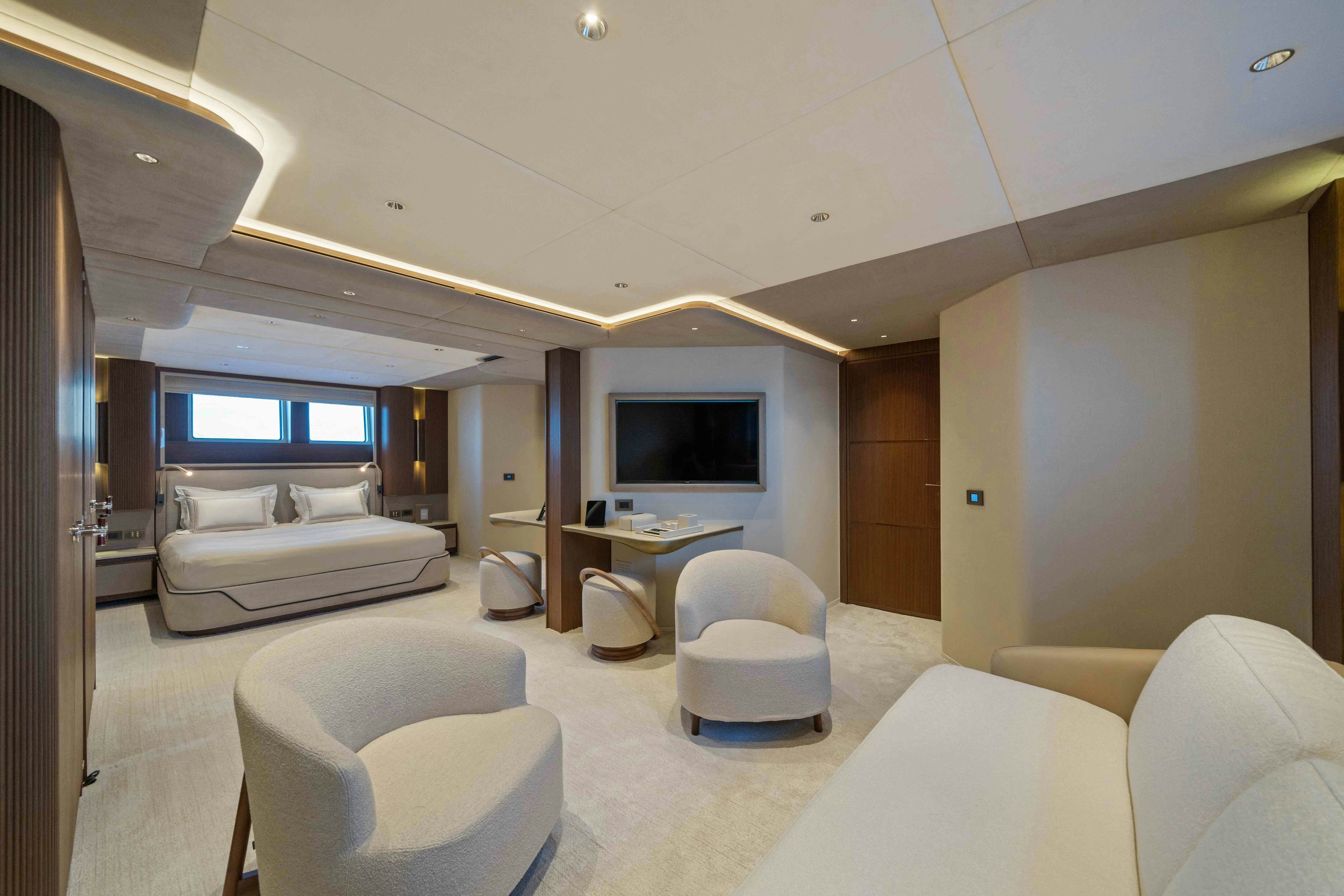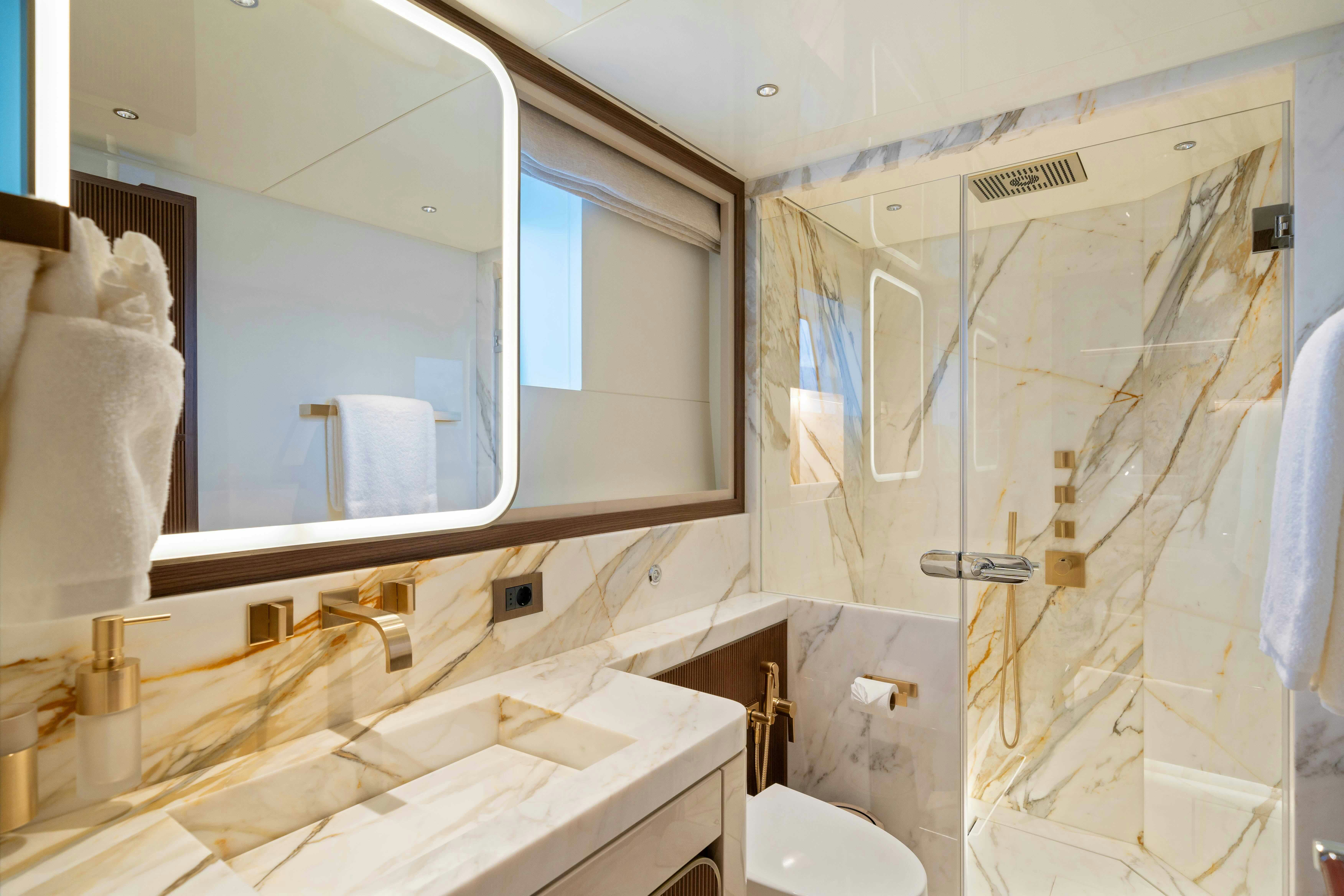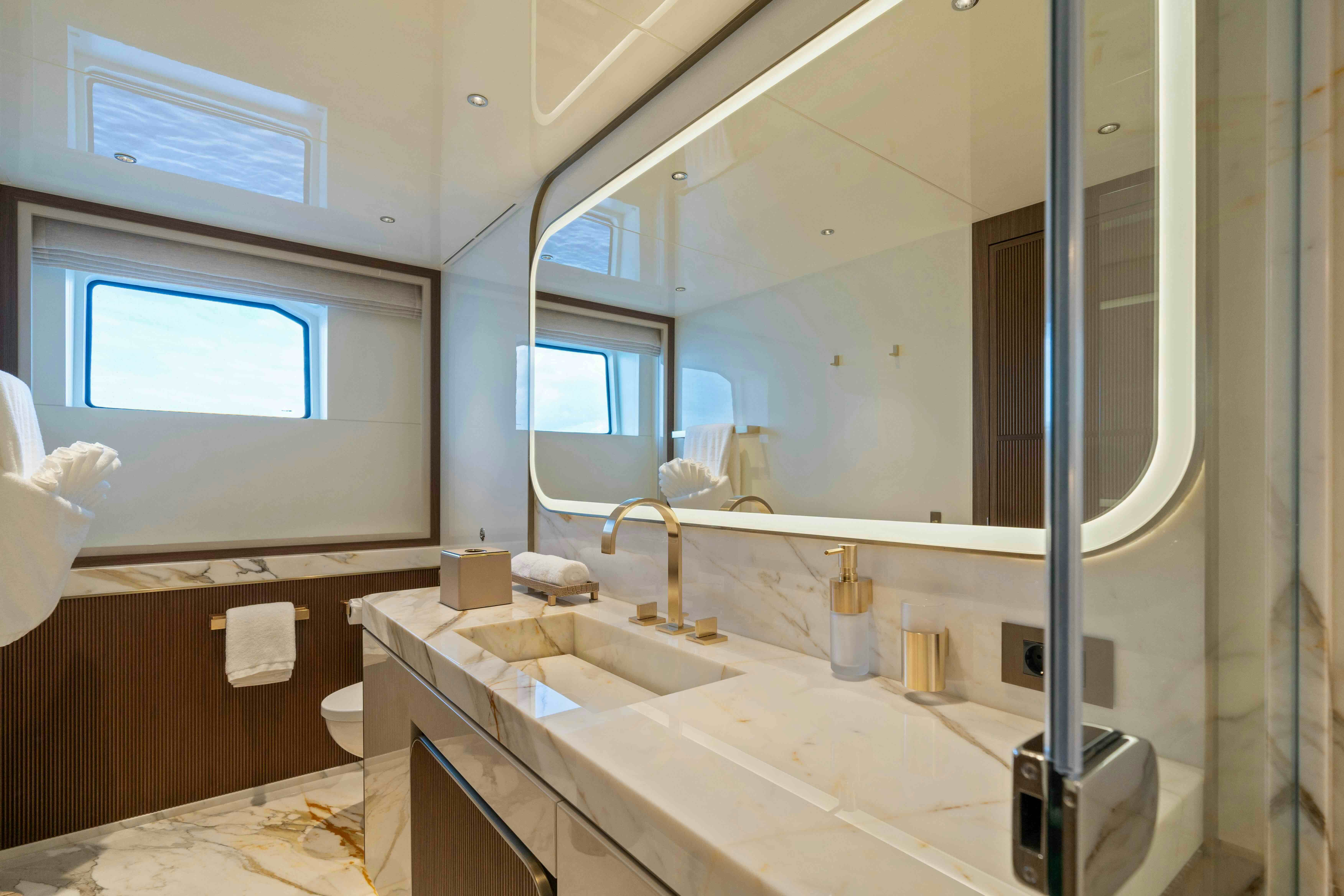 SERENISSIMA I showcases a contemporary and airy interior. The traditional aft main salon and dining room lead through to the midship guest lobby. She welcomes 10 guests in five beautifully appointed cabins. The master cabin, situated on the bridge deck aft, boasts a walk-in wardrobe and a lavish en-suite bathroom with sea-view windows and direct access to a private deck adorned with a small dining area, sunpads and a Jacuzzi—a sanctuary of tranquility. The lower deck features four additional guest cabins, including twin en-suite cabins forward and aft cabins that can be configured as doubles or opened to create a full-beam VIP suite. Nine crewmembers are welcome in five crew cabins on the lower deck. Beyond the guest accommodations, SERENISSIMA I features an elevator connecting all interior decks for effortless movement throughout the yacht.