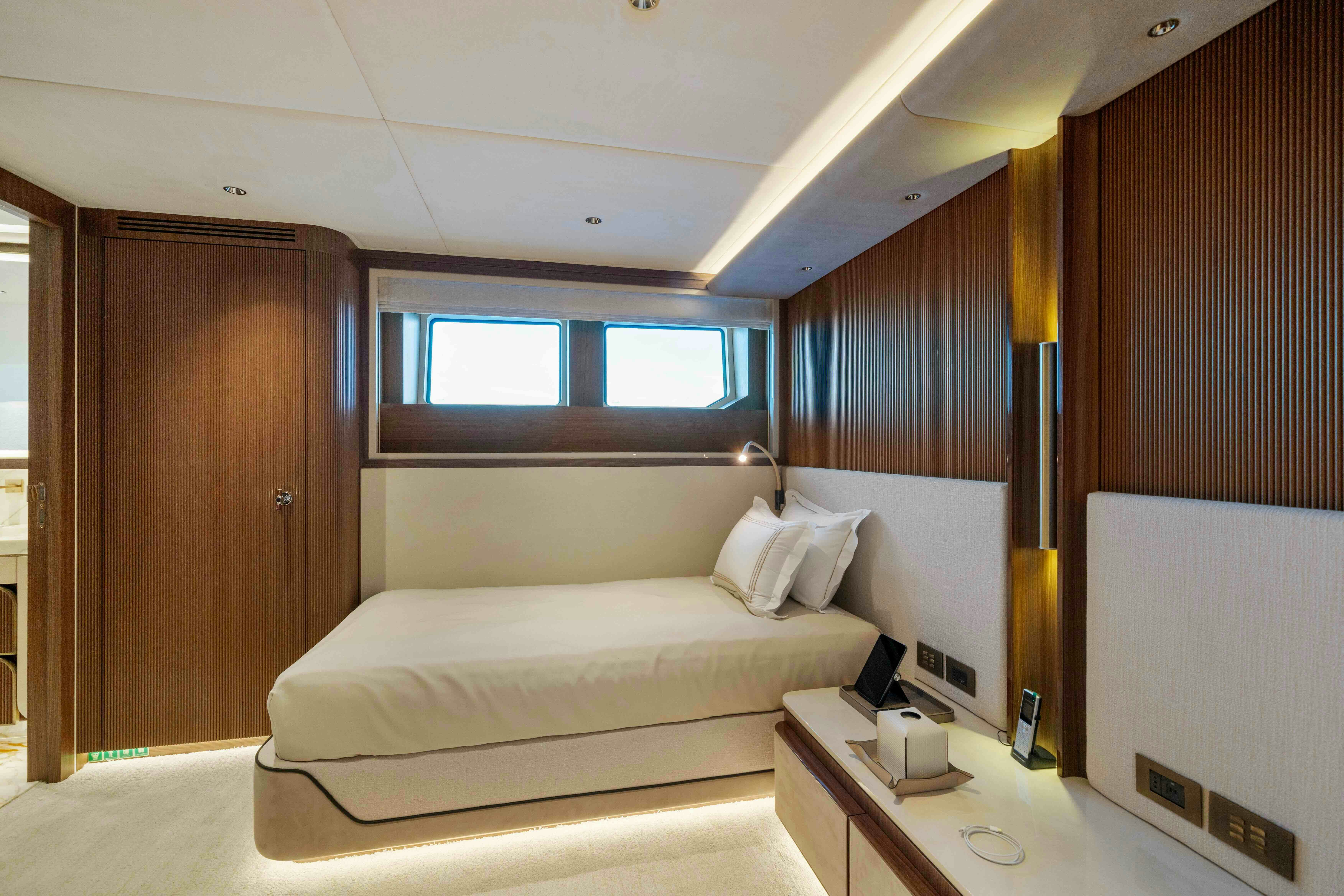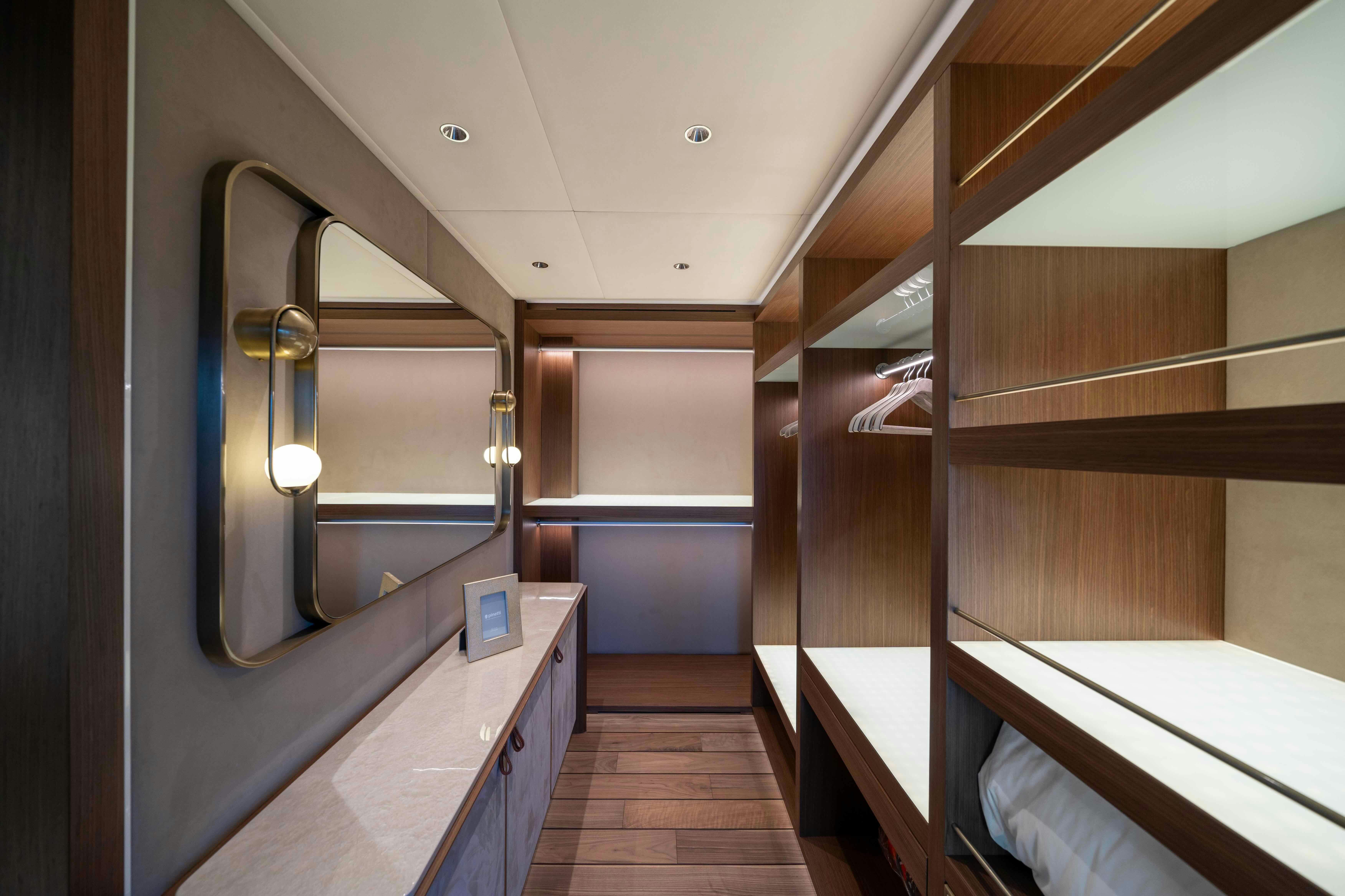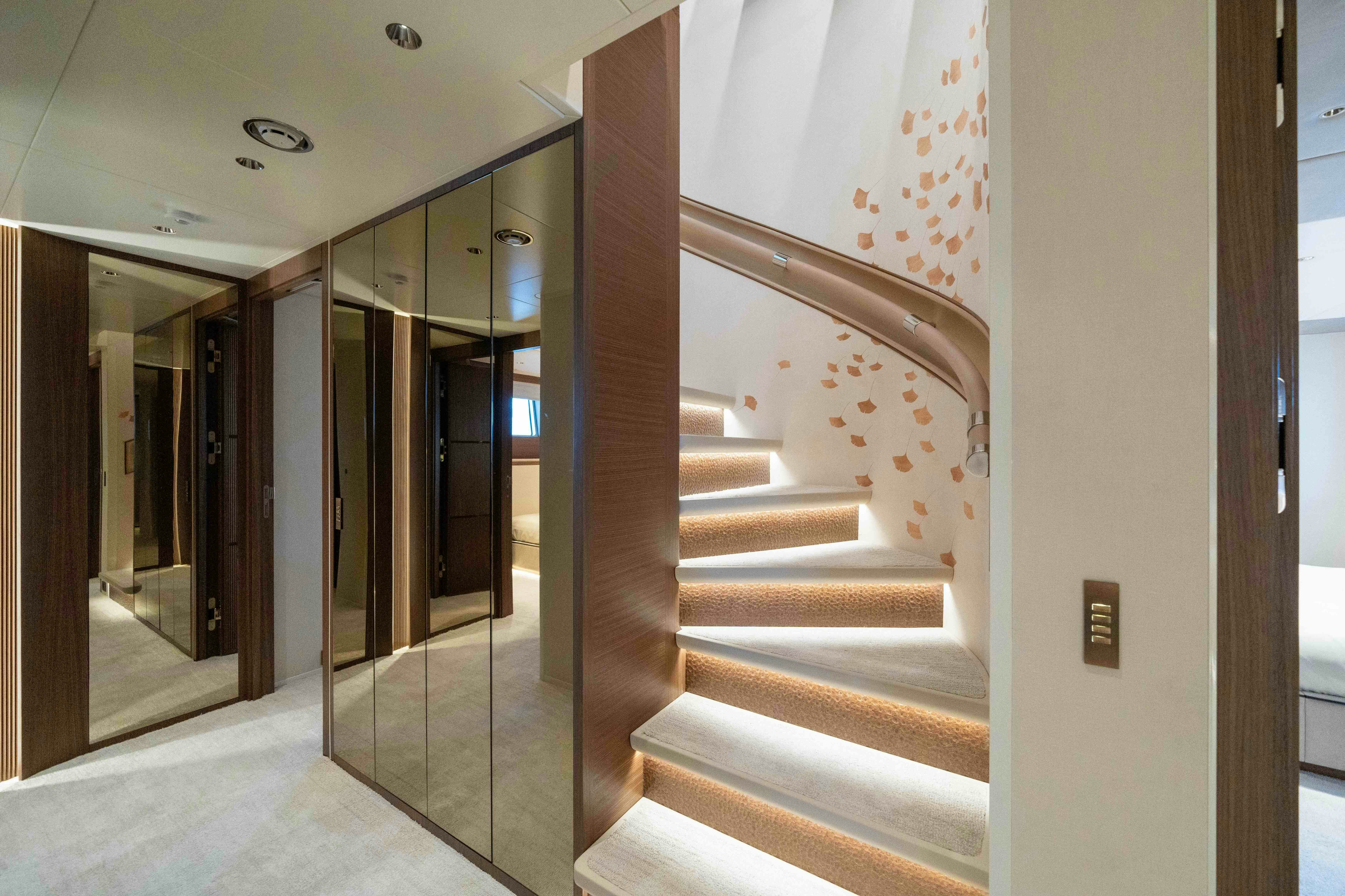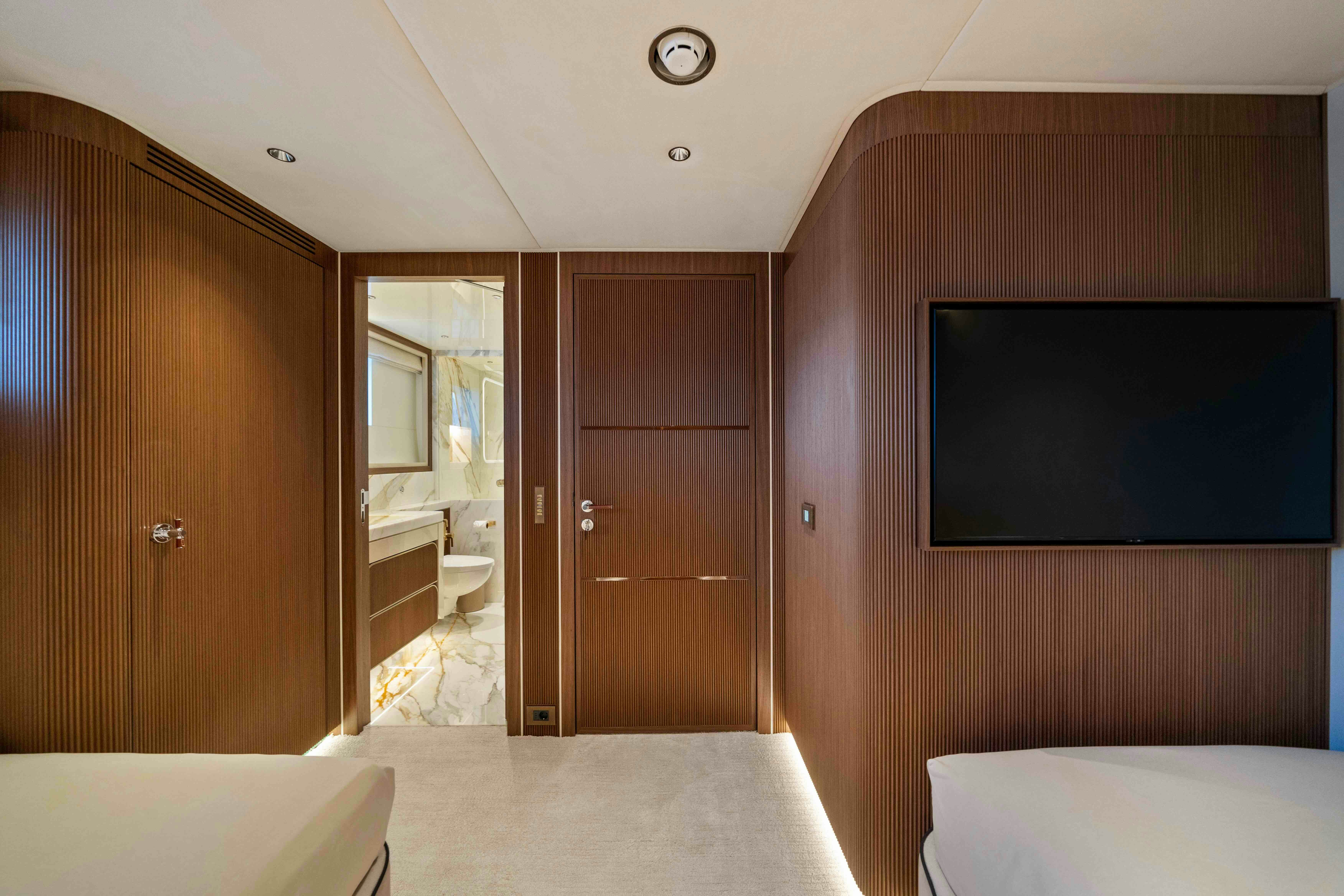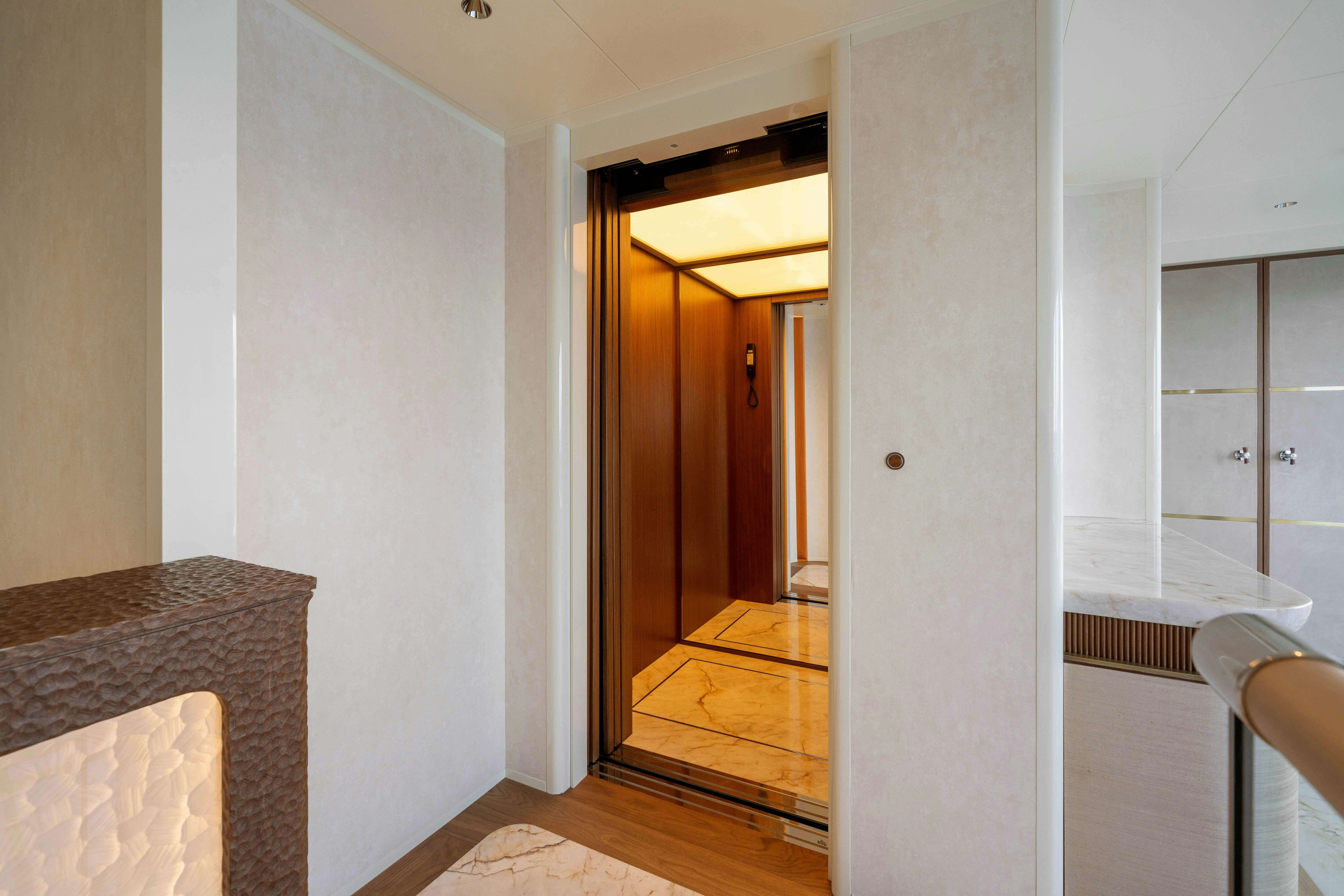SERENISSIMA I showcases a contemporary and airy interior. The traditional aft main salon and dining room lead through to the midship guest lobby. She welcomes 10 guests in five beautifully appointed cabins. The master cabin, situated on the bridge deck aft, boasts a walk-in wardrobe and a lavish en-suite bathroom with sea-view windows and direct access to a private deck adorned with a small dining area, sunpads and a Jacuzzi—a sanctuary of tranquility. The lower deck features four additional guest cabins, including twin en-suite cabins forward and aft cabins that can be configured as doubles or opened to create a full-beam VIP suite. Nine crewmembers are welcome in five crew cabins on the lower deck. Beyond the guest accommodations, SERENISSIMA I features an elevator connecting all interior decks for effortless movement throughout the yacht.