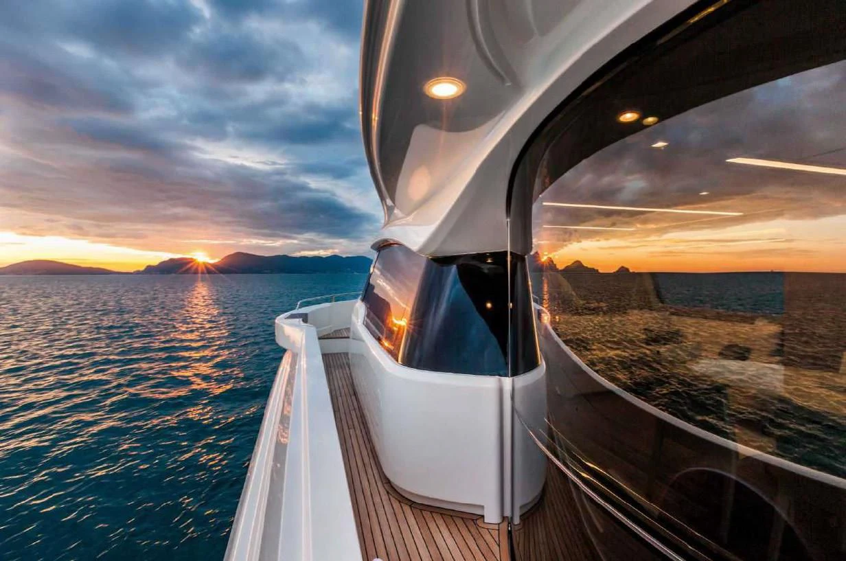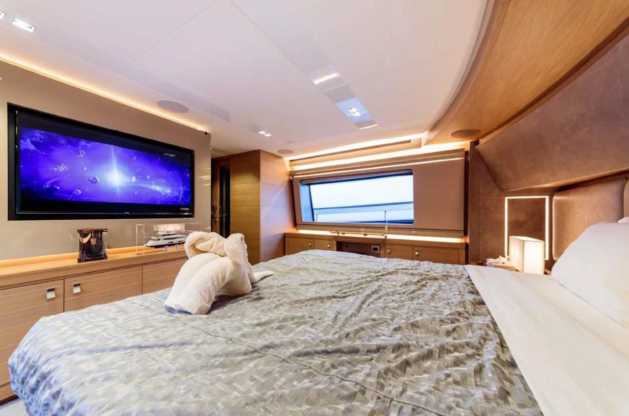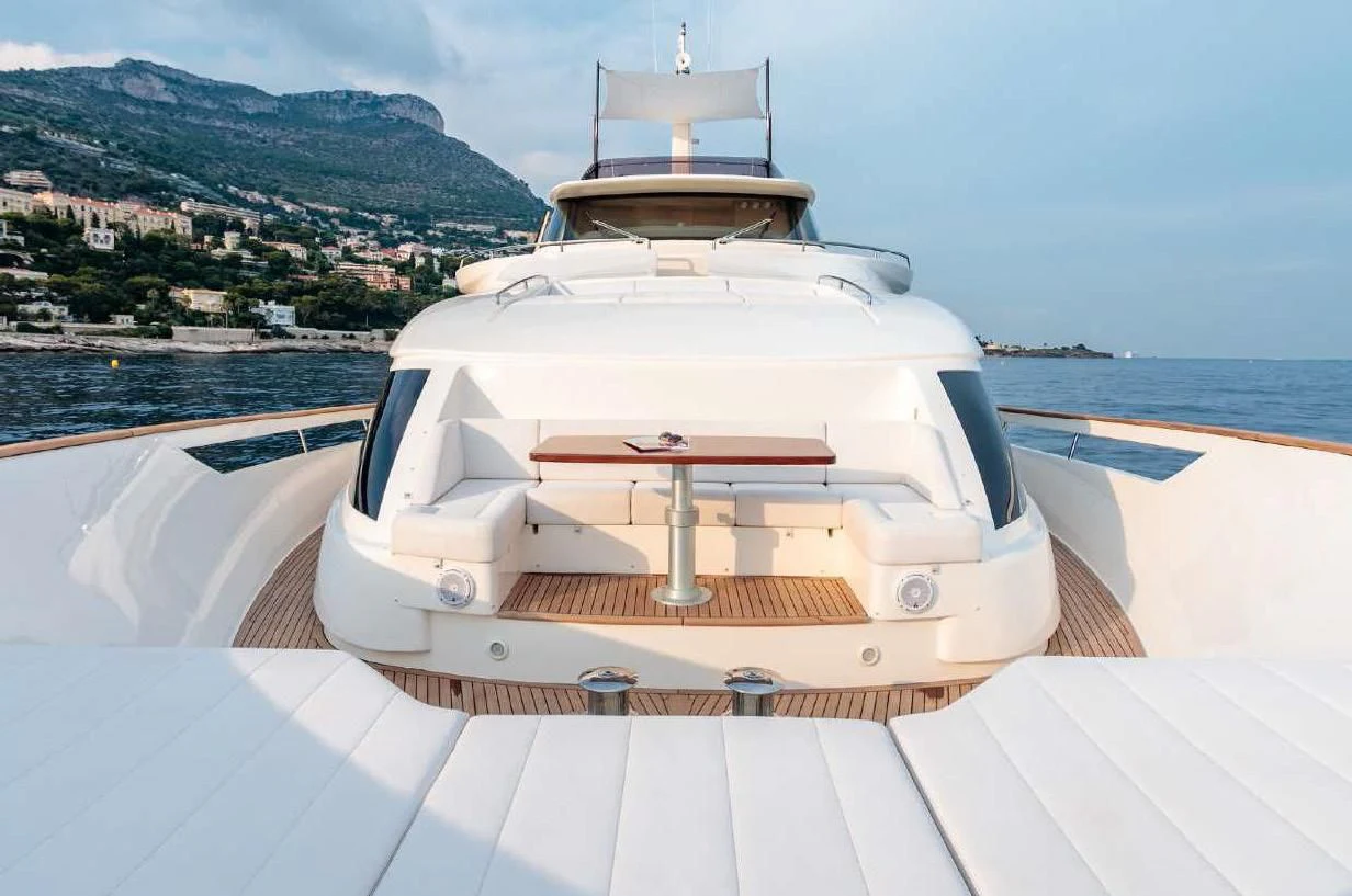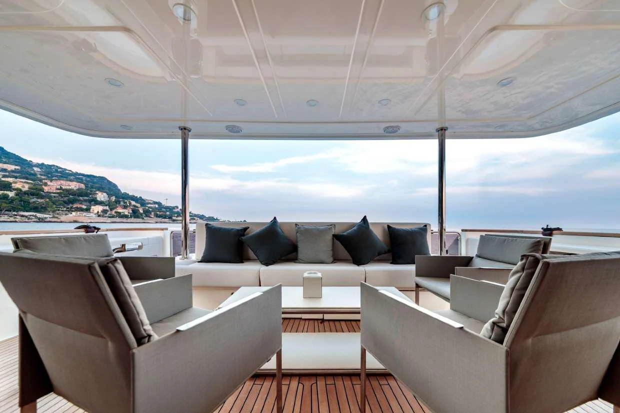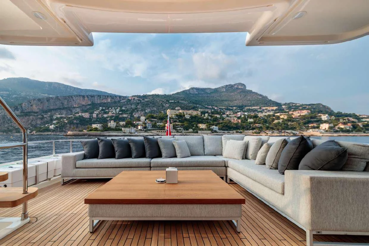 SEVEN's exterior design exudes a stately charm that captivates at first sight. Her sleek lines and modern silhouette are a testament to the expertise of the Custom Line Navetta 28 model's design team. Notably, she boasts an expansive beam of approximately SEVEN meters (23 feet), ensuring ample exterior space for leisurely pursuits under the sun or stars alike. Whether you choose to bask on her sundecks, dine alfresco in one of her luxurious outdoor dining areas or unwind in any of her plush lounging areas – SEVEN offers countless opportunities for relaxation and entertainment.