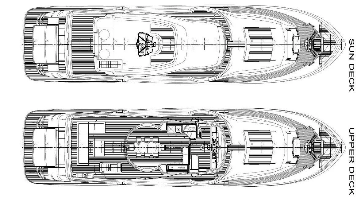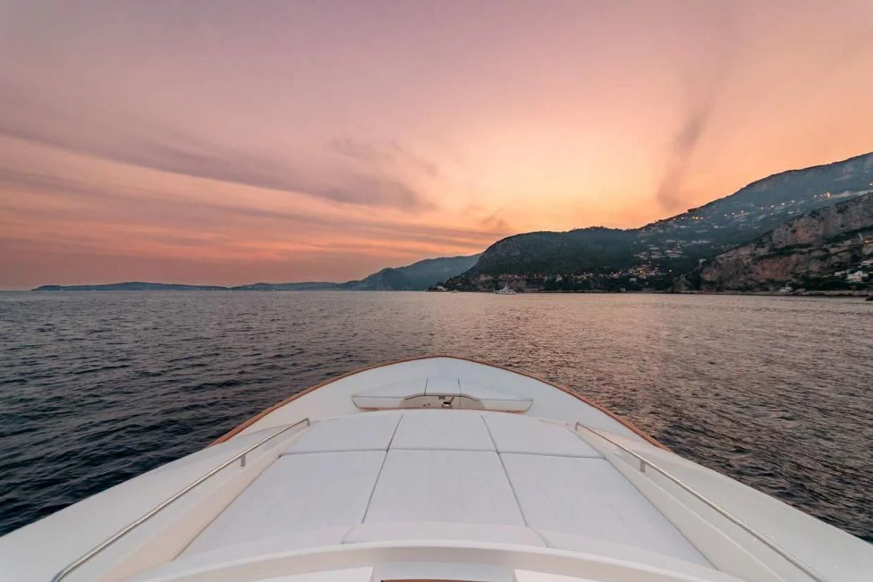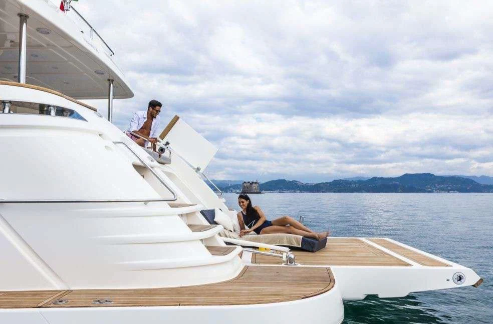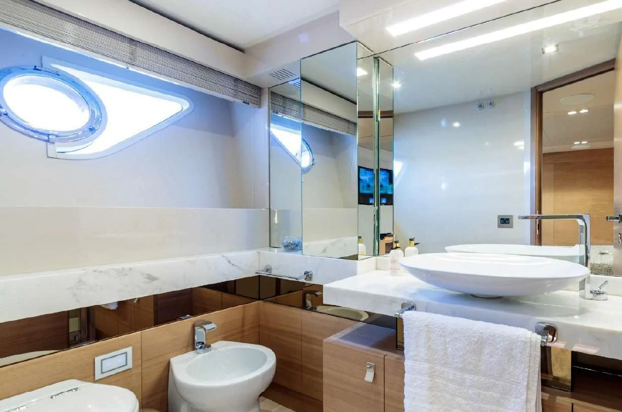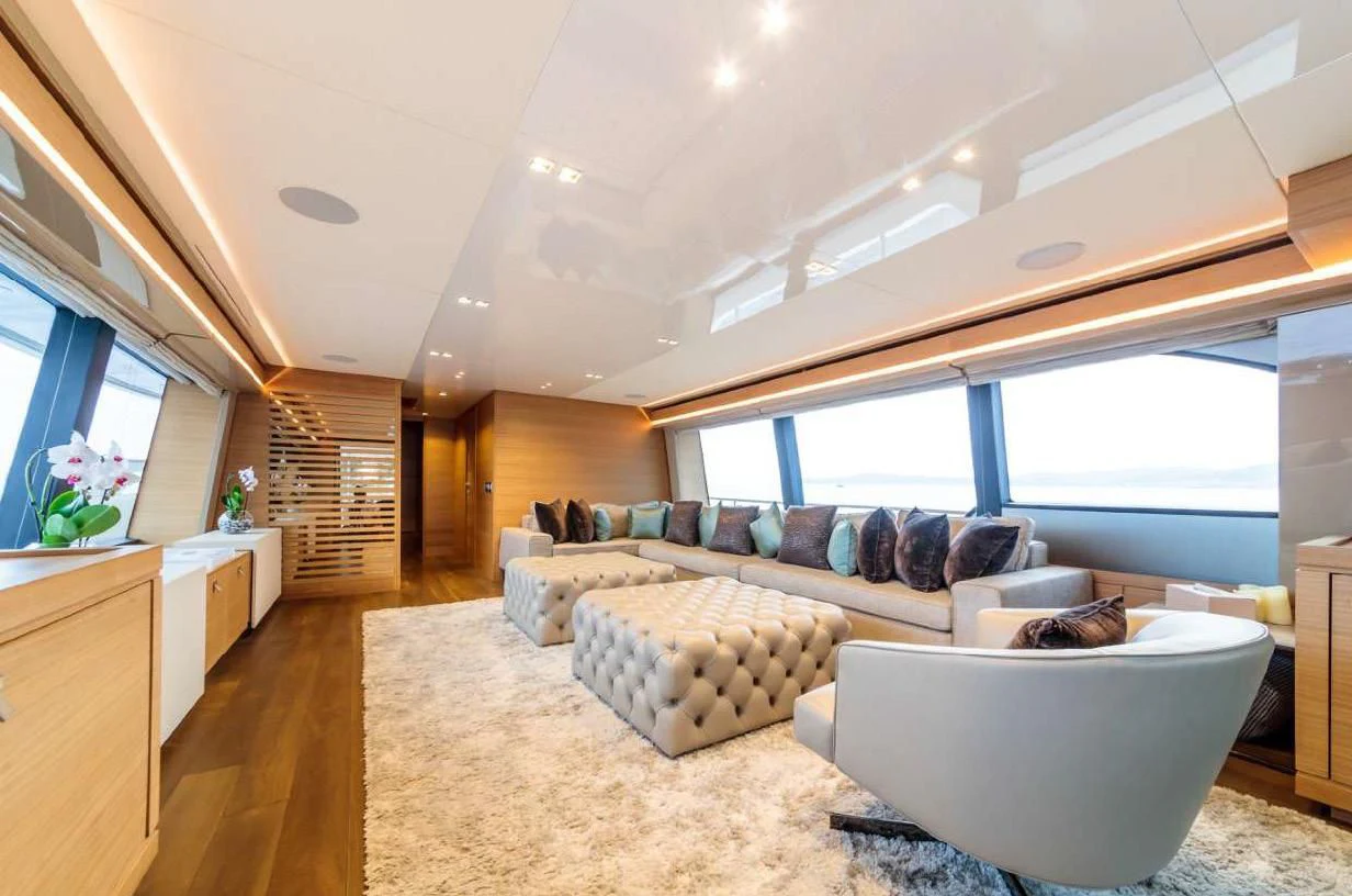 SEVEN's exterior design exudes a stately charm that captivates at first sight. Her sleek lines and modern silhouette are a testament to the expertise of the Custom Line Navetta 28 model's design team. Notably, she boasts an expansive beam of approximately SEVEN meters (23 feet), ensuring ample exterior space for leisurely pursuits under the sun or stars alike. Whether you choose to bask on her sundecks, dine alfresco in one of her luxurious outdoor dining areas or unwind in any of her plush lounging areas – SEVEN offers countless opportunities for relaxation and entertainment.