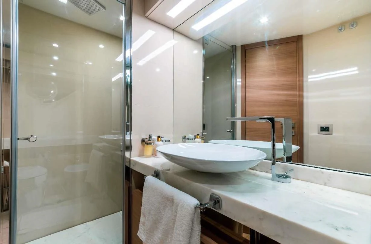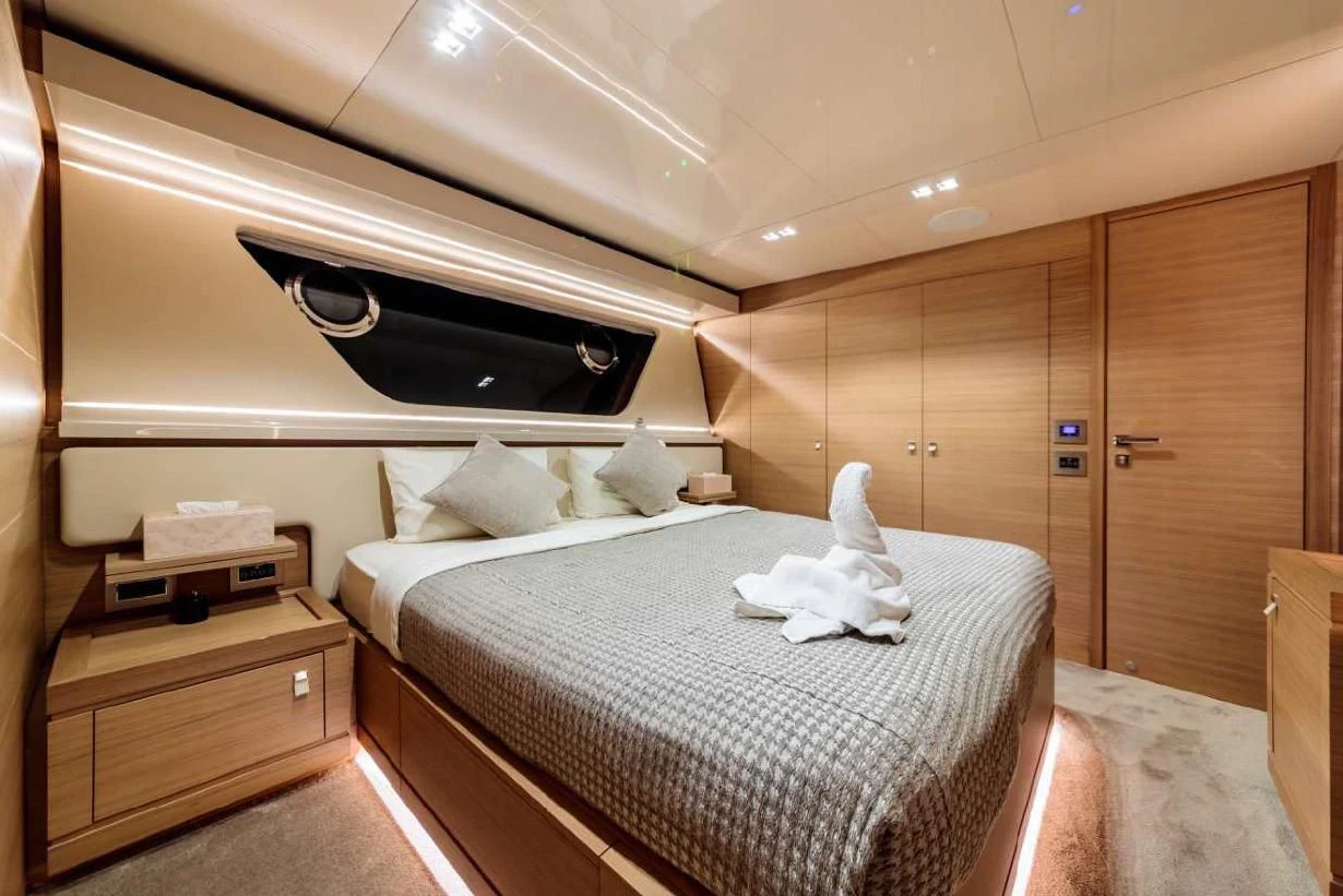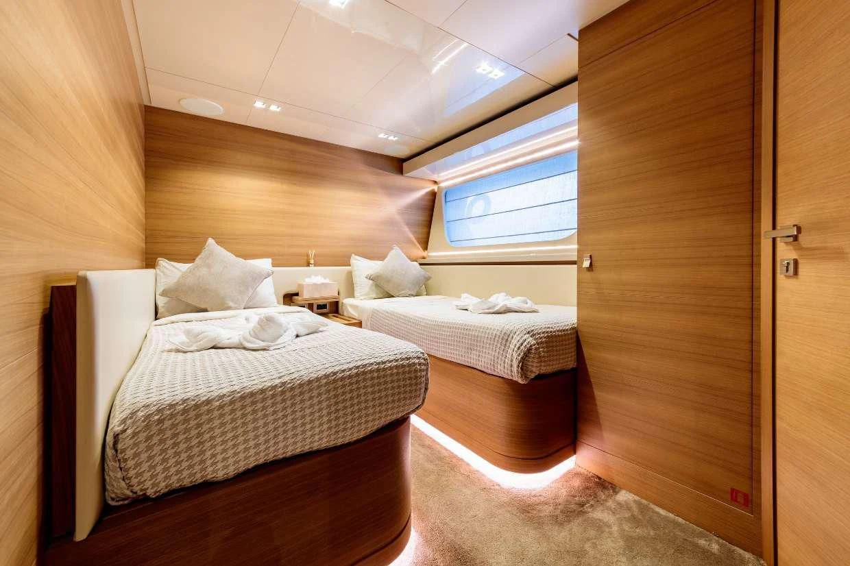 Step inside SEVEN and immerse yourself in a world of refined luxury and comfort. The interior design harmoniously blends contemporary style with timeless elegance, resulting in an ambiance that is both welcoming and sophisticated. Each of her five sumptuous cabins has been meticulously designed to ensure maximum comfort for up to ten guests onboard. The master stateroom stands as a true sanctuary at sea with its lavish appointments and generous proportions while additional guest rooms provide equally impressive accommodations.