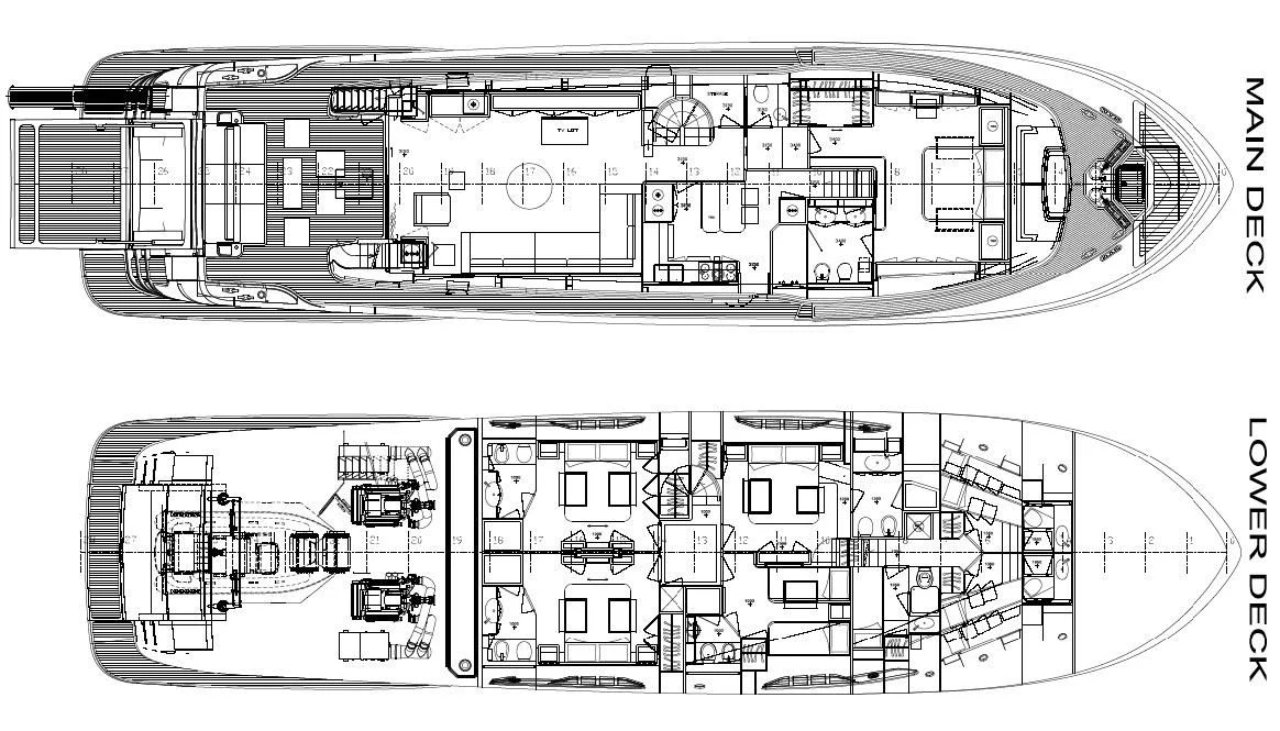 Powering through waters at cruising speeds of 12 knots, with a top speed reaching up to 16 knots; SEVEN is propelled by twin MAN engines each boasting an impressive power output of 1200 hp / 895 kW. She carries a substantial fuel capacity of approximately 3302 gallons which makes long-distance voyages possible without frequent refueling stops.