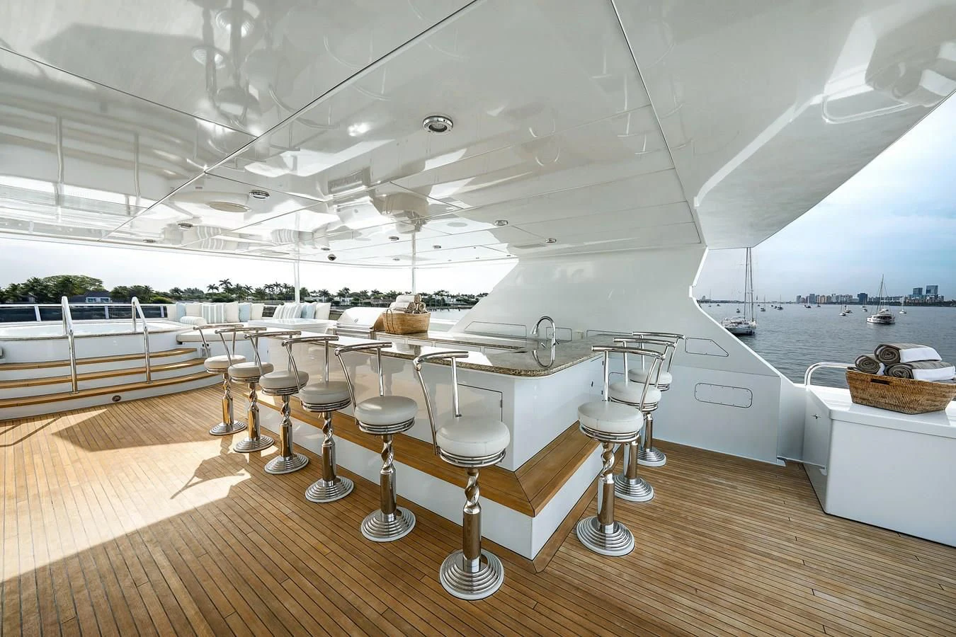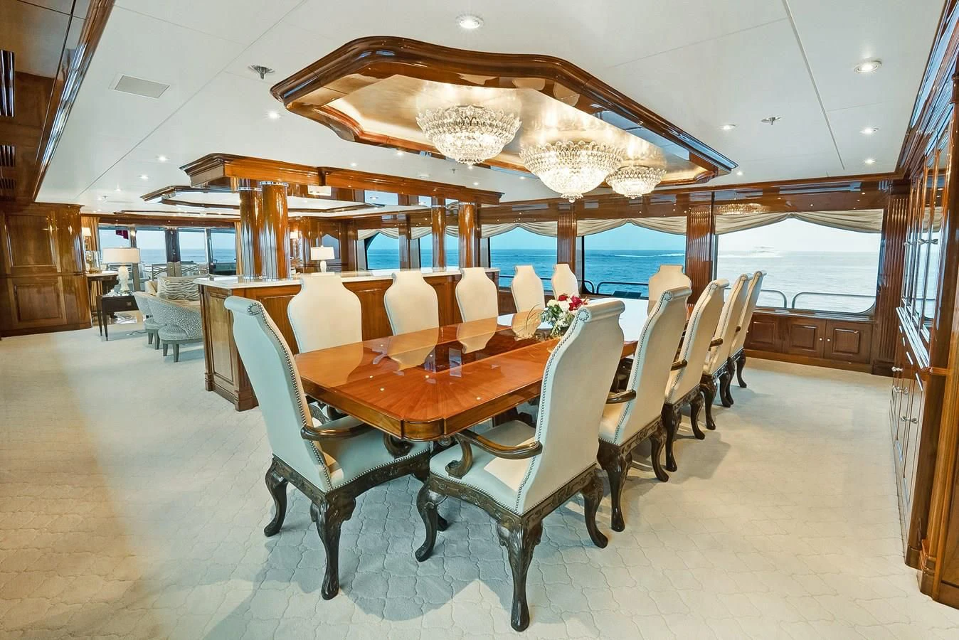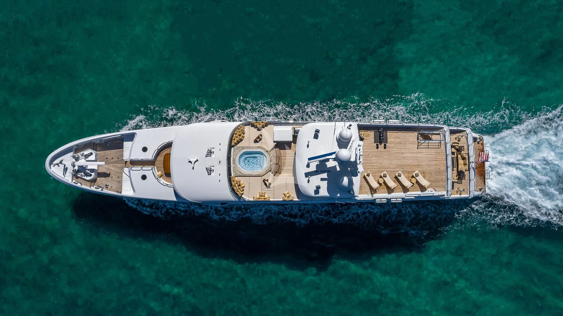 SILVER LINING's exterior design is both elegant and imposing – an embodiment of nautical prowess that is impossible to ignore. Her sleek silhouette cuts through the water with grace at cruising speeds of 11 knots, reaching up to a maximum speed of 16 knots when required. The yacht’s expansive sundeck invites guests to bask under the sun while enjoying panoramic views or dine alfresco under starlit skies. Notably, SILVER LINING has been designed as helicopter-capable, setting her apart from many other vessels in her class.