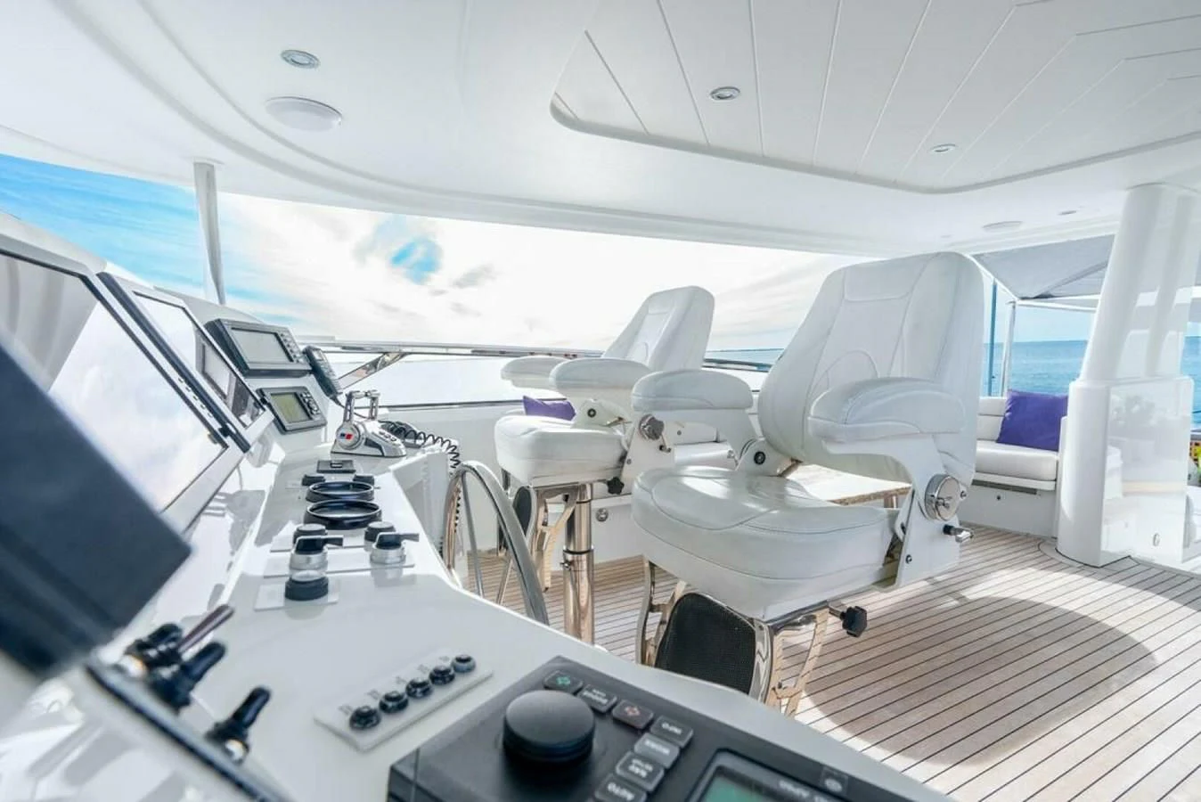 SIMPLICITY's exterior exudes elegant sophistication with its sleek lines and imposing silhouette. The fiberglass hull material not only adds durability but also enhances her streamlined appearance. Her beam measures 23 feet with an additional 7 inches or about 7.2 meters in metric units, providing ample space for outdoor relaxation areas and onboard amenities. The yacht has been designed with a maximum draft of around 5 feet and 9 inches (approximately 1.6 meters), making it ideal for exploring shallow waters as well as deep seas.