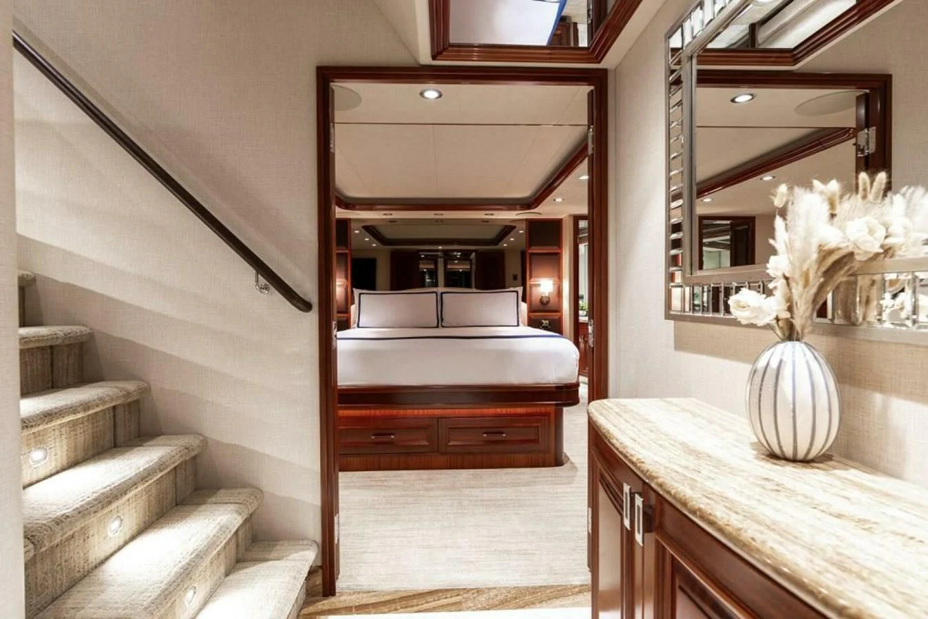 The interiors are nothing short of exquisite; every corner radiates warmth and opulence that befits royalty. With four luxurious cabins capable of hosting up to eight guests along with accommodation for six dedicated crew members, SIMPLICITY ensures that every voyage is steeped in comfort and attended by top-notch service. At-Anchor Stabilizers are installed onboard ensuring utmost stability while anchored, thus guaranteeing smooth sailing even during turbulent weather conditions.