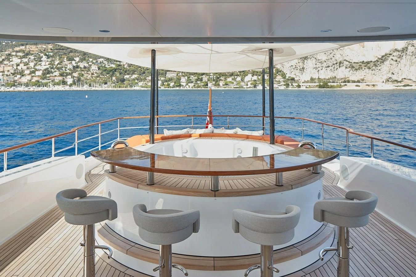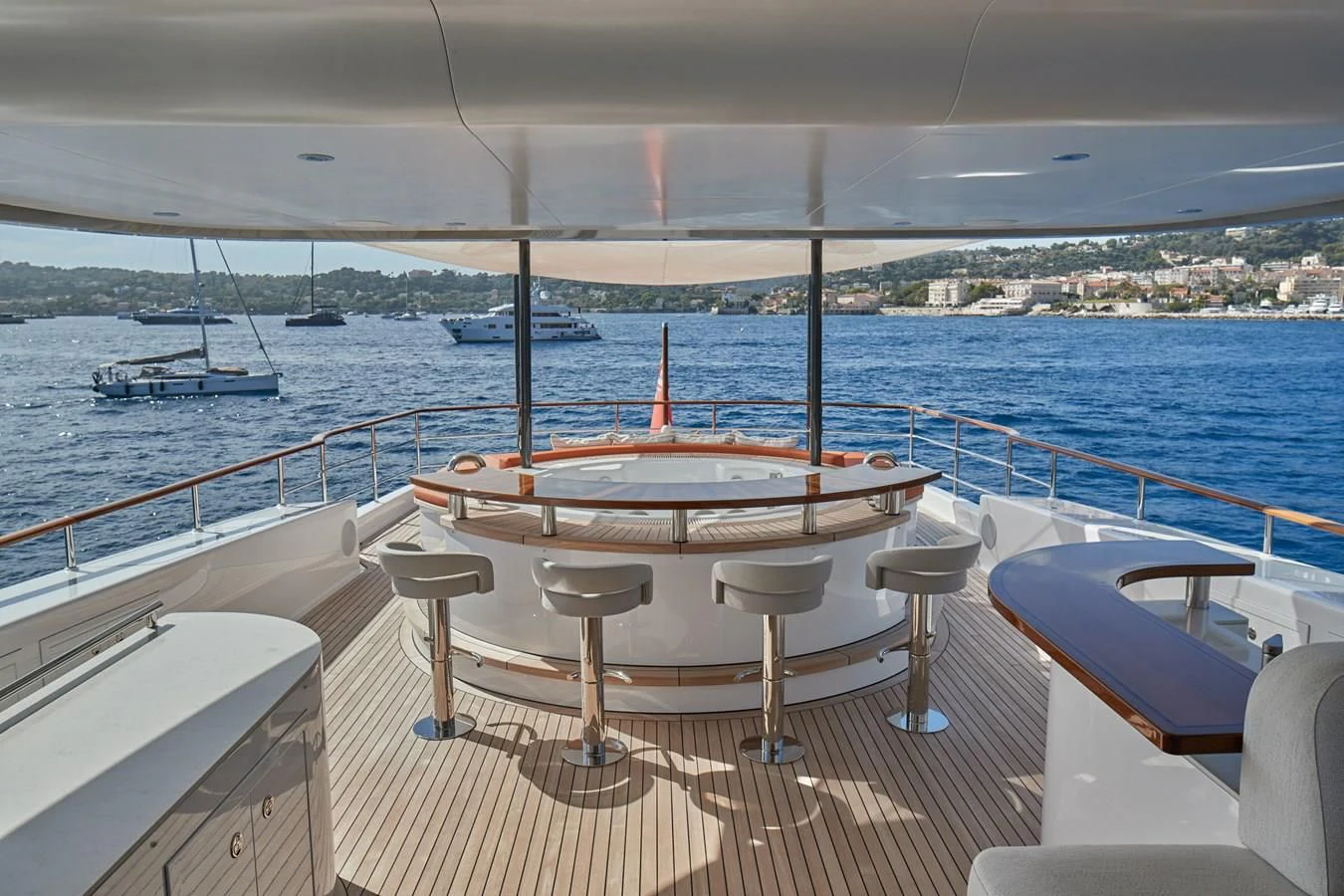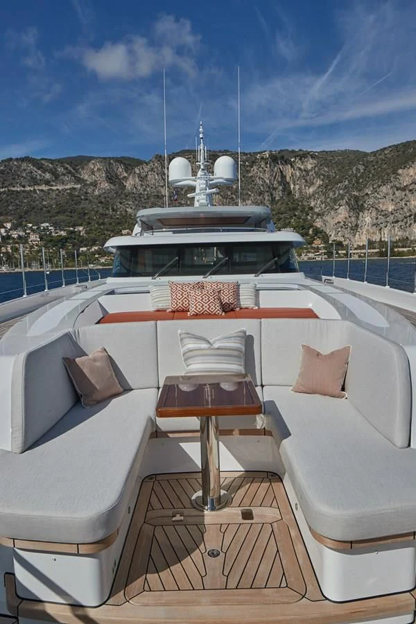 The exterior design is a symphony in elegance and sophistication that effortlessly merges form with function. The standout feature is undoubtedly the flybridge; it's not just an operational hub but also an alfresco entertainment paradise offering panoramic vistas of the azure expanse beyond. The sundeck invites guests to bask under the sun while sipping on champagne from crystal flutes or unwind in the bubbling Jacuzzi under starlit skies. The beach club at water level serves as a gateway to aquatic adventures or simply as a serene spot for lounging by the sea.