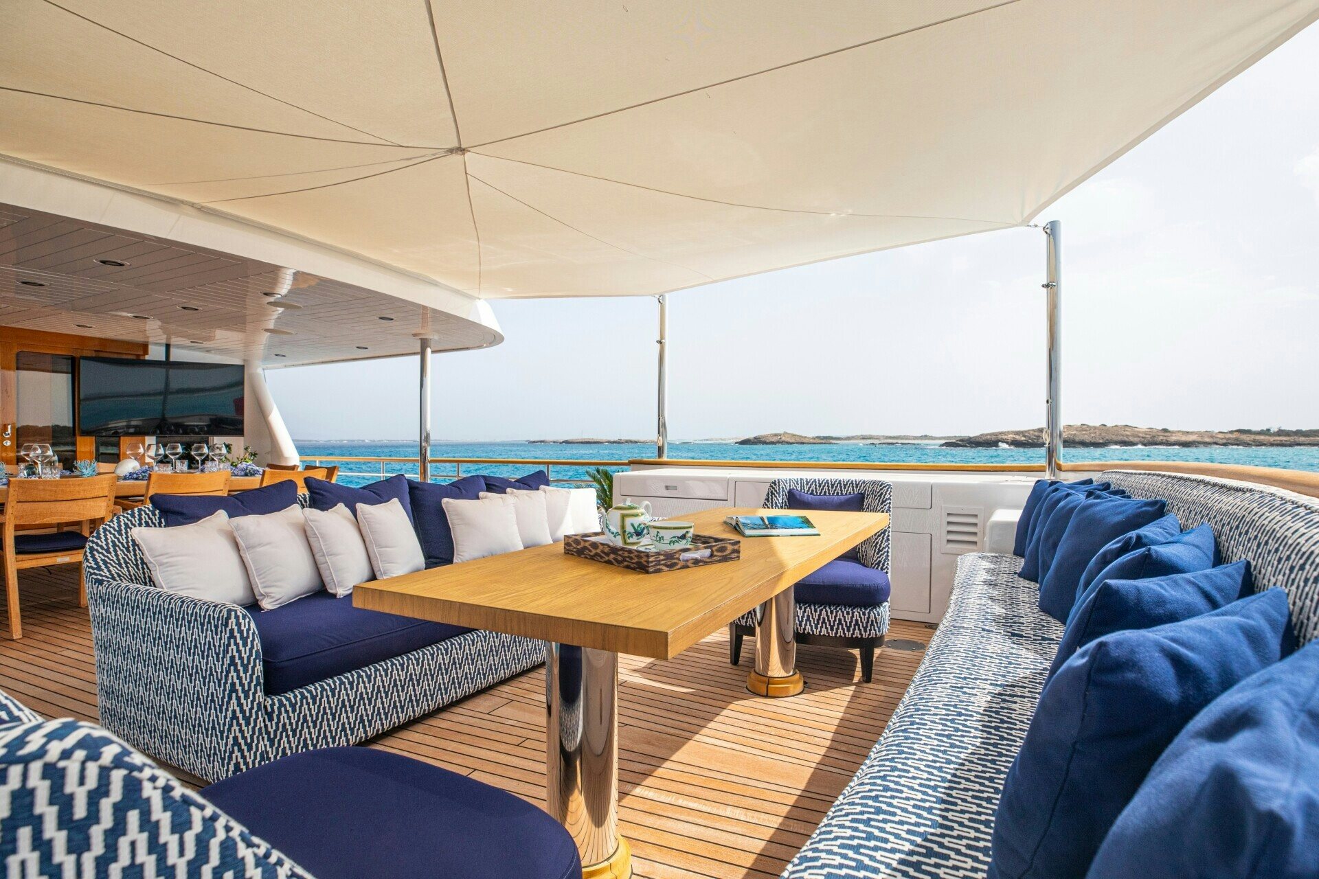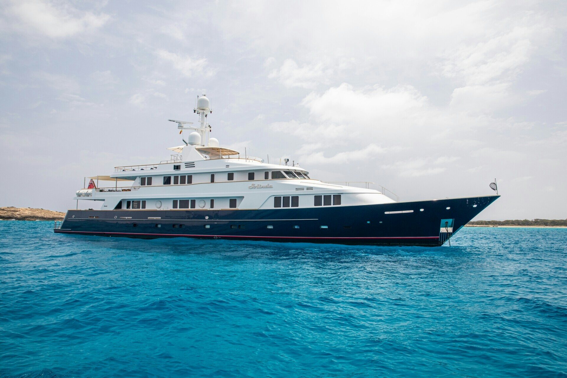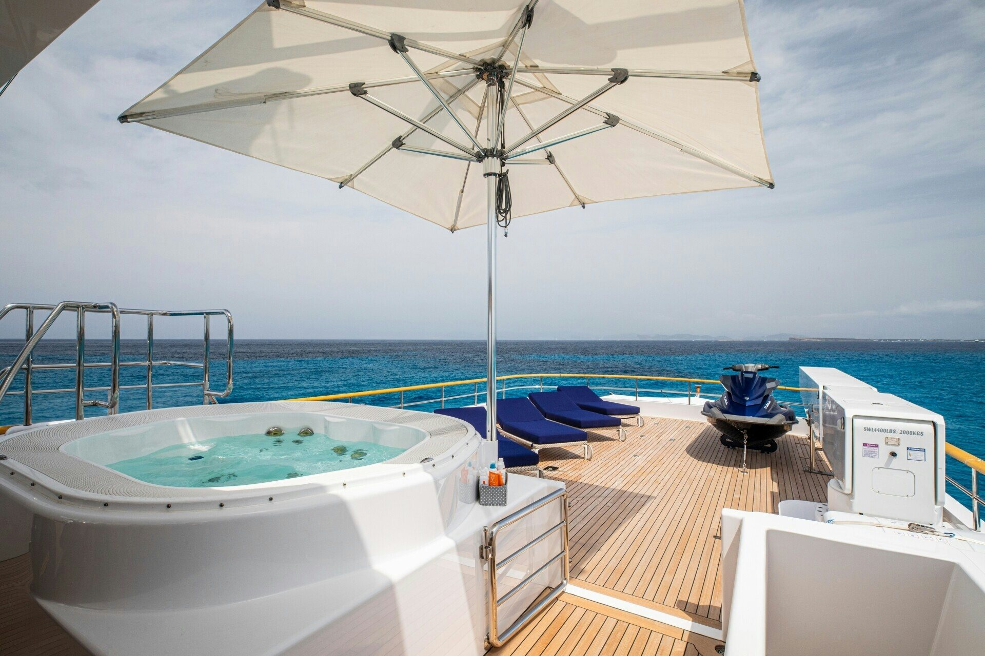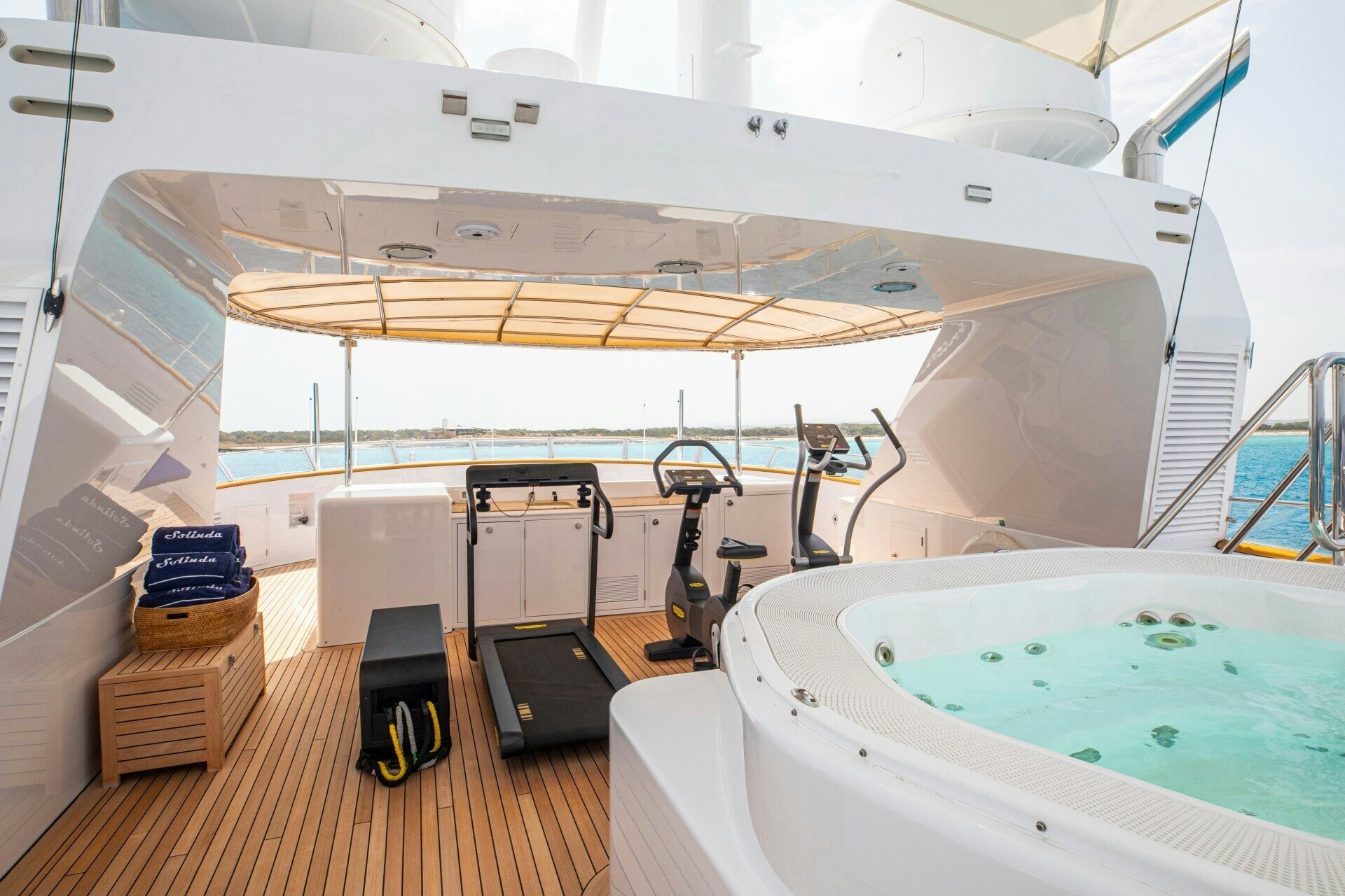 The outdoor spaces on SOLINDA are nothing short of spectacular. Her expansive sundecks are perfect for sunbathing or enjoying panoramic ocean views while cruising at her comfortable speed of 12 knots. An alfresco dining area allows guests to dine under the stars against the backdrop of endless sea horizons. A deck Jacuzzi provides a luxurious spot for relaxation, complemented by at-anchor stabilizers ensuring smooth and stable voyages even when stationary.