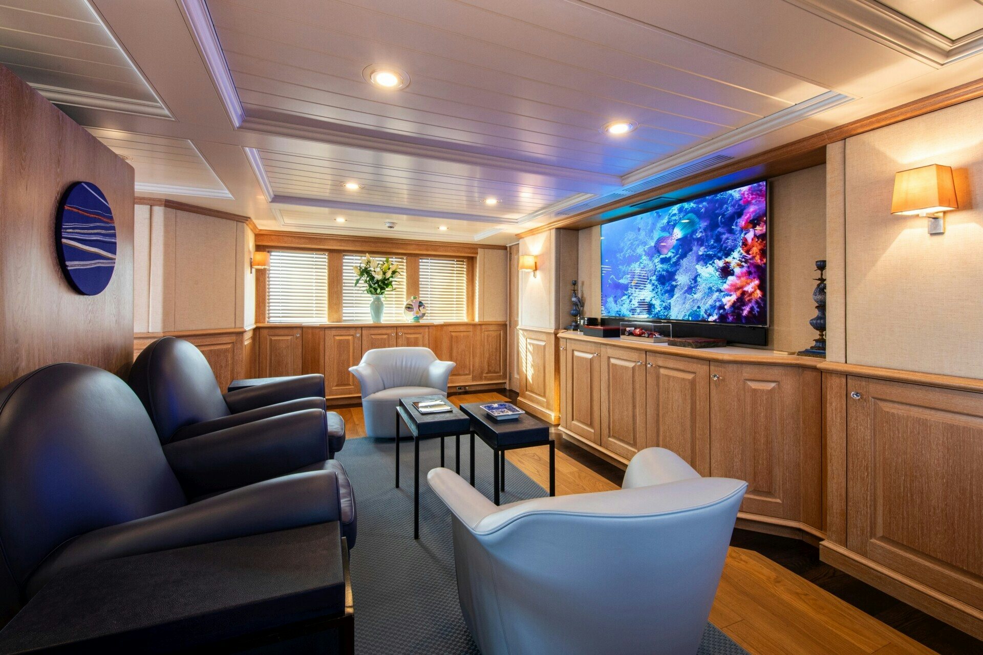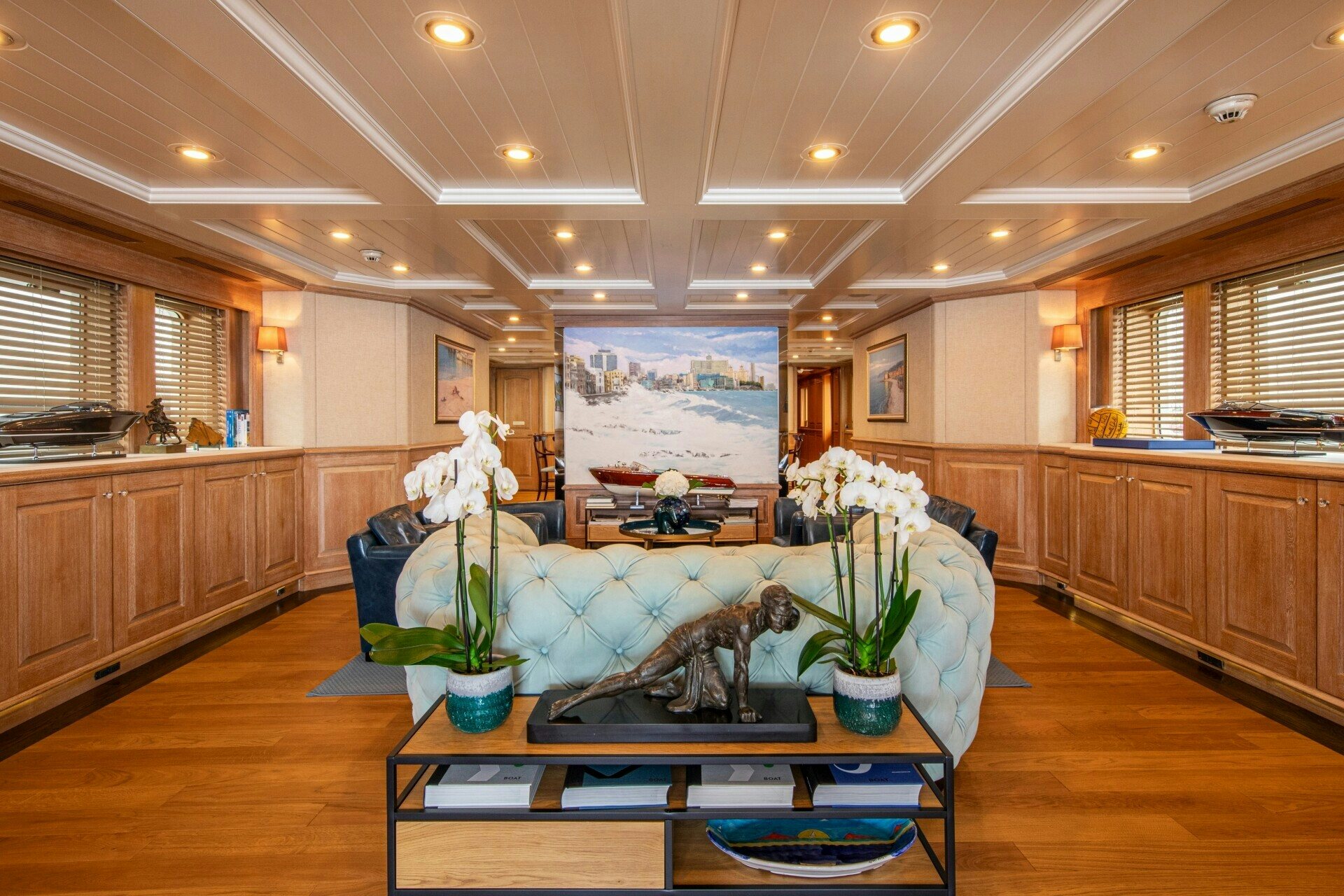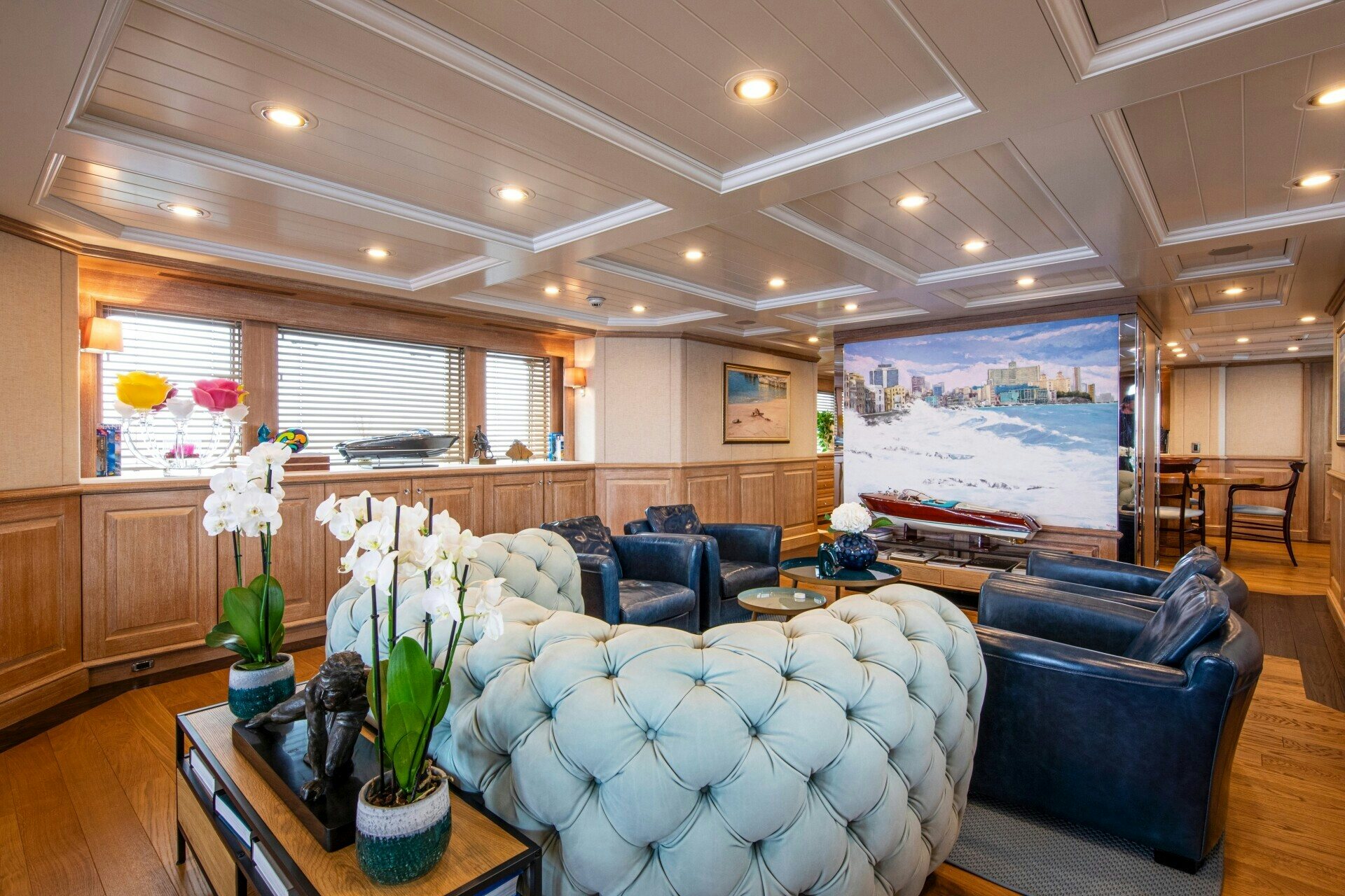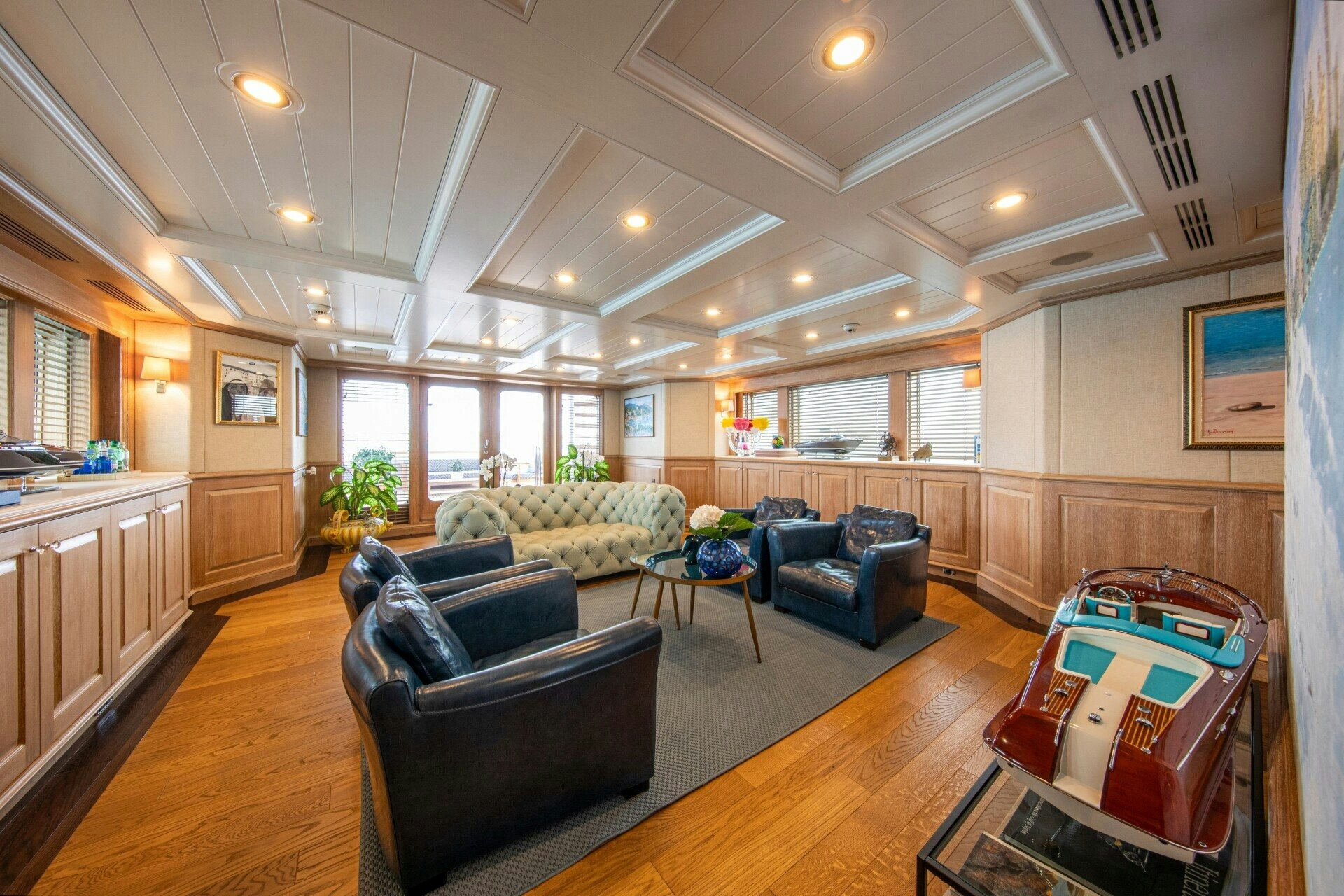 SOLINDA's interior extends beyond mere sleeping quarters; it’s a haven filled with state-of-the-art amenities designed to entertain, relax, and inspire its guests. A fully-equipped gym caters to fitness enthusiasts while fishing equipment adds adventurous flavor to your voyage on high seas or tranquil bays alike. For those who prefer indoor entertainment options, Wi-Fi connectivity ensures uninterrupted digital access whereas Kaleidescape offers an extensive library of movies at your fingertips.