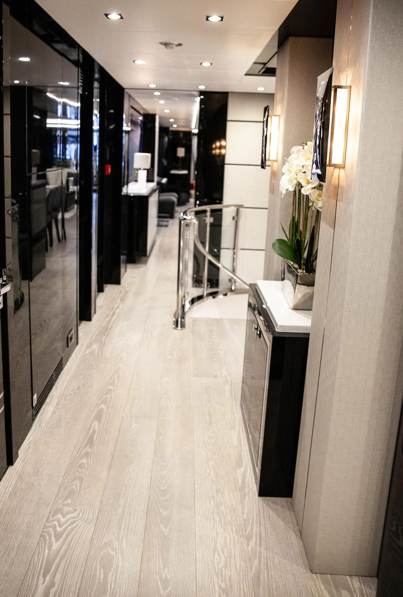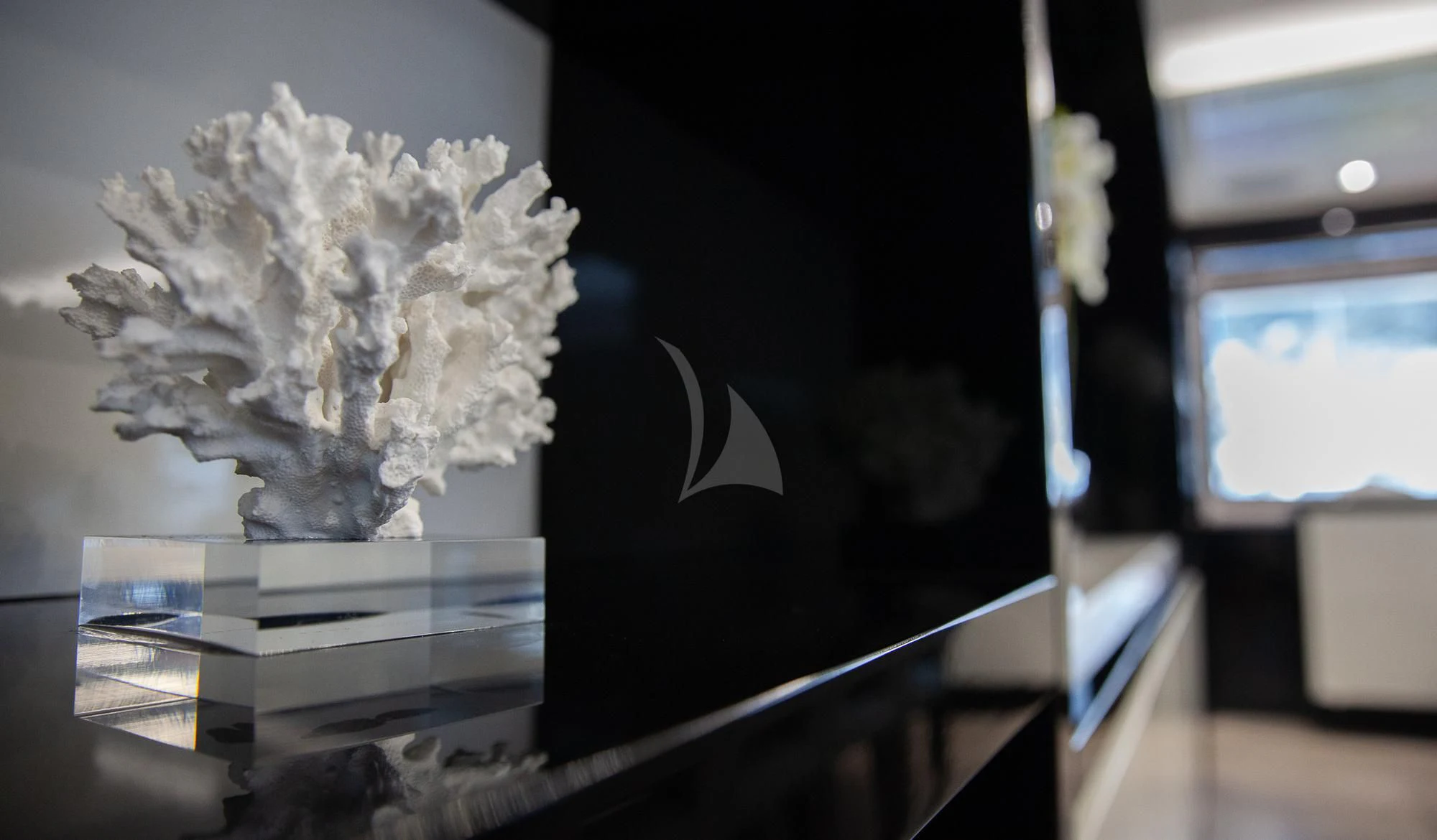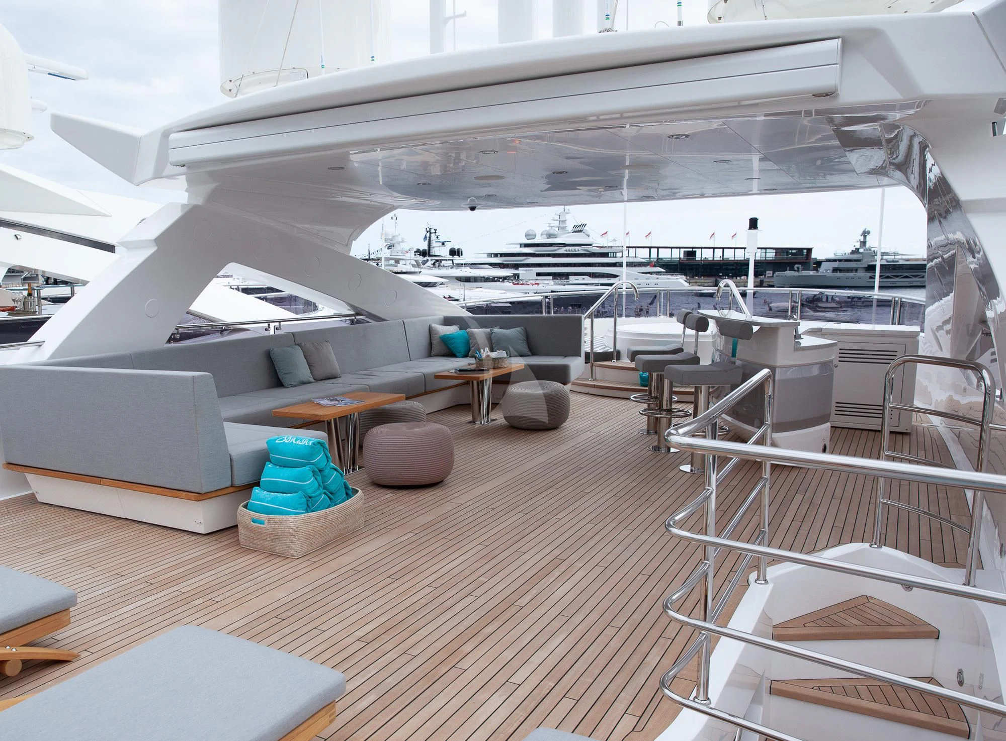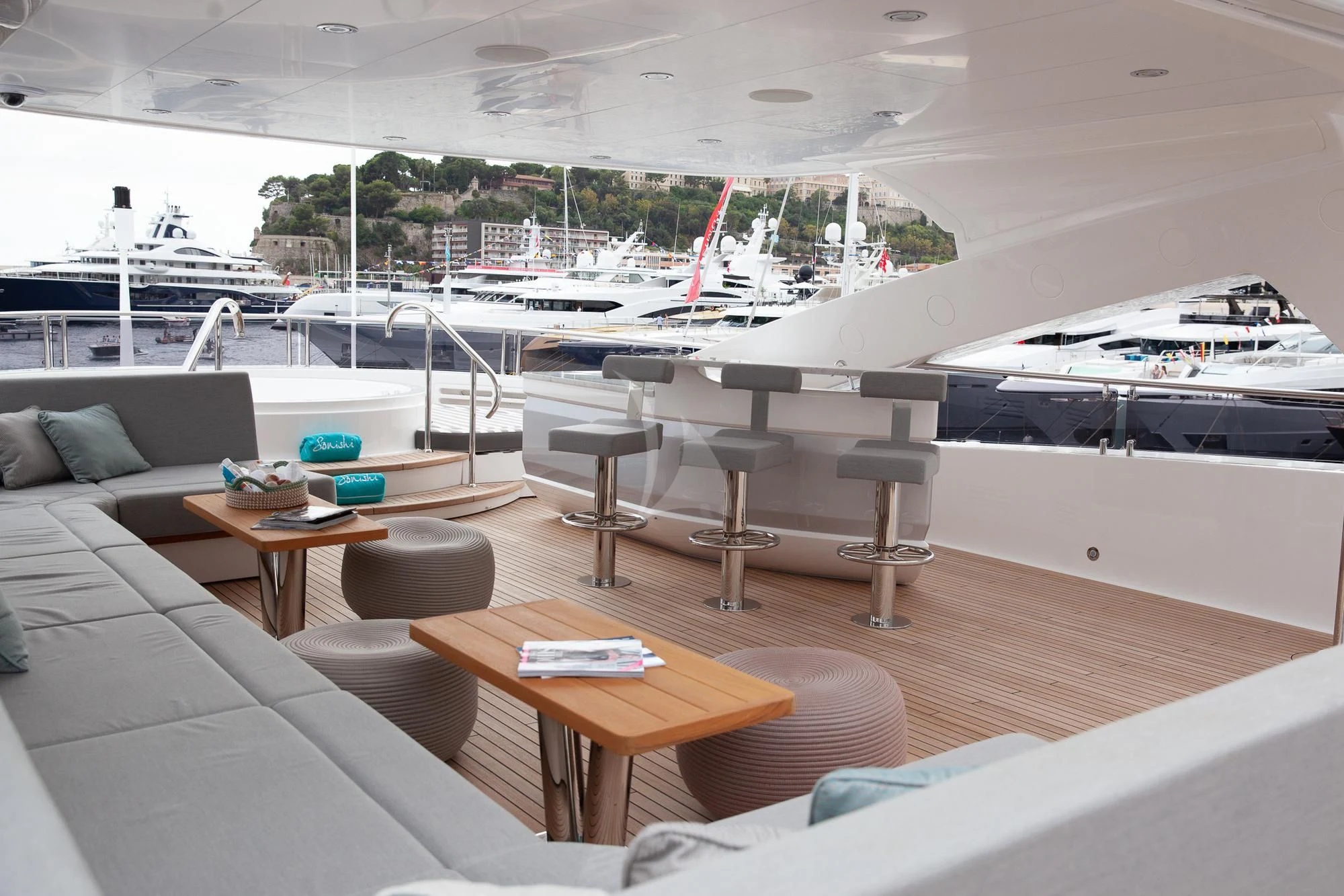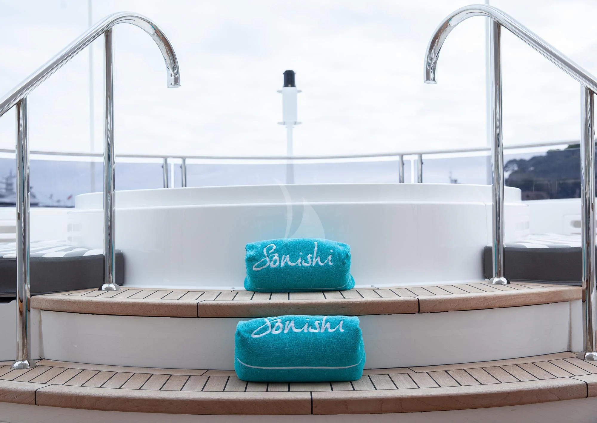 The exterior of SONISHI was designed with an eye for detail that is evident in every curve and line. The sundeck, one of her most notable features, invites guests to bask under the sun or unwind in the Jacuzzi while enjoying panoramic views of the oceanic horizon. Alfresco dining areas are elegantly arranged to offer both intimacy and grandeur, perfect for hosting lavish dinners under starlit skies or casual brunches bathed in morning sunlight.