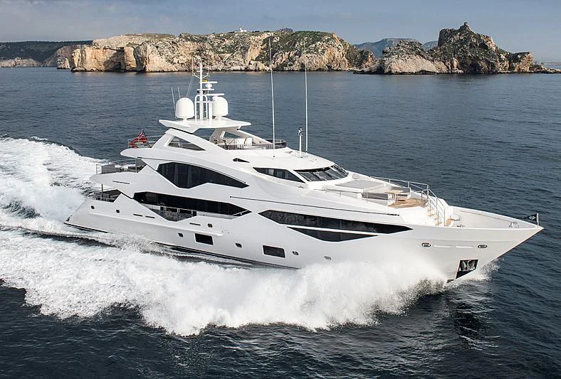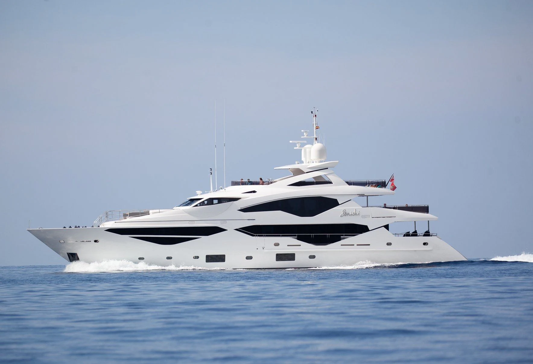 Unveiled in 2019 by the esteemed Sunseeker shipyard, the SONISHI is a paragon of contemporary design and technological prowess. With an impressive length of 131 feet (40.05 meters) and a beam stretching to 26 feet (8.09 meters), this semi-displacement motor yacht is a majestic sight on the water. Crafted from robust GRP material, her hull is not only striking but also offers superior performance and durability.