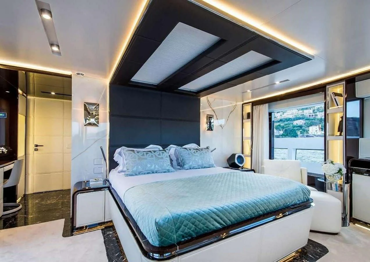 Filled with features, including a fold-down balcony on the main salon dining, panoramic views from the master cabin, a private forward lounging area forward of the master, jacuzzi on the sundeck, a back-lit onyx wall and handcrafted mosaics.