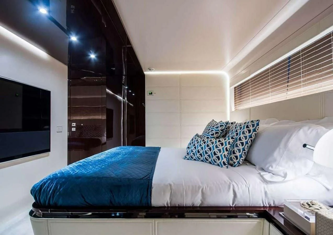 From the main deck aft exterior dining room, you arrive directly into the main salon, open to the interior dining and then forward to the galley, lobby, day head and then forward to the Master suite. The Master comprises a walk in dressing, ensuite with large shower and double sink, a full beam master bedroom with panoramic views forward to a secluded sunbathing area with access directly from the master.