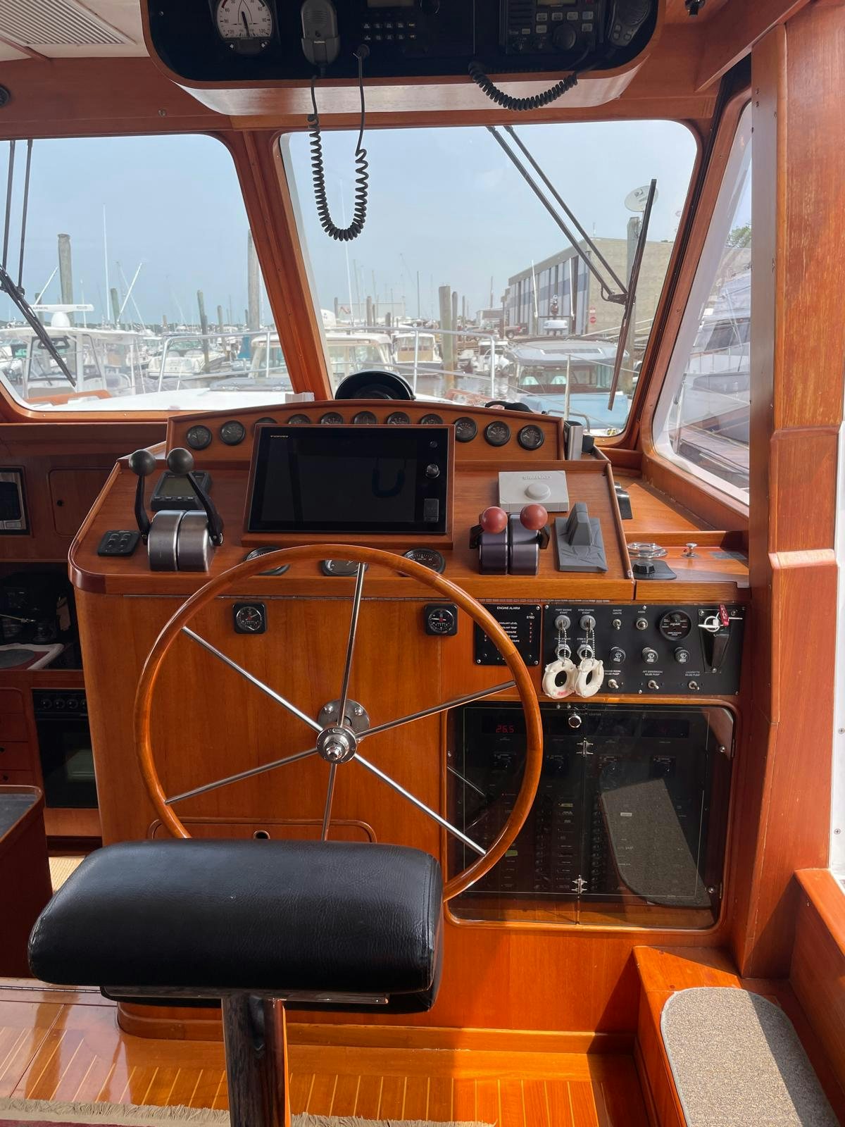 Her interior layout offers notable volume for a yacht of this size, thanks to a fully open salon, helm, and galley arrangement. Varnished teak joinerwork and teak-and-holly soles provide a classic finish, while large windows at the pilothouse level add natural light and visibility. The salon includes two leather chairs, an L-shaped settee, a custom drop-leaf table, and a dedicated office area. The galley, just a few steps down, features stainless countertops, cold plate refrigeration and freezer, Miele range and oven, and ample storage including a pantry with a washer/dryer.