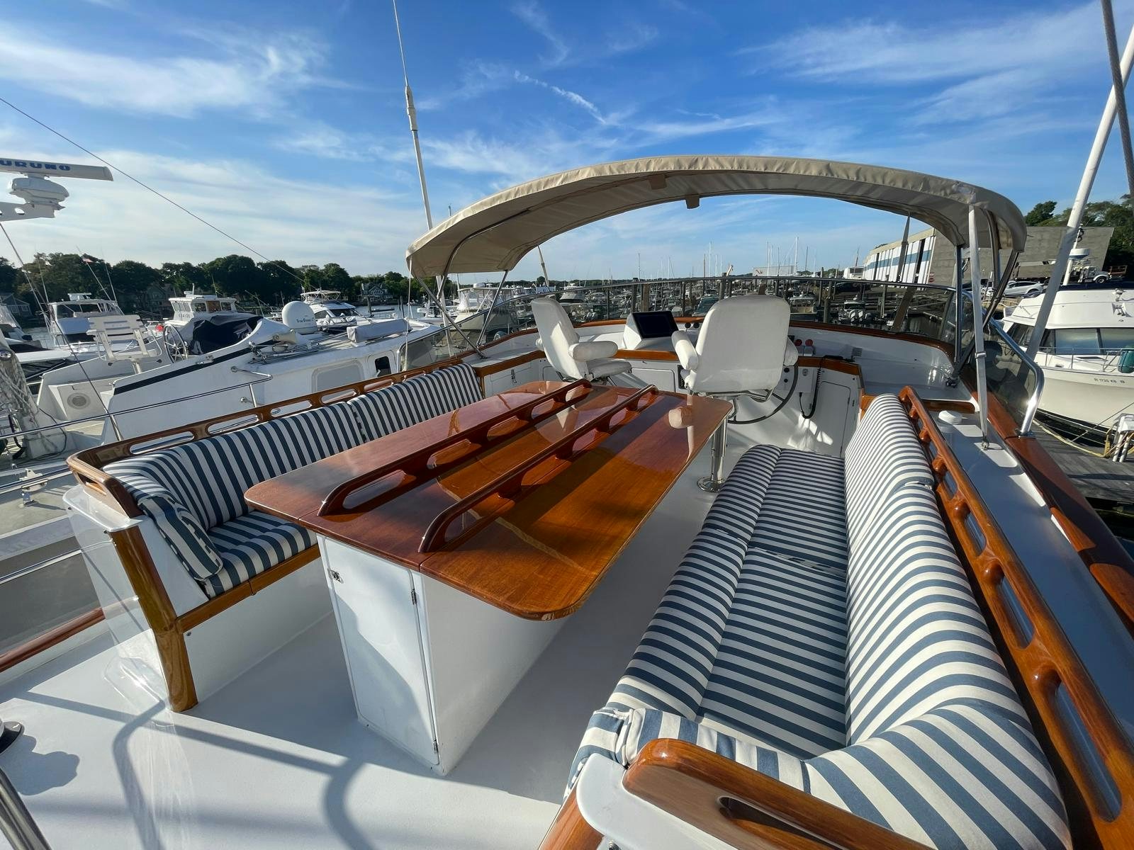 Powered by twin diesels with a new port engine installed in 2021, she cruises comfortably at 26 knots with a top speed of 28 knots. The hull form delivers a remarkably smooth and stable ride offshore, and she remains mechanically sound and ready for her next chapter. From 2006 through 2020, SOUTHERLY was used seasonally on the U.S. East Coast and kept in top condition by a knowledgeable owner. Since 2021, she’s seen light use and careful yard maintenance at Wickford Shipyard.