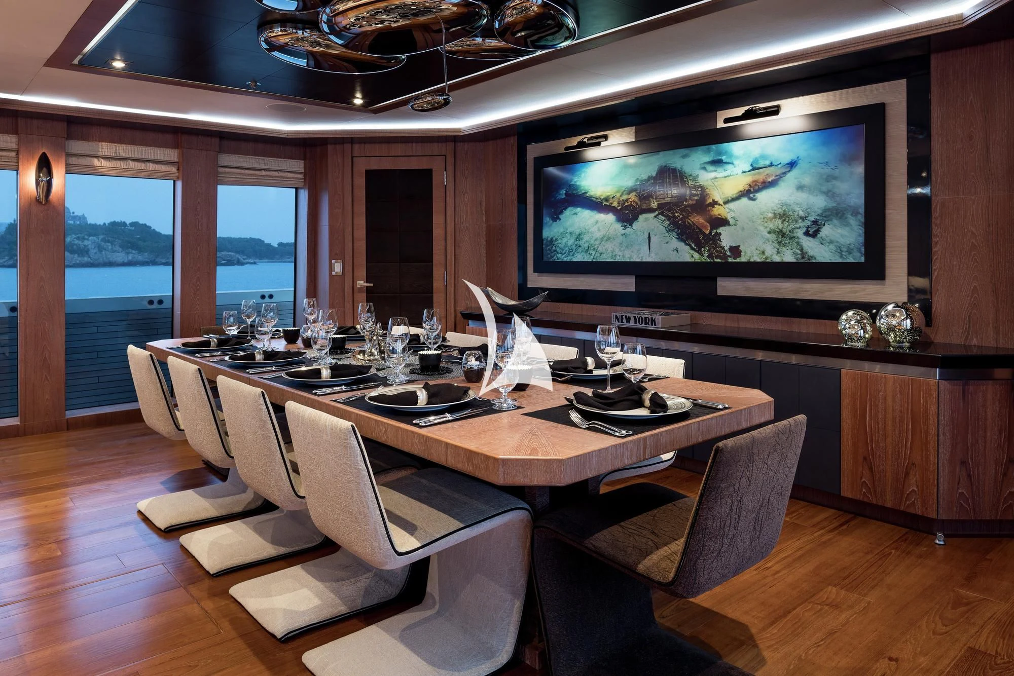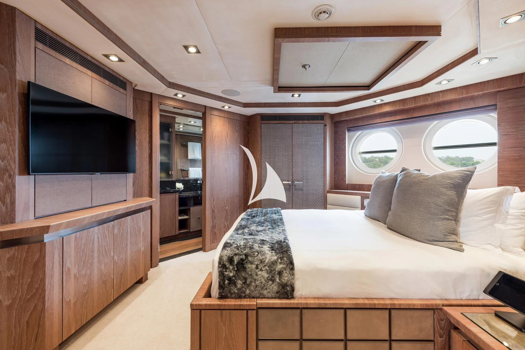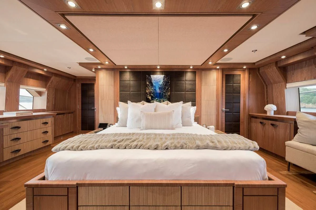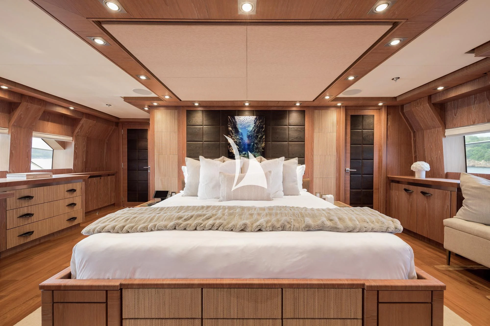 Inside STEALTH, you'll find an interior as striking as its exterior. The design exudes contemporary sophistication through its clean lines and high-quality finishes. A color palette dominated by neutral tones enhances the sense of space while allowing pops of color to add warmth and personality to each room. Five spacious cabins comfortably accommodate up to twelve guests in unrivaled luxury; each one thoughtfully designed to ensure maximum comfort during your voyage.