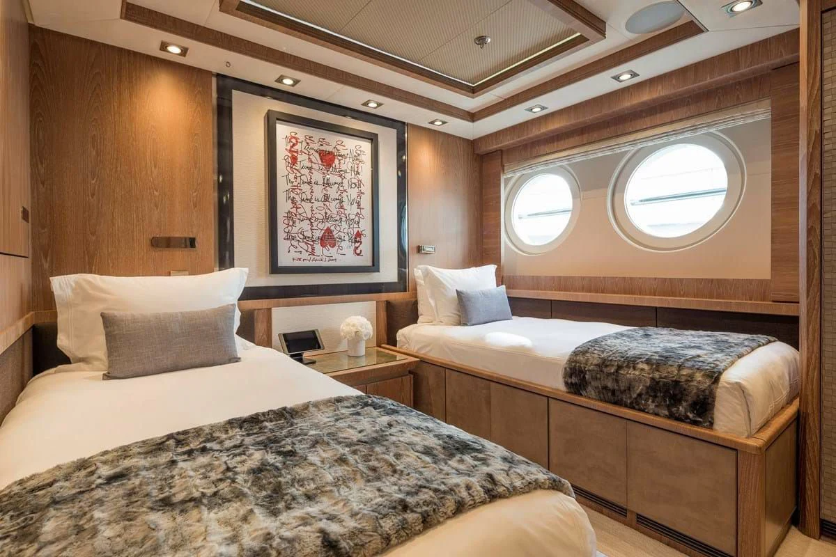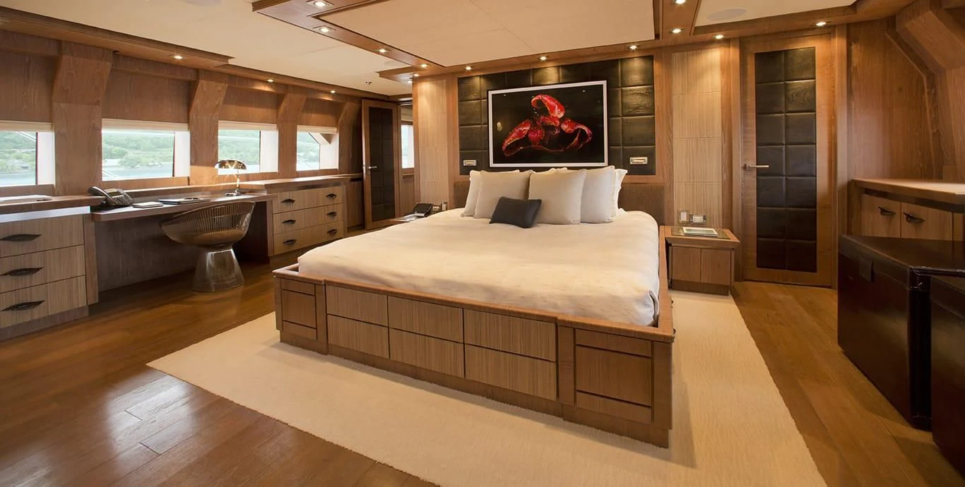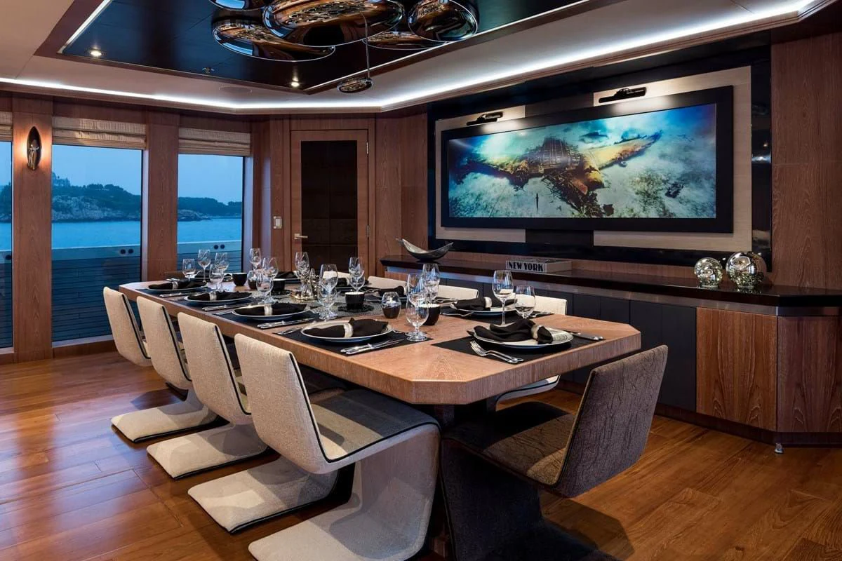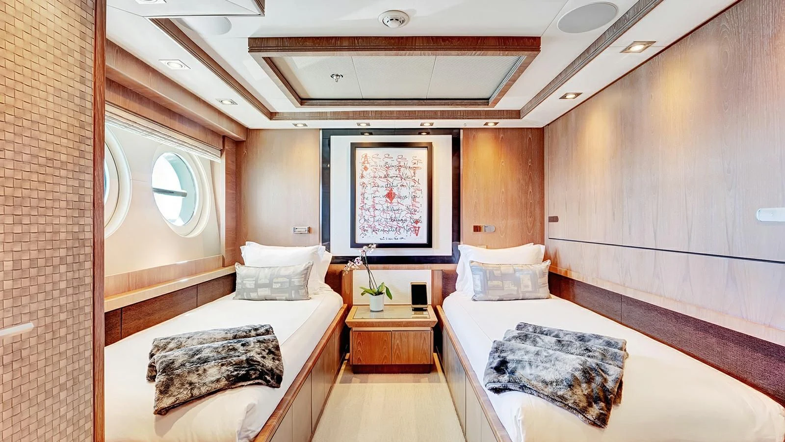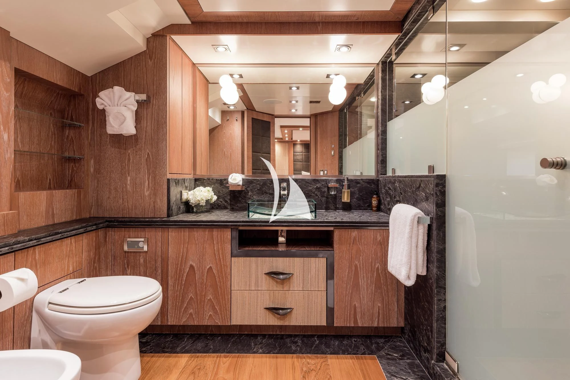 Inside STEALTH, you'll find an interior as striking as its exterior. The design exudes contemporary sophistication through its clean lines and high-quality finishes. A color palette dominated by neutral tones enhances the sense of space while allowing pops of color to add warmth and personality to each room. Five spacious cabins comfortably accommodate up to twelve guests in unrivaled luxury; each one thoughtfully designed to ensure maximum comfort during your voyage.