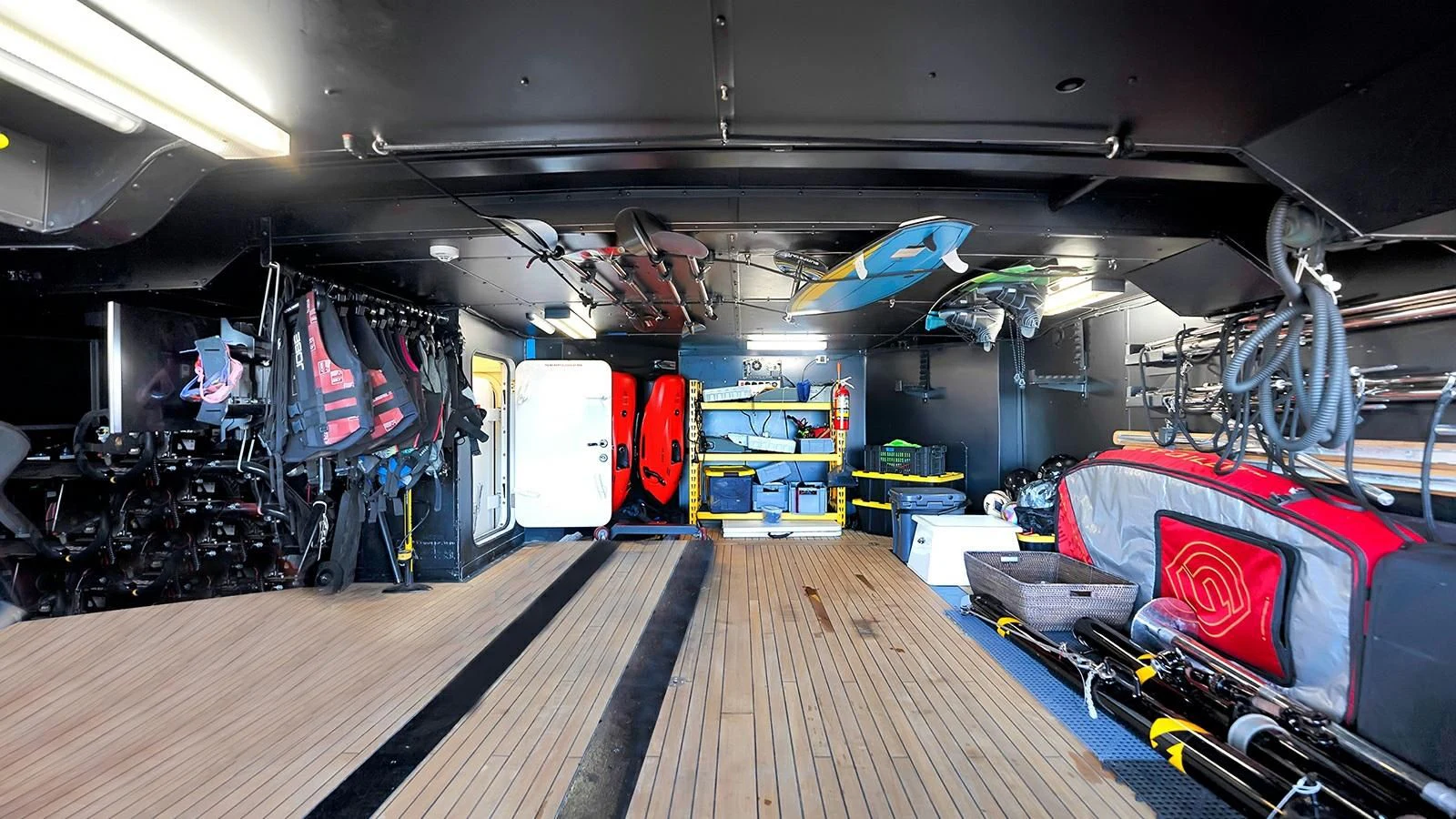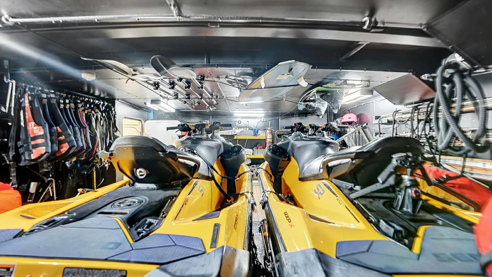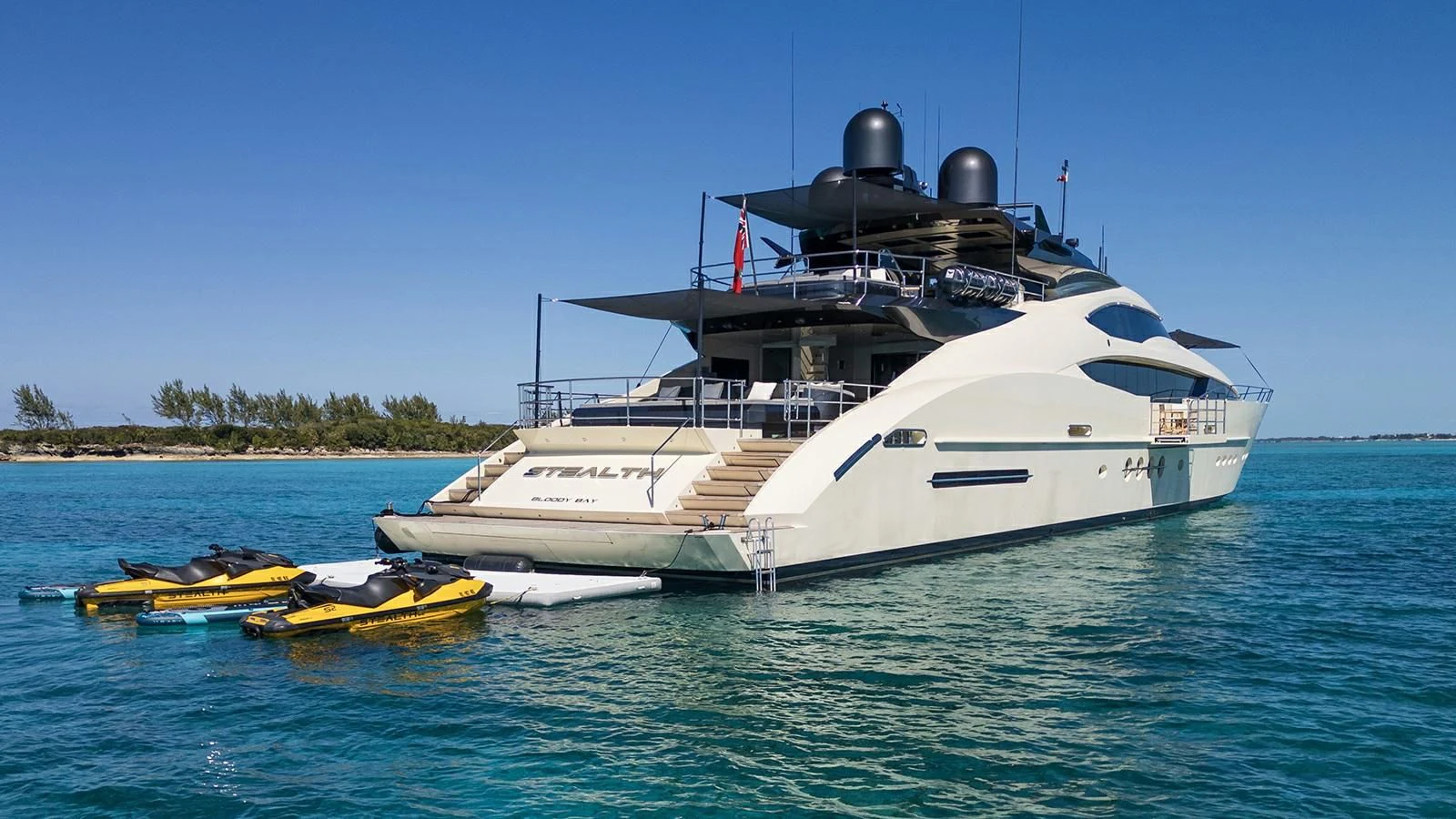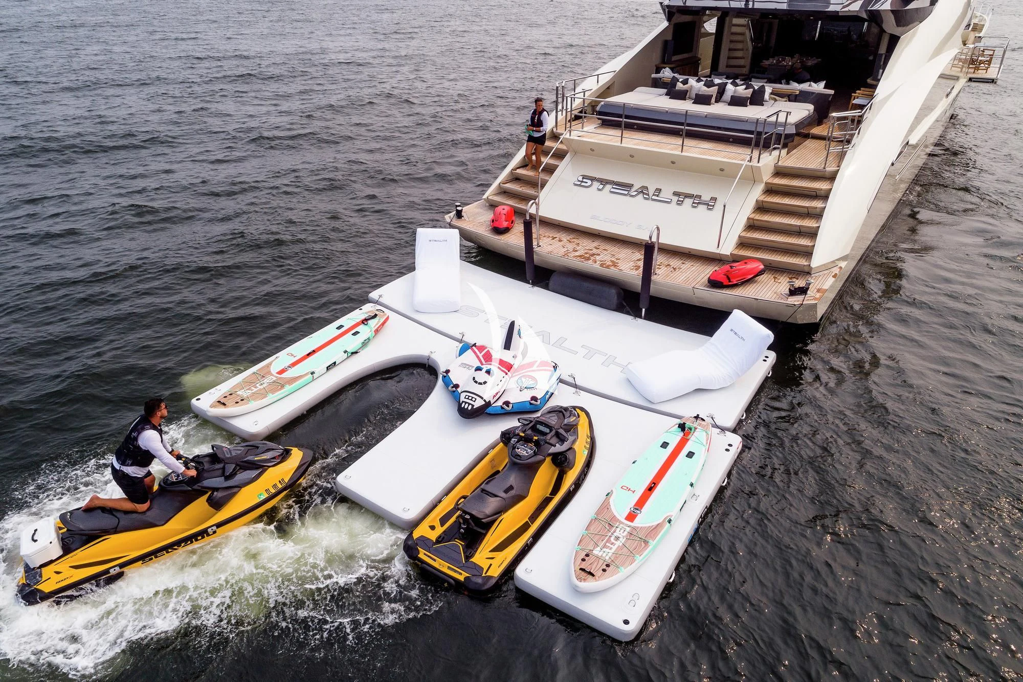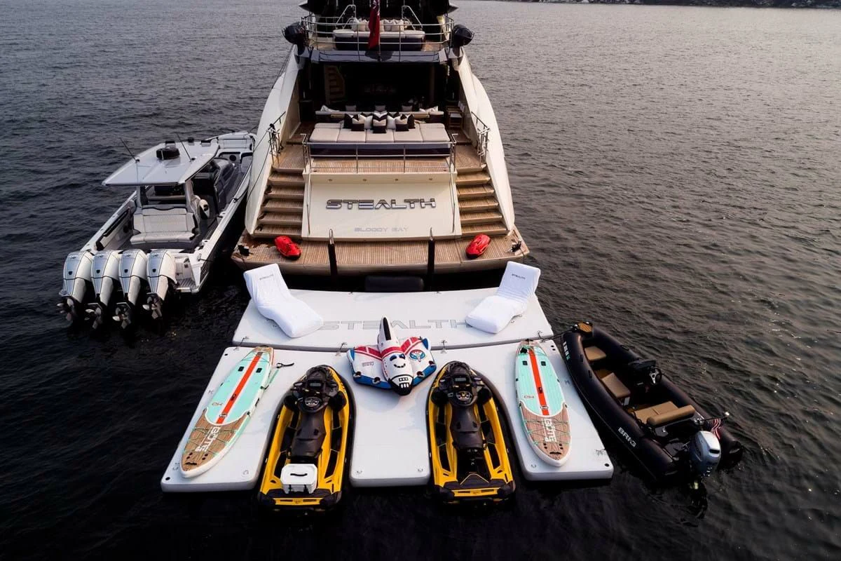 As expected from such a distinguished vessel, STEALTH is equipped with state-of-the-art amenities ensuring every journey is filled with exceptional experiences. A tender garage houses personal watercrafts for adrenaline-fueled fun on the water while onboard stabilizers provide smooth cruising at all times. Wi-Fi connectivity ensures guests remain connected while Kaleidescape entertainment systems offer endless options for leisure and relaxation.