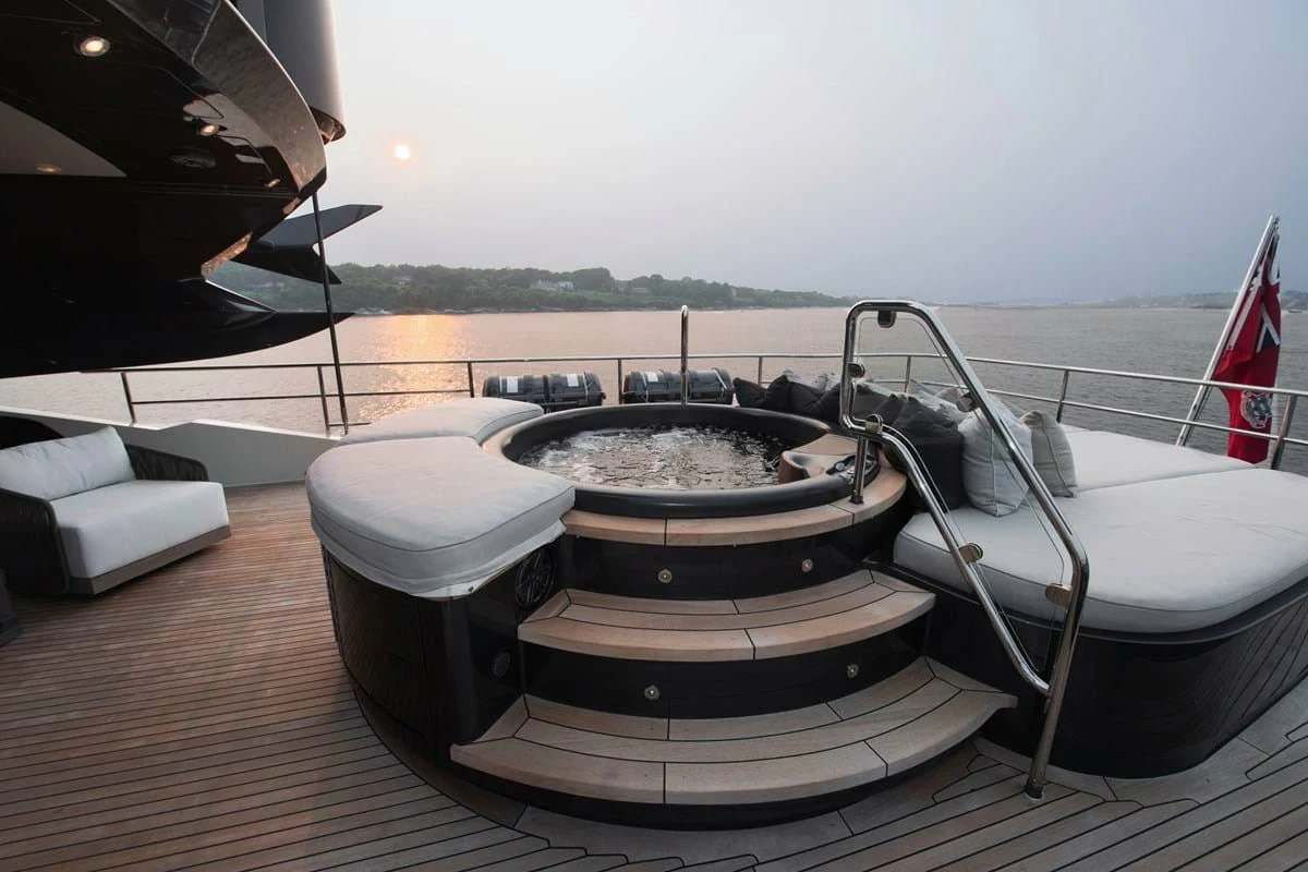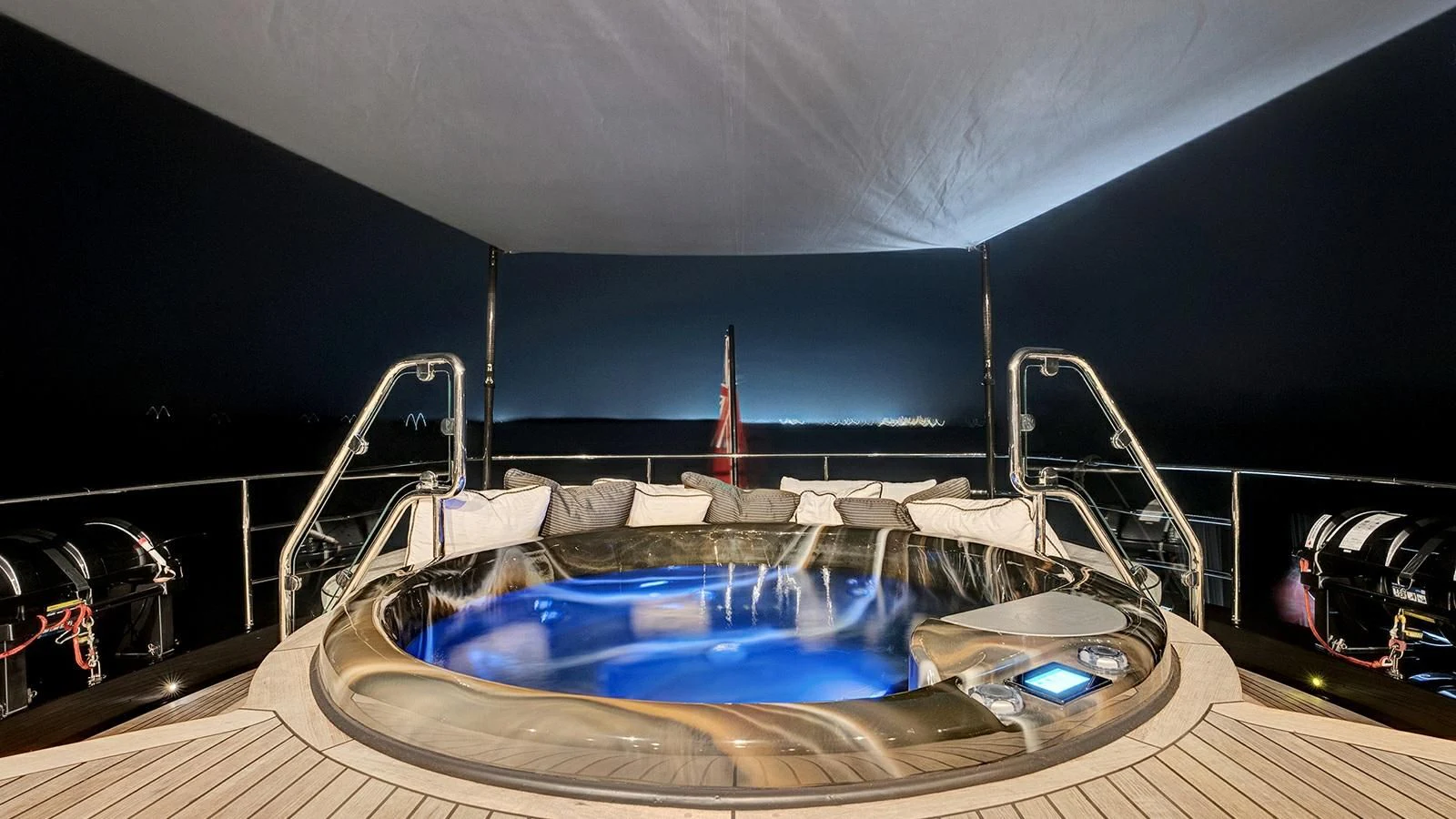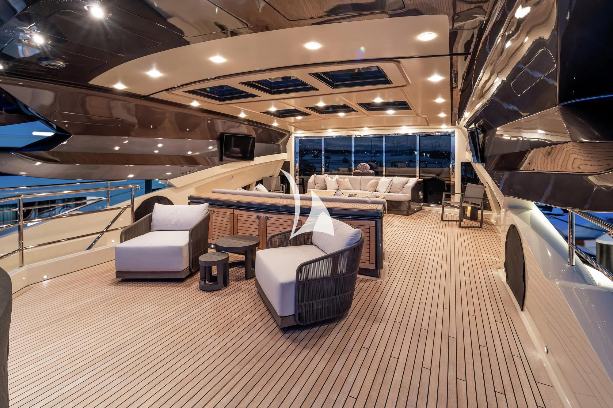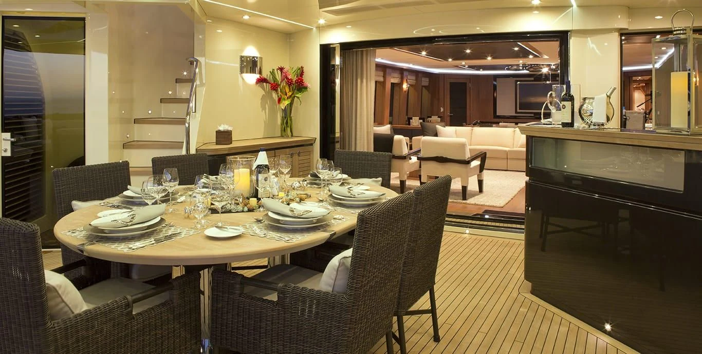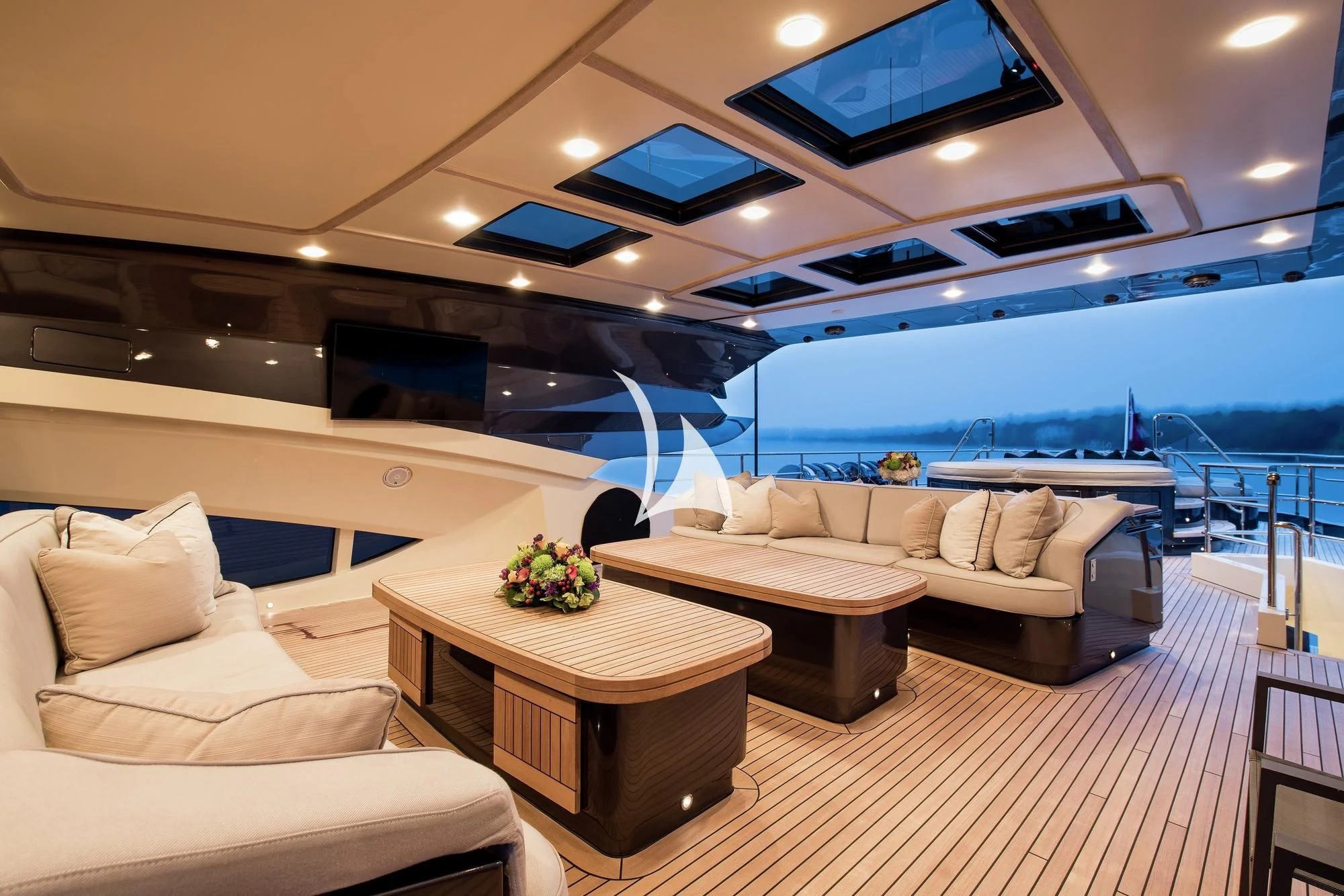 The yacht's exterior spaces are nothing short of spectacular. The sundeck is a haven for sun worshippers, complete with plush loungers and a luxurious Jacuzzi offering panoramic views of the surrounding seascape. Alfresco dining areas invite guests to savor gourmet meals under the stars while enjoying the gentle ocean breeze. At nightfall, these outdoor spaces transform into perfect venues for cocktail parties or intimate gatherings under the starlit sky.
