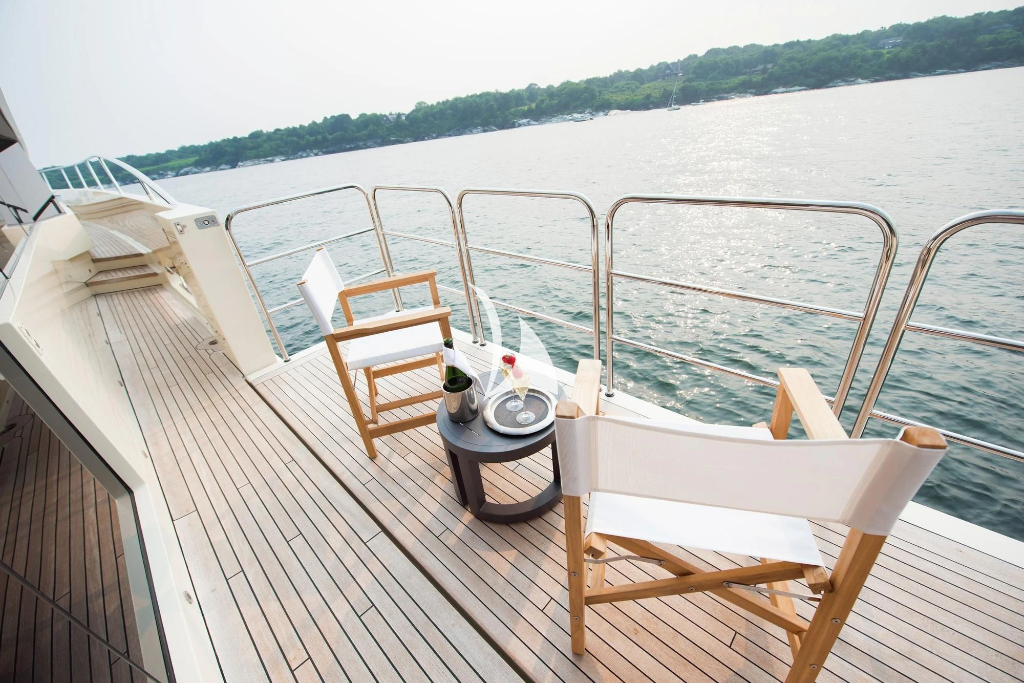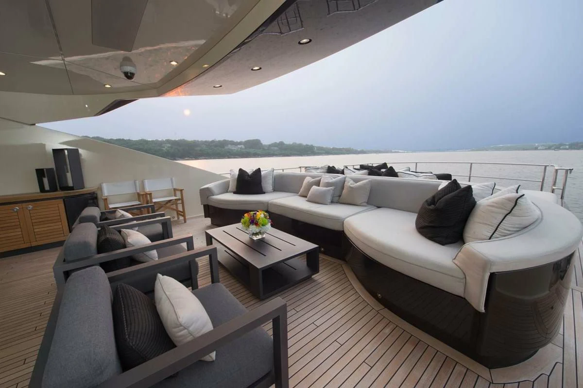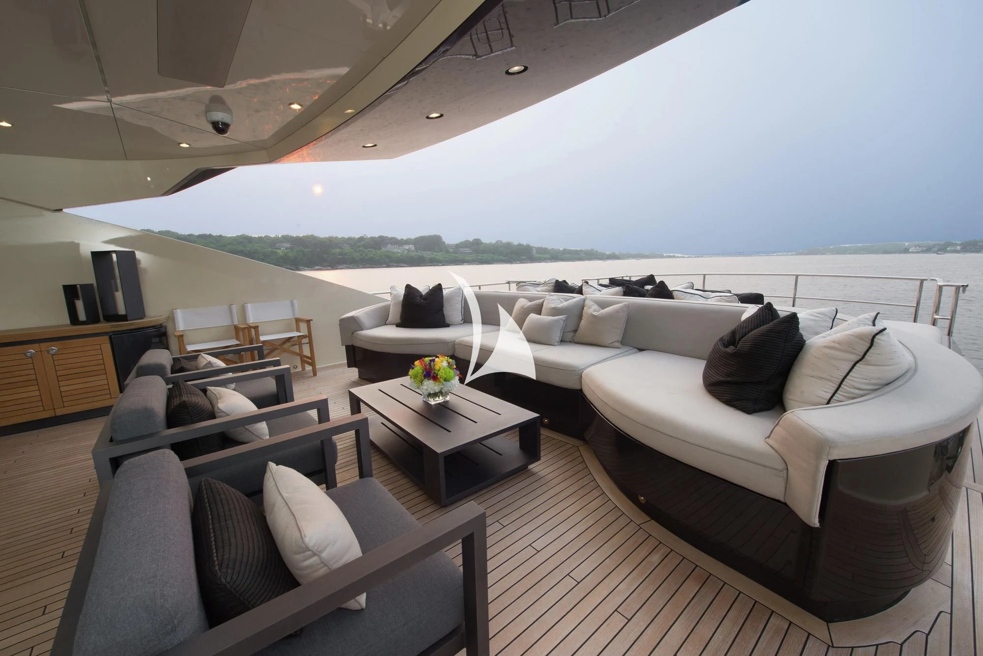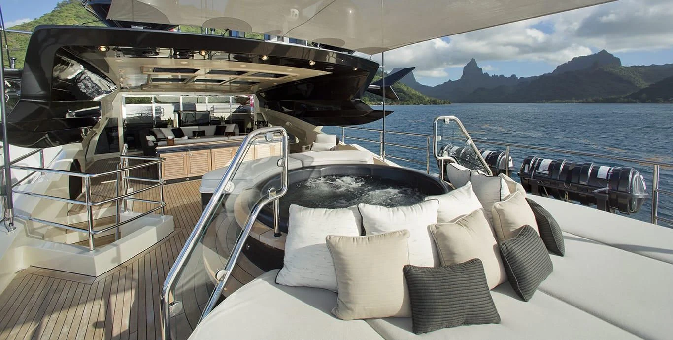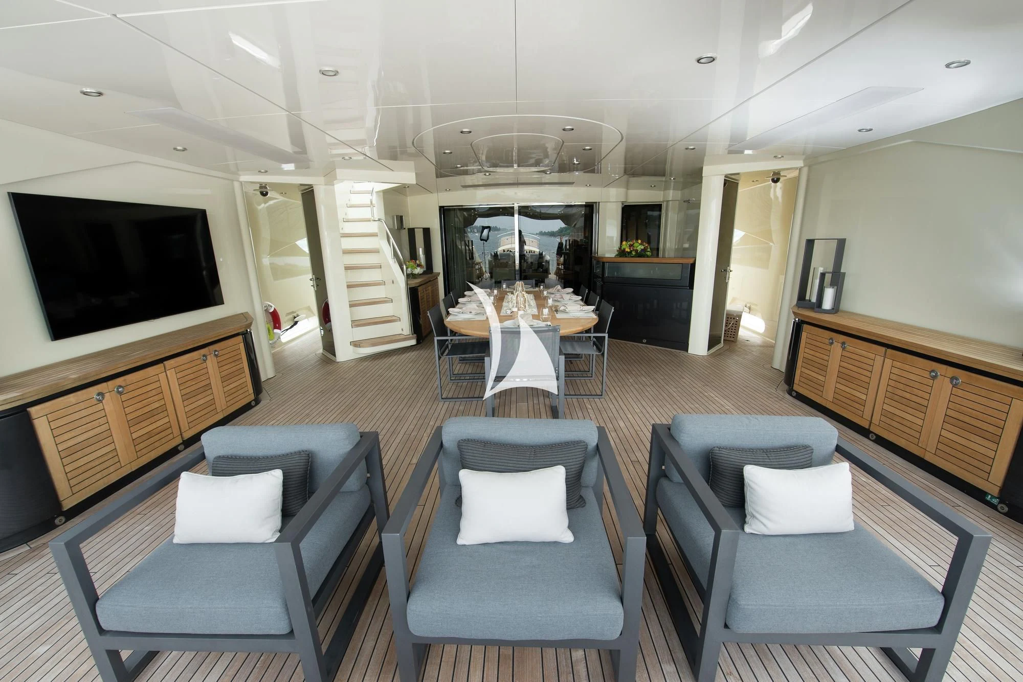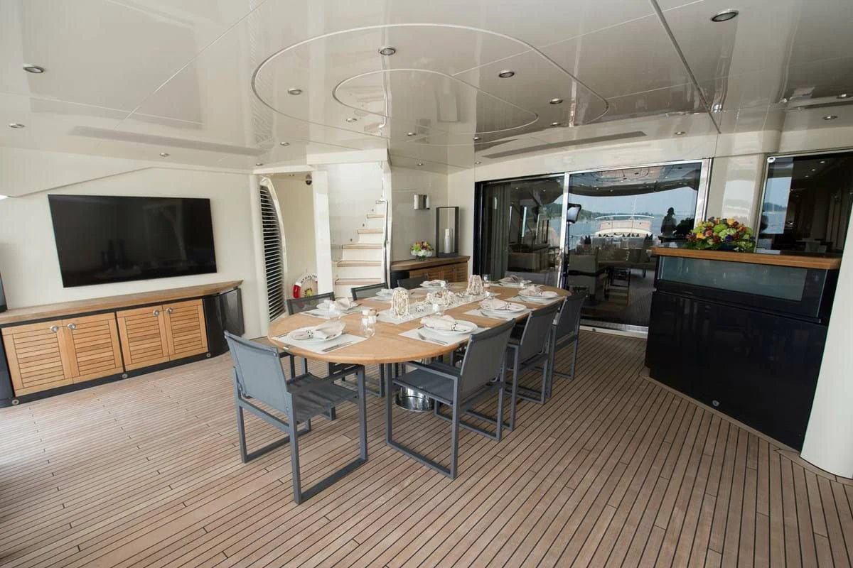 The yacht's exterior spaces are nothing short of spectacular. The sundeck is a haven for sun worshippers, complete with plush loungers and a luxurious Jacuzzi offering panoramic views of the surrounding seascape. Alfresco dining areas invite guests to savor gourmet meals under the stars while enjoying the gentle ocean breeze. At nightfall, these outdoor spaces transform into perfect venues for cocktail parties or intimate gatherings under the starlit sky.
