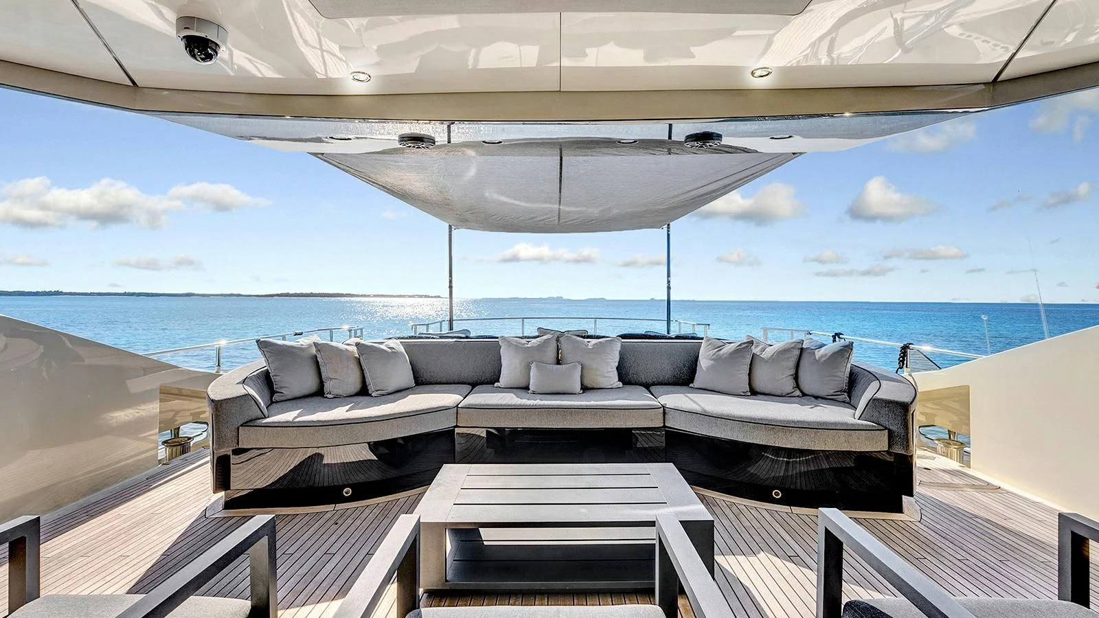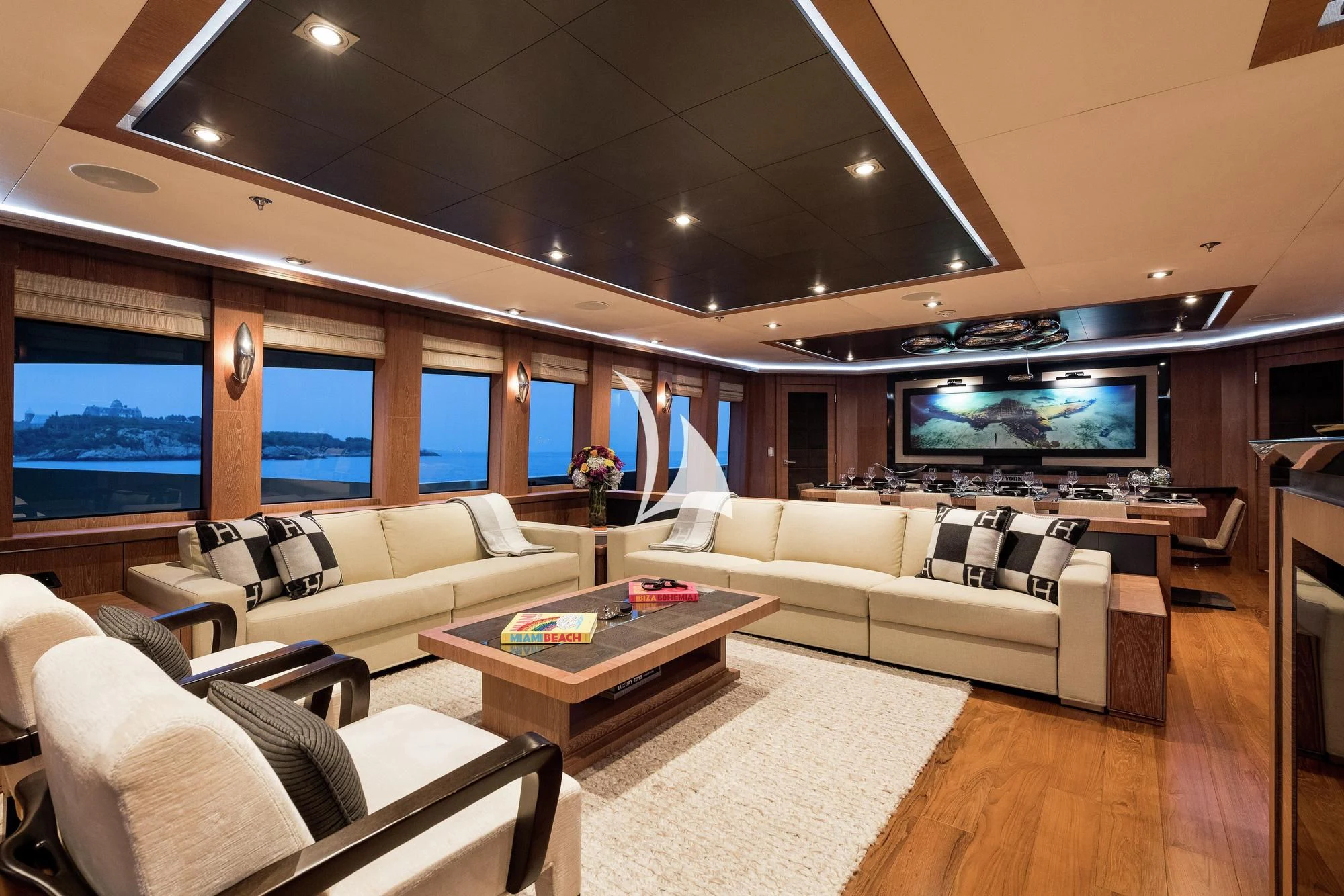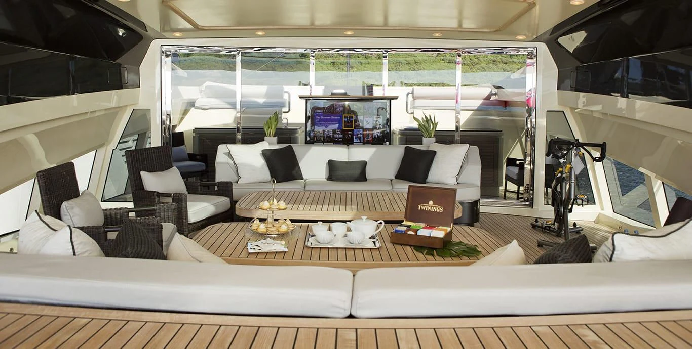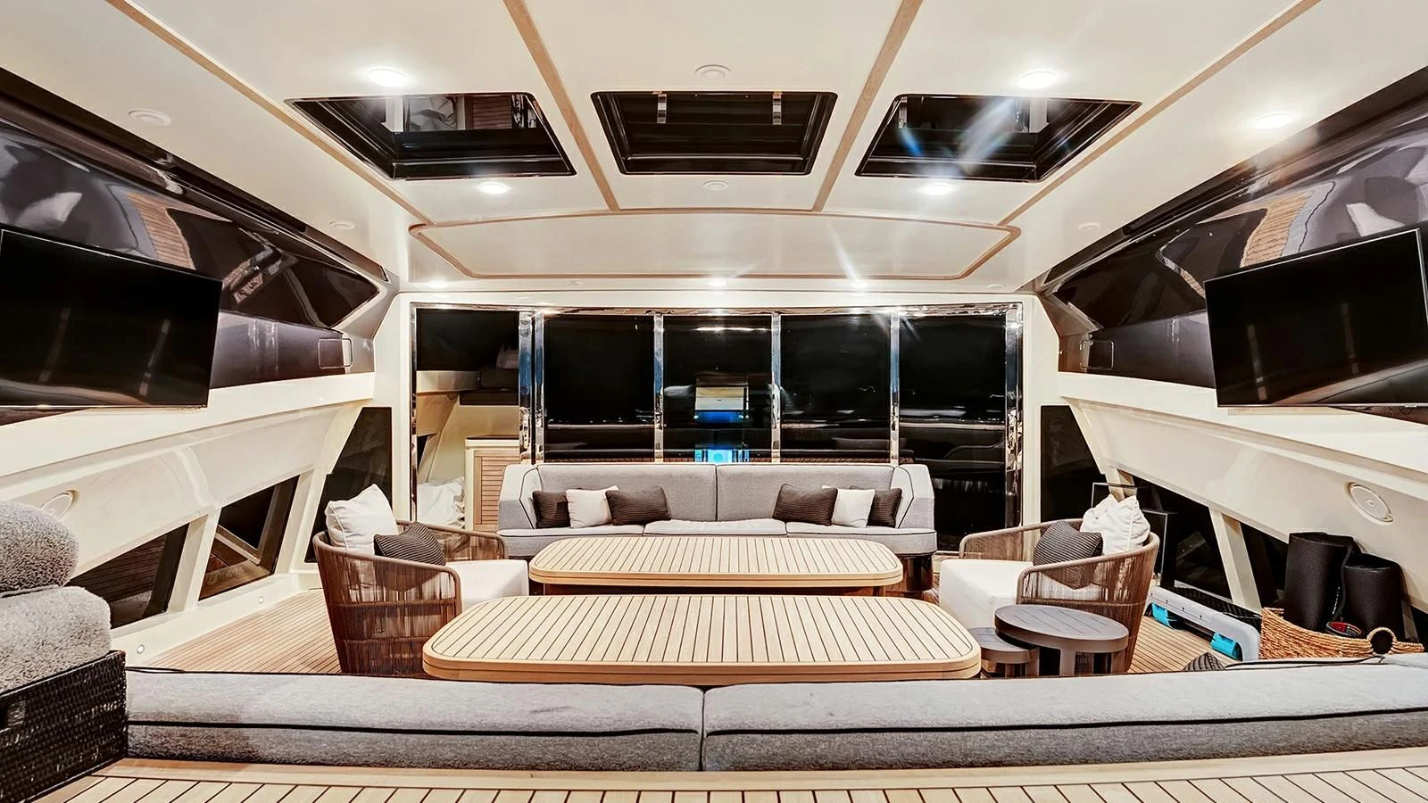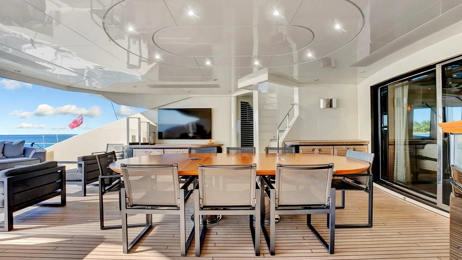 The yacht's exterior spaces are nothing short of spectacular. The sundeck is a haven for sun worshippers, complete with plush loungers and a luxurious Jacuzzi offering panoramic views of the surrounding seascape. Alfresco dining areas invite guests to savor gourmet meals under the stars while enjoying the gentle ocean breeze. At nightfall, these outdoor spaces transform into perfect venues for cocktail parties or intimate gatherings under the starlit sky.