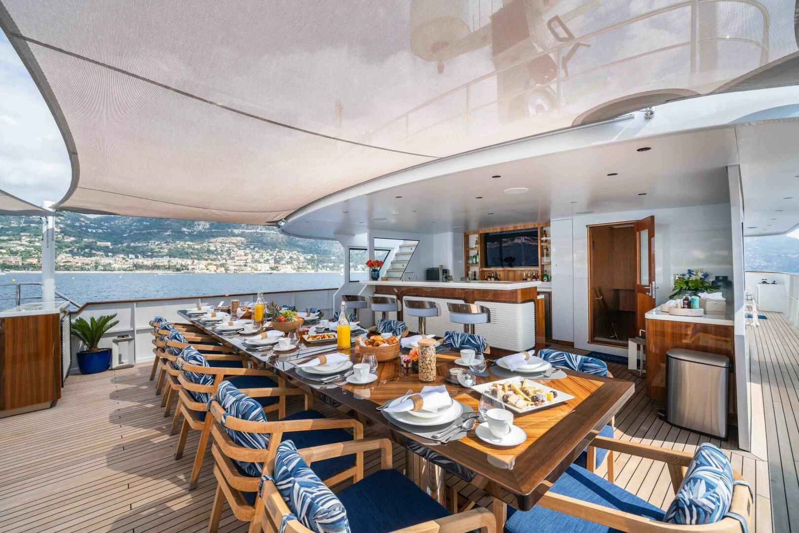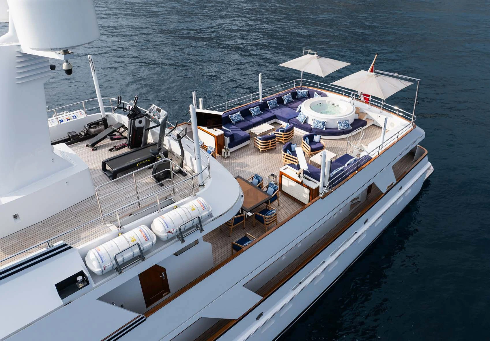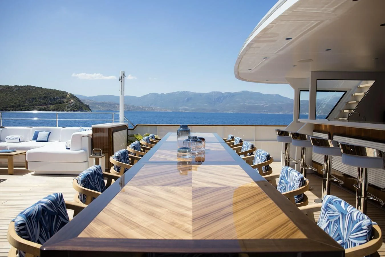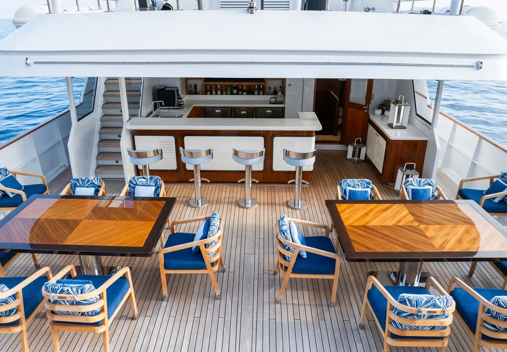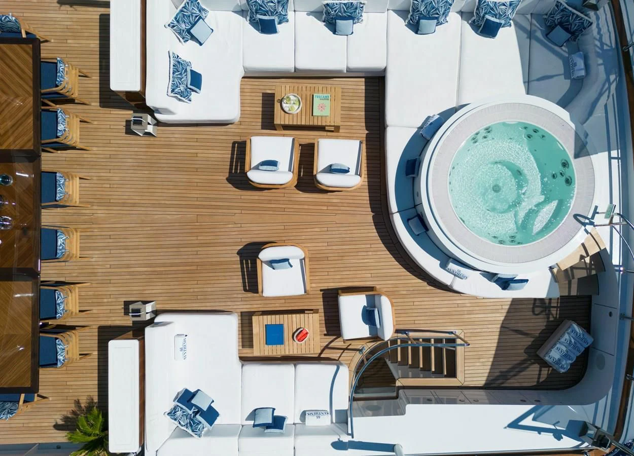 However, the masterpiece of the refit is undoubtedly her newly redesigned bridge deck. A Jacuzzi can now be found aft surrounded by sun beds and seating. Forward is an alfresco dining area that can be split into two distinct tables or combined for bigger groups. A large bar completes the space. Above, the sundeck houses gym equipment with pilot seats for guests to enjoy whilst cruising.