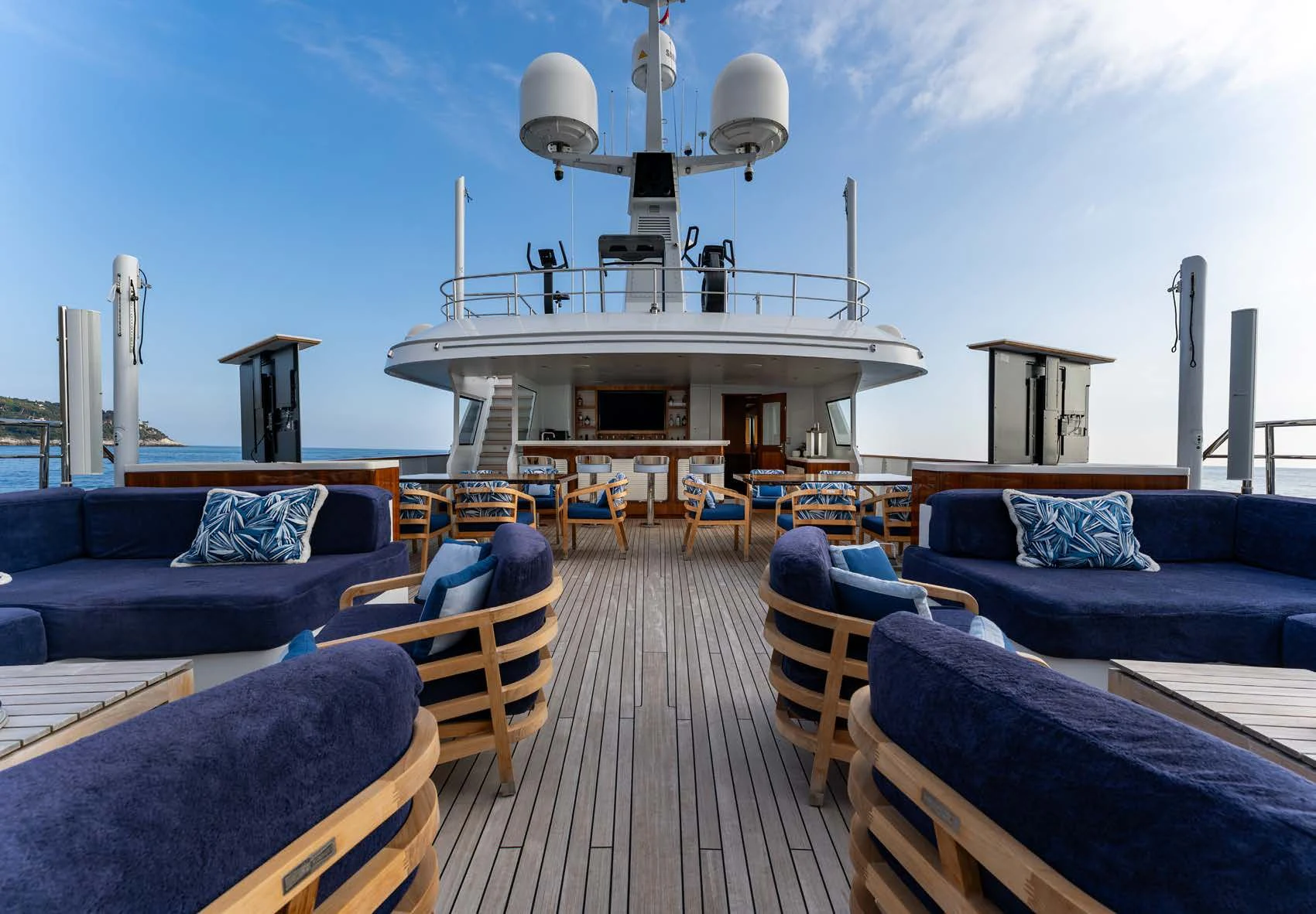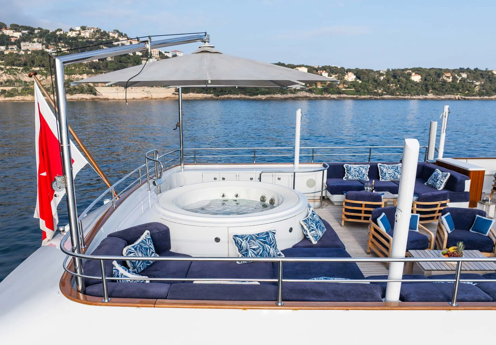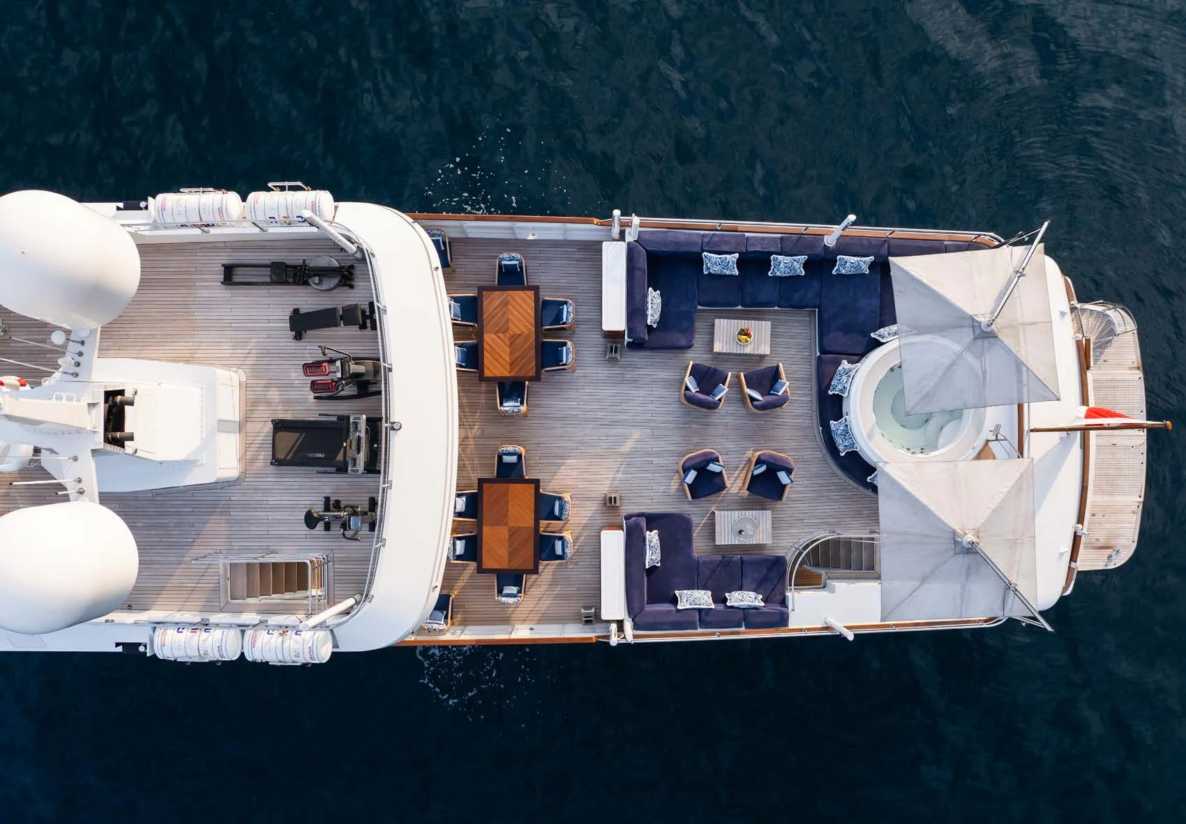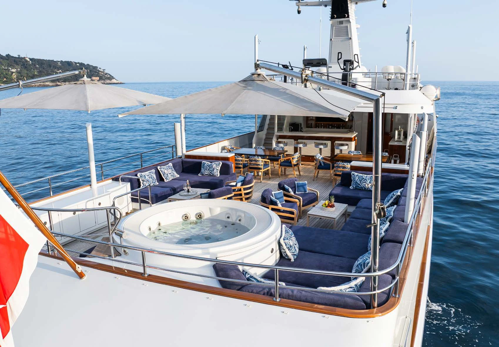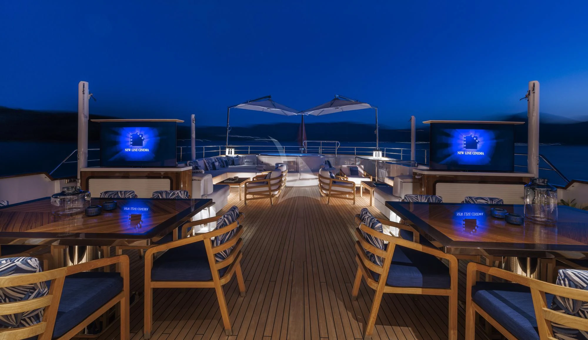 However, the masterpiece of the refit is undoubtedly her newly redesigned bridge deck. A Jacuzzi can now be found aft surrounded by sun beds and seating. Forward is an alfresco dining area that can be split into two distinct tables or combined for bigger groups. A large bar completes the space. Above, the sundeck houses gym equipment with pilot seats for guests to enjoy whilst cruising.