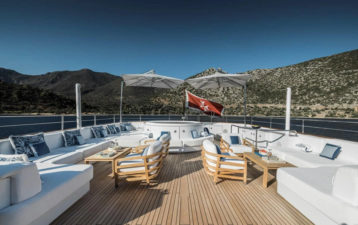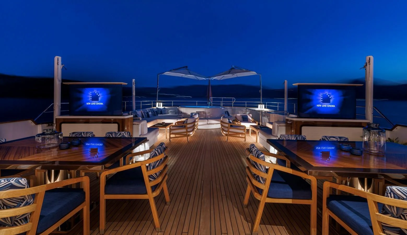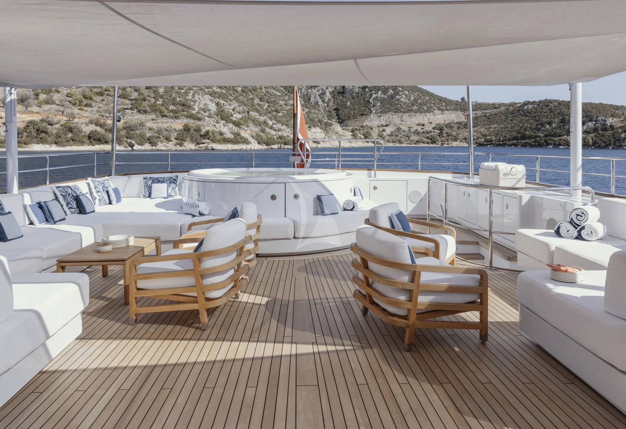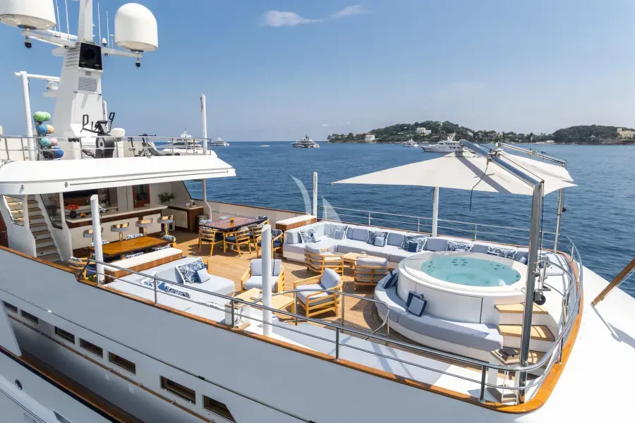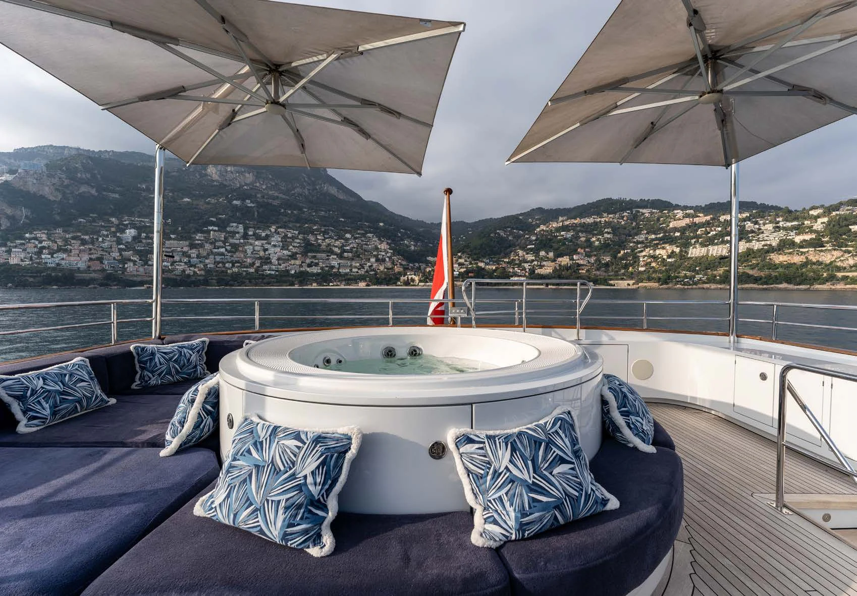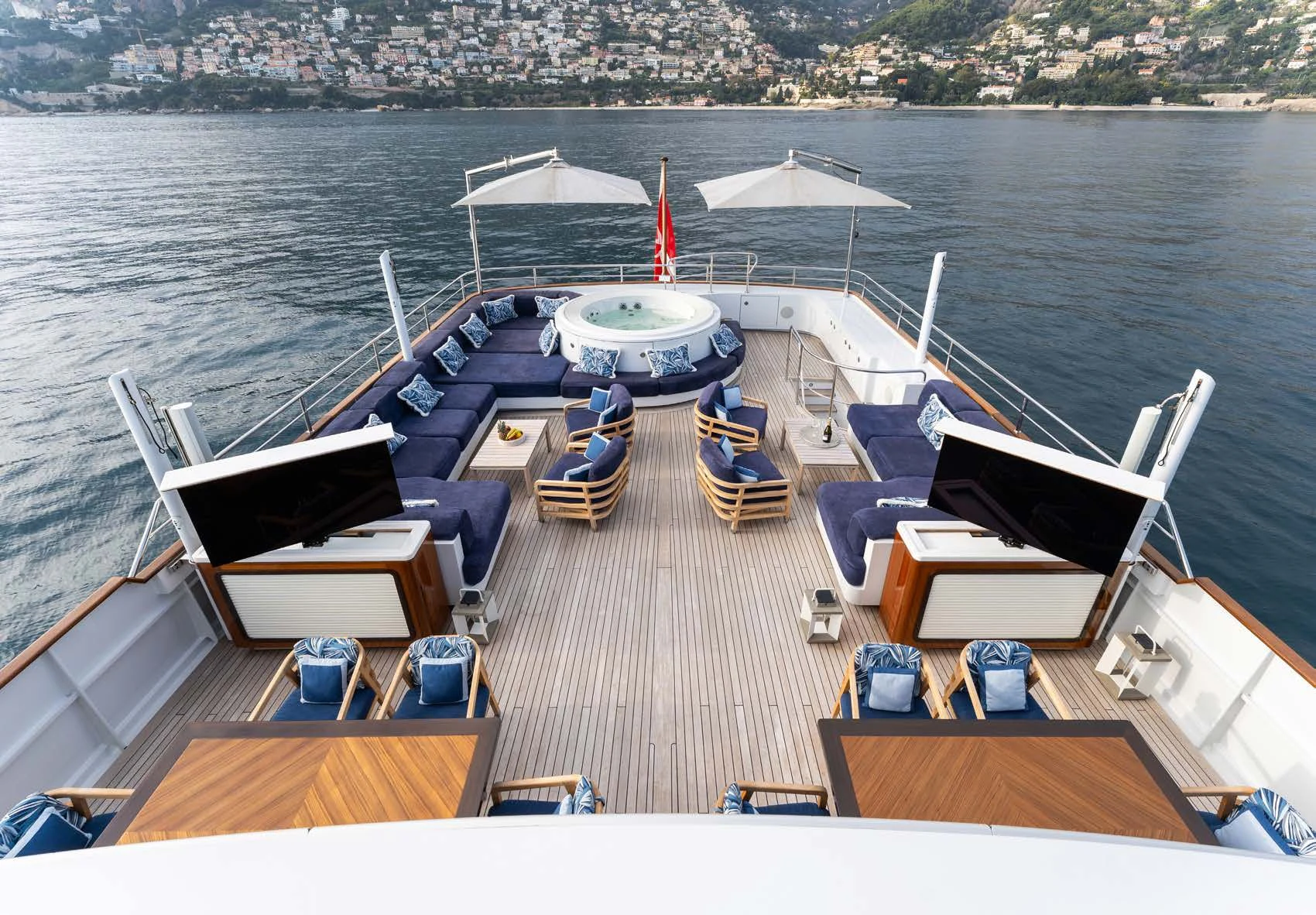 However, the masterpiece of the refit is undoubtedly her newly redesigned bridge deck. A Jacuzzi can now be found aft surrounded by sun beds and seating. Forward is an alfresco dining area that can be split into two distinct tables or combined for bigger groups. A large bar completes the space. Above, the sundeck houses gym equipment with pilot seats for guests to enjoy whilst cruising.