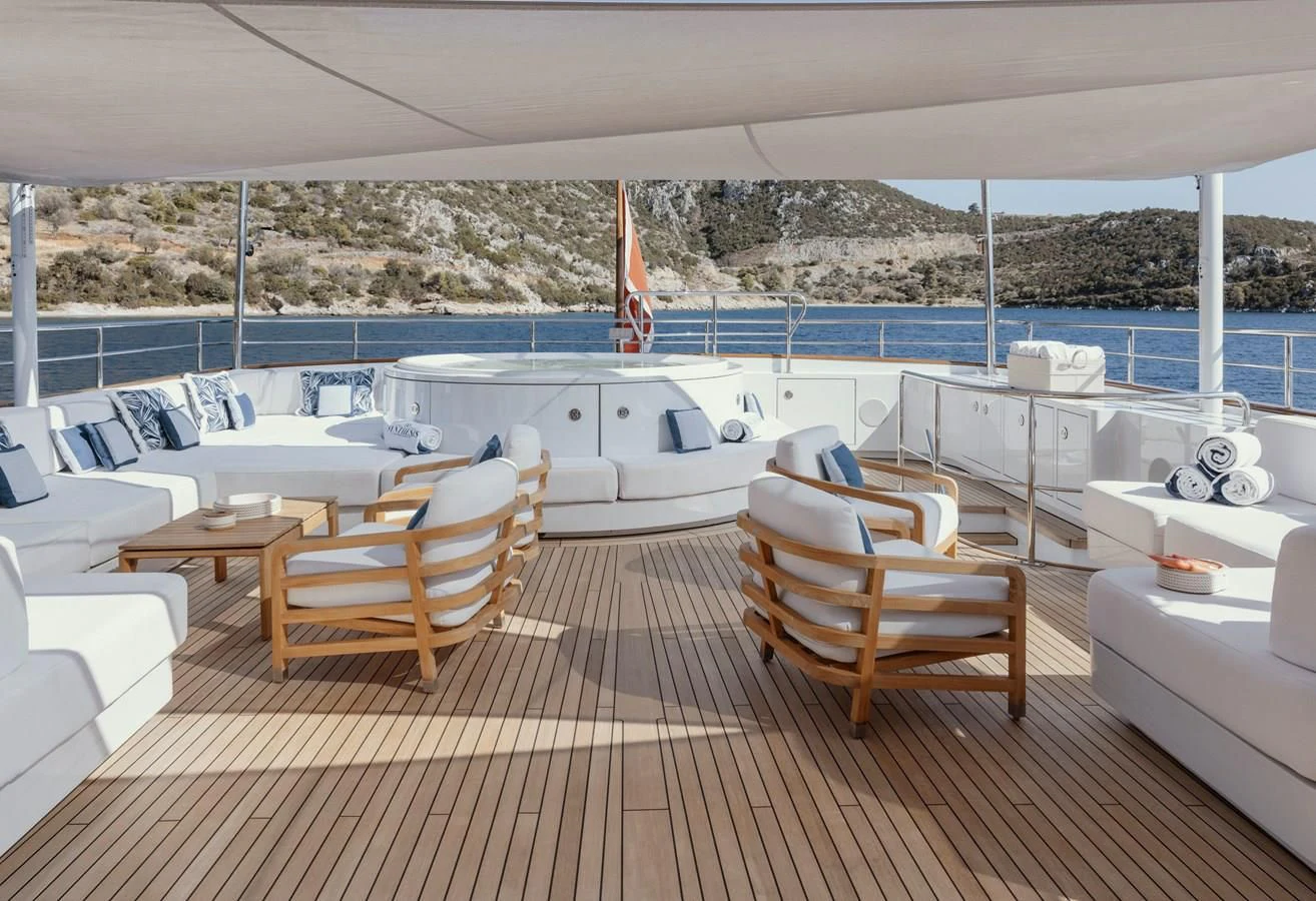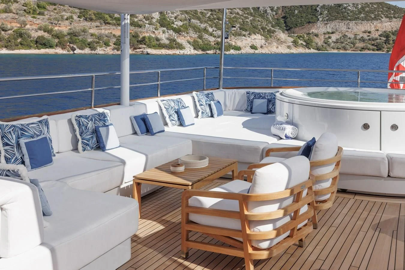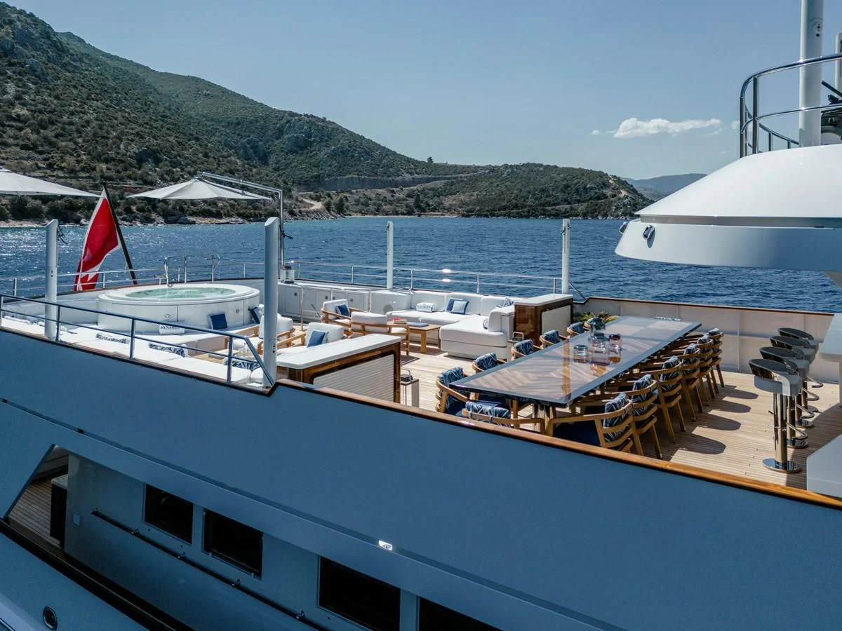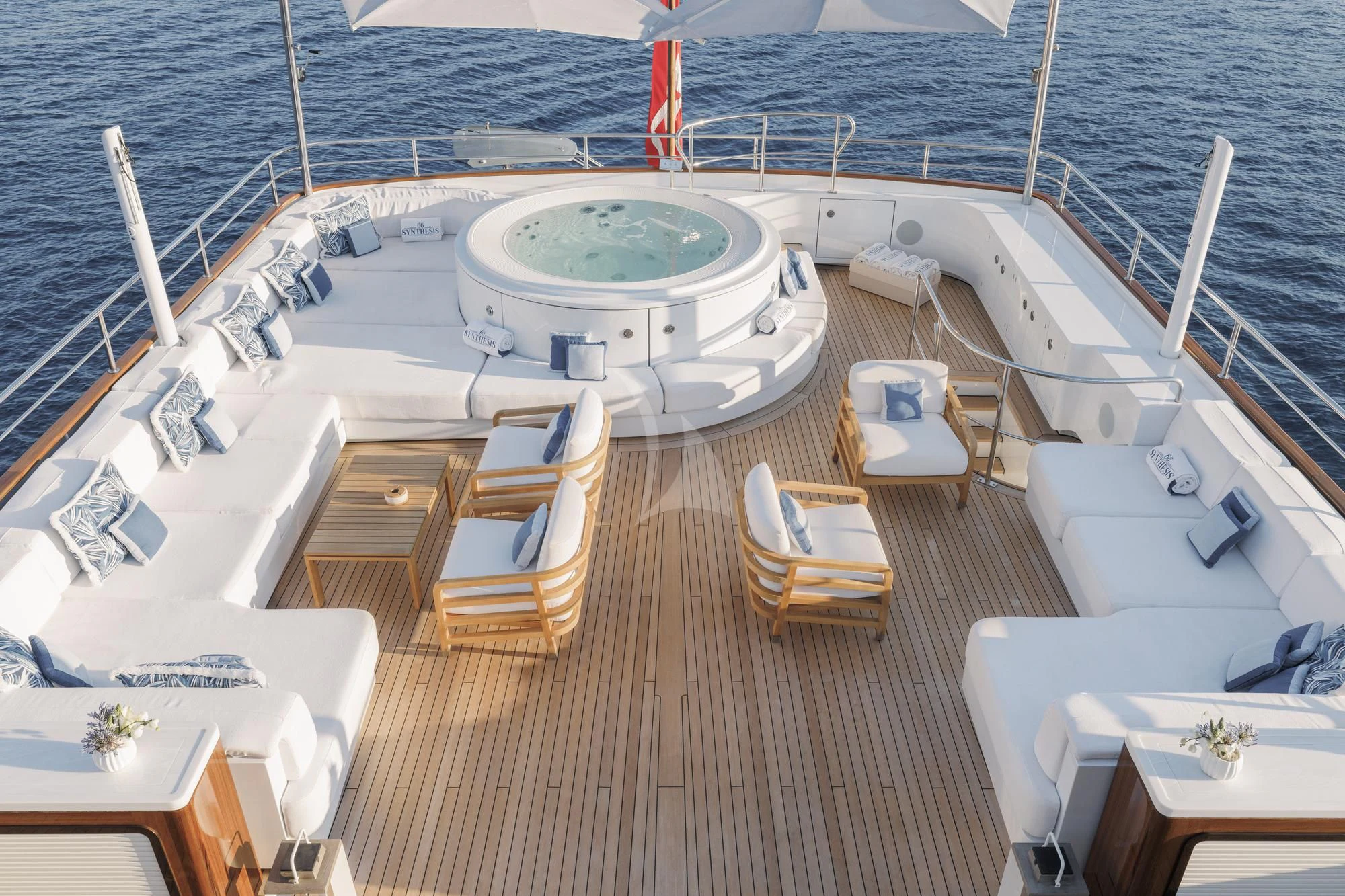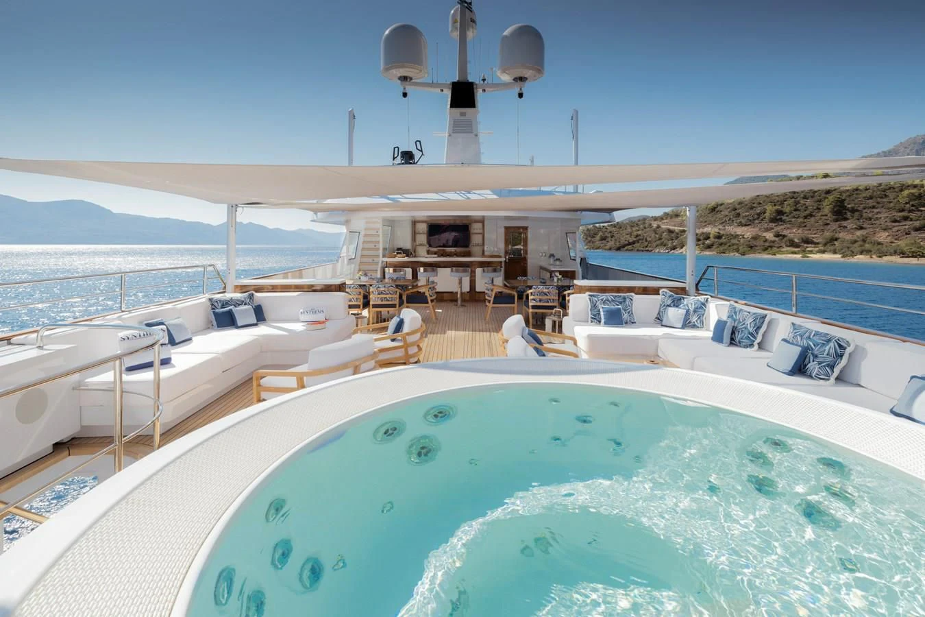However, the masterpiece of the refit is undoubtedly her newly redesigned bridge deck. A Jacuzzi can now be found aft surrounded by sun beds and seating. Forward is an alfresco dining area that can be split into two distinct tables or combined for bigger groups. A large bar completes the space. Above, the sundeck houses gym equipment with pilot seats for guests to enjoy whilst cruising.