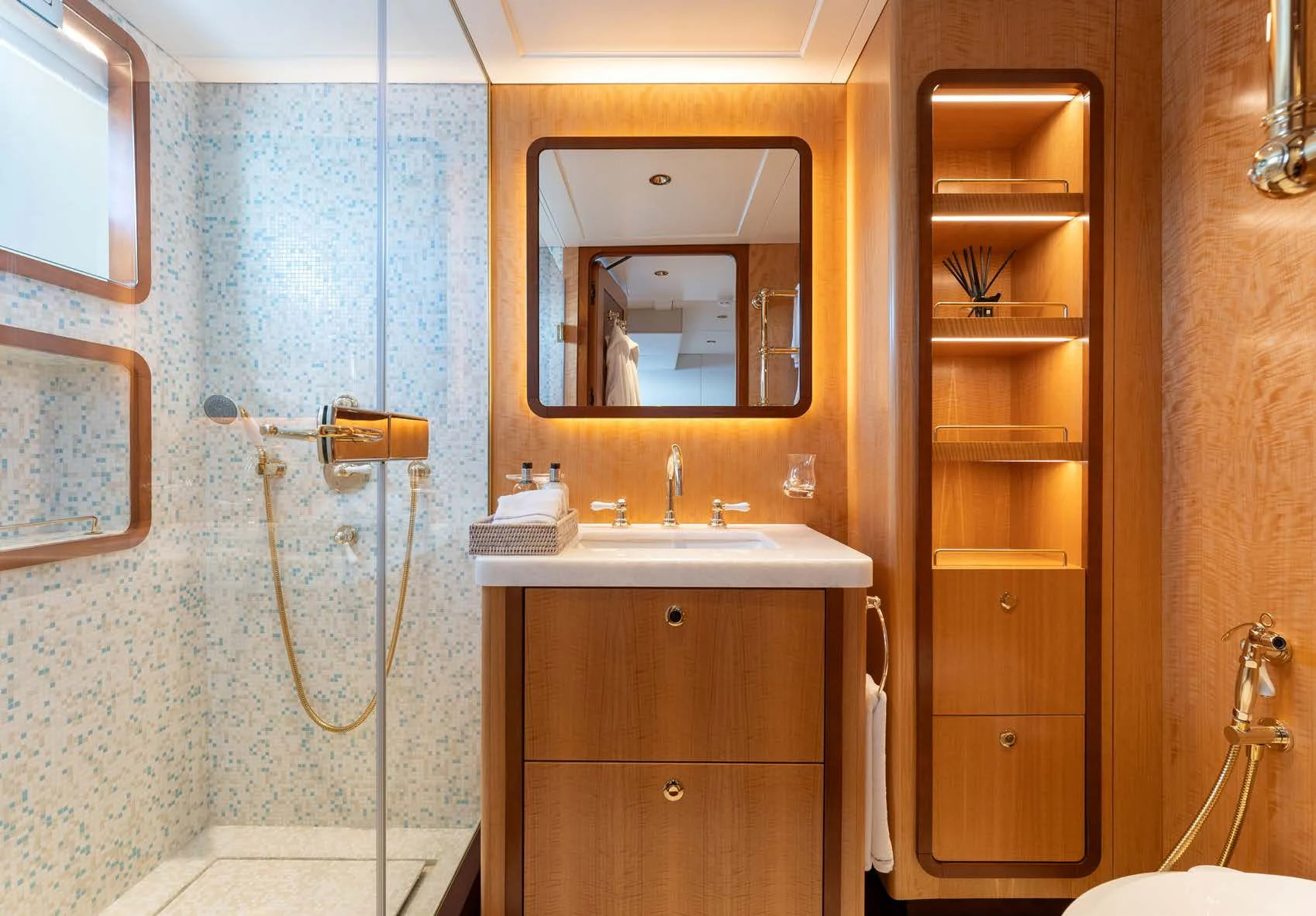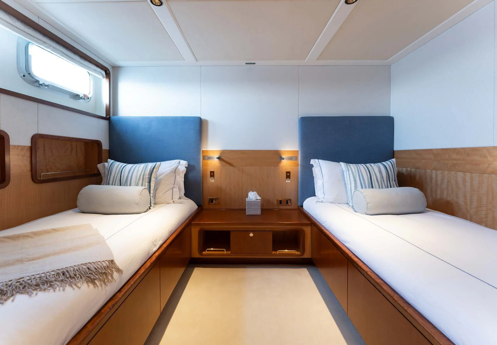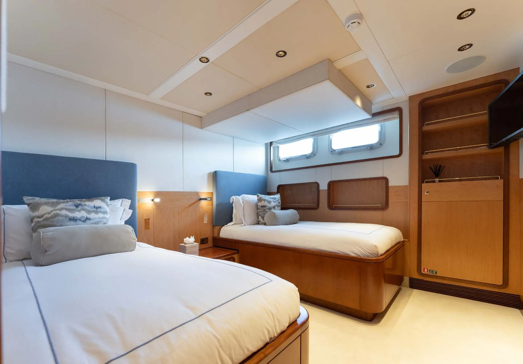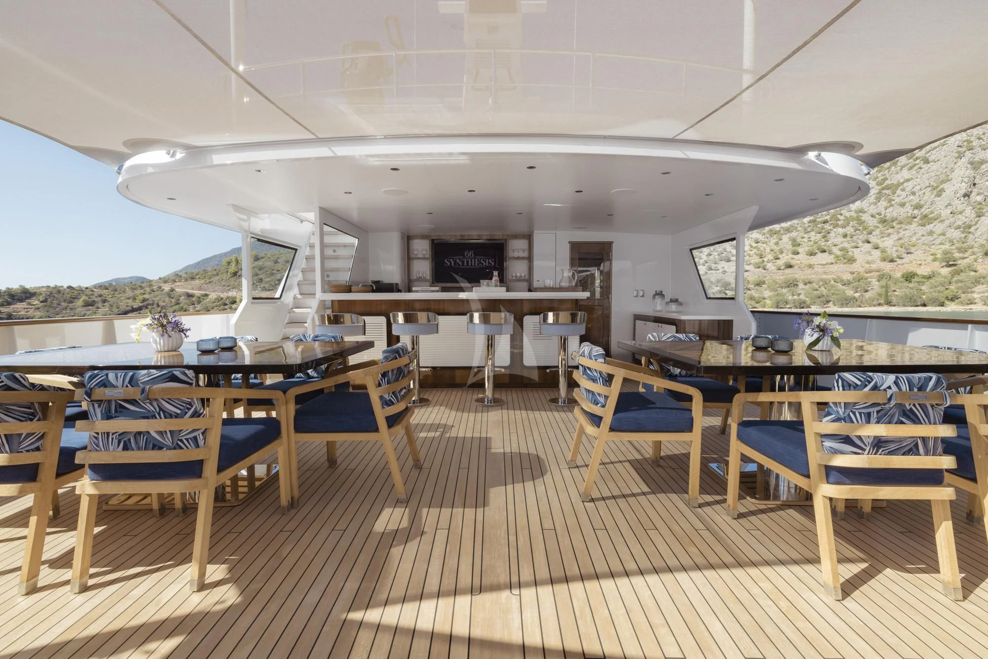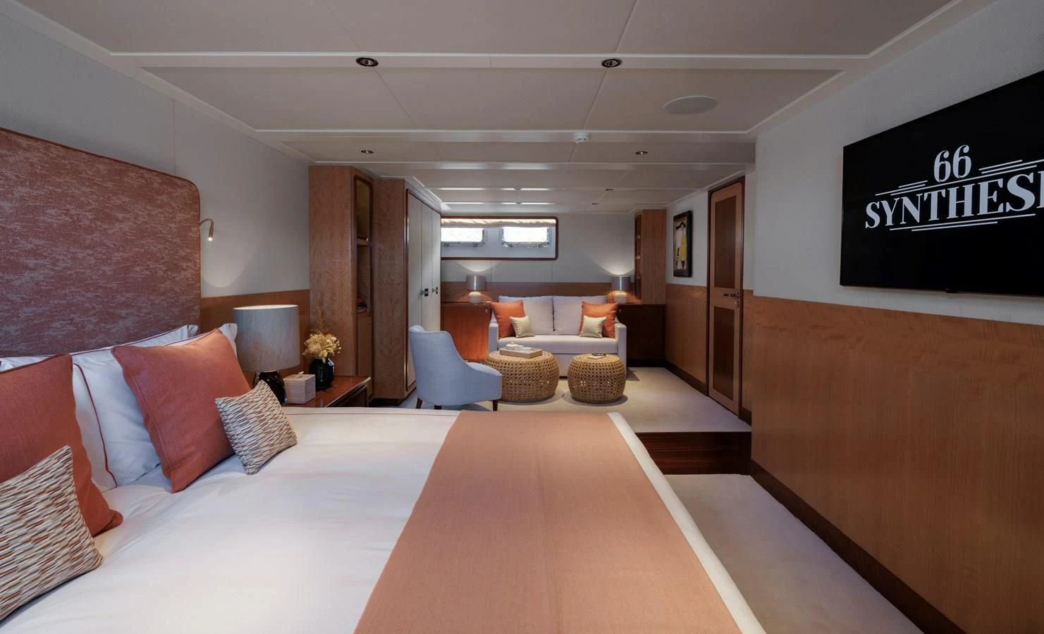 SYNTHESIS 66 can comfortably accommodate up to 10 guests across five beautiful cabins. The owner’s full-beam master cabin can be found on the main deck through a private walkthrough—which can be converted into an additional cabin if required. This master suite contains an en-suite with a playful mosaic design, accessible via a dressing and vanity area. Her guest suites include a full-beam VIP stateroom with a separate lounge area, queen bed and vanity area; two convertible twin or double cabins and a single non-convertible twin cabin. All of her cabins feature en-suites and ample storage. She also has an additional five cabins for up to nine crew, including a captain’s double cabin aft of the bridge, and another four on the lower deck: three twins and one single.