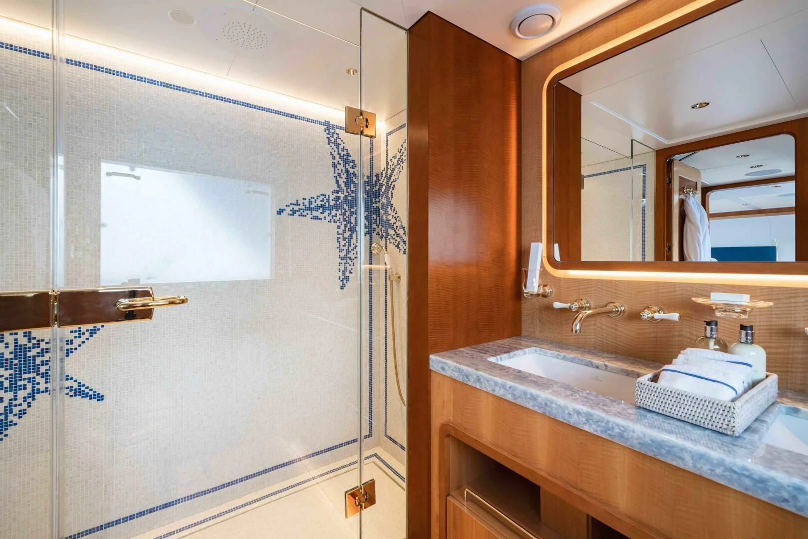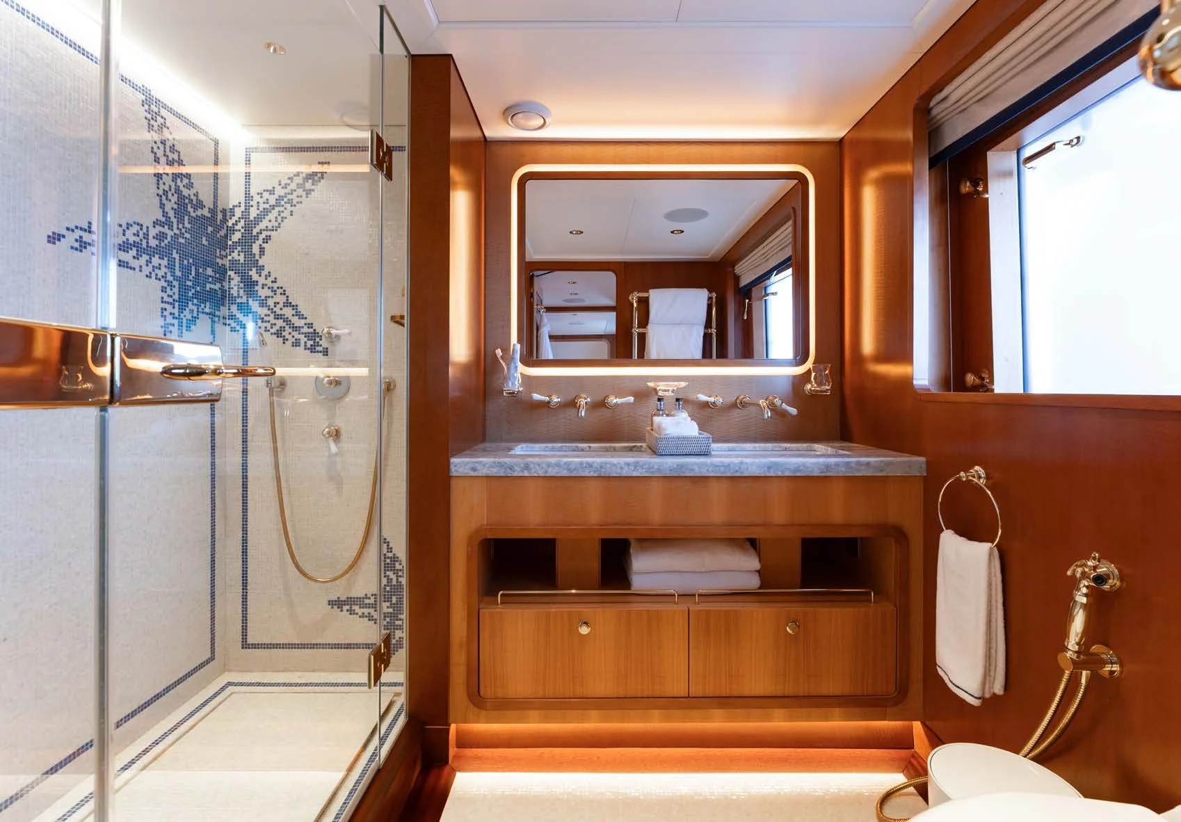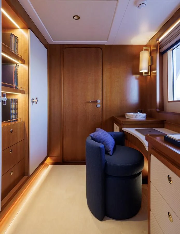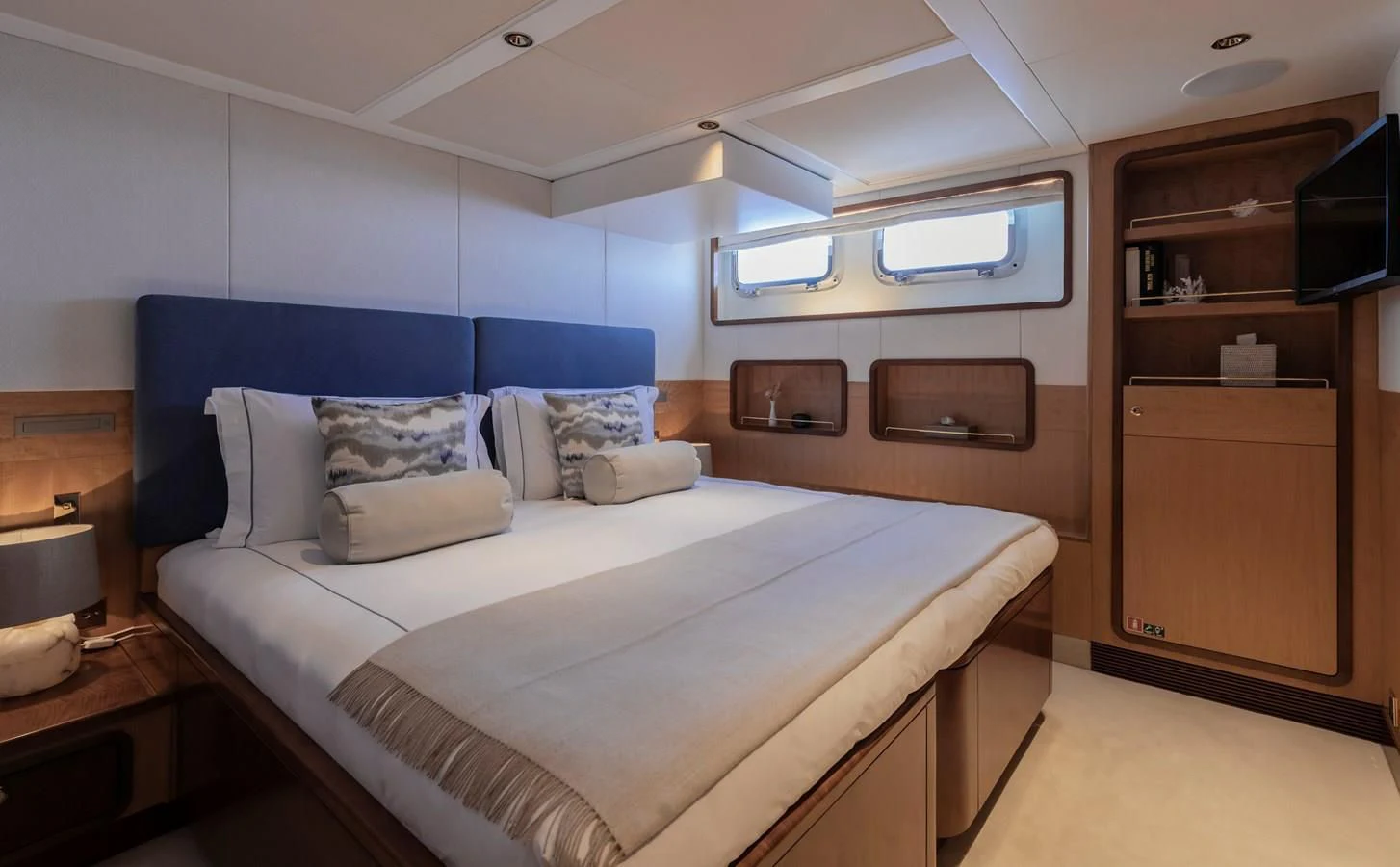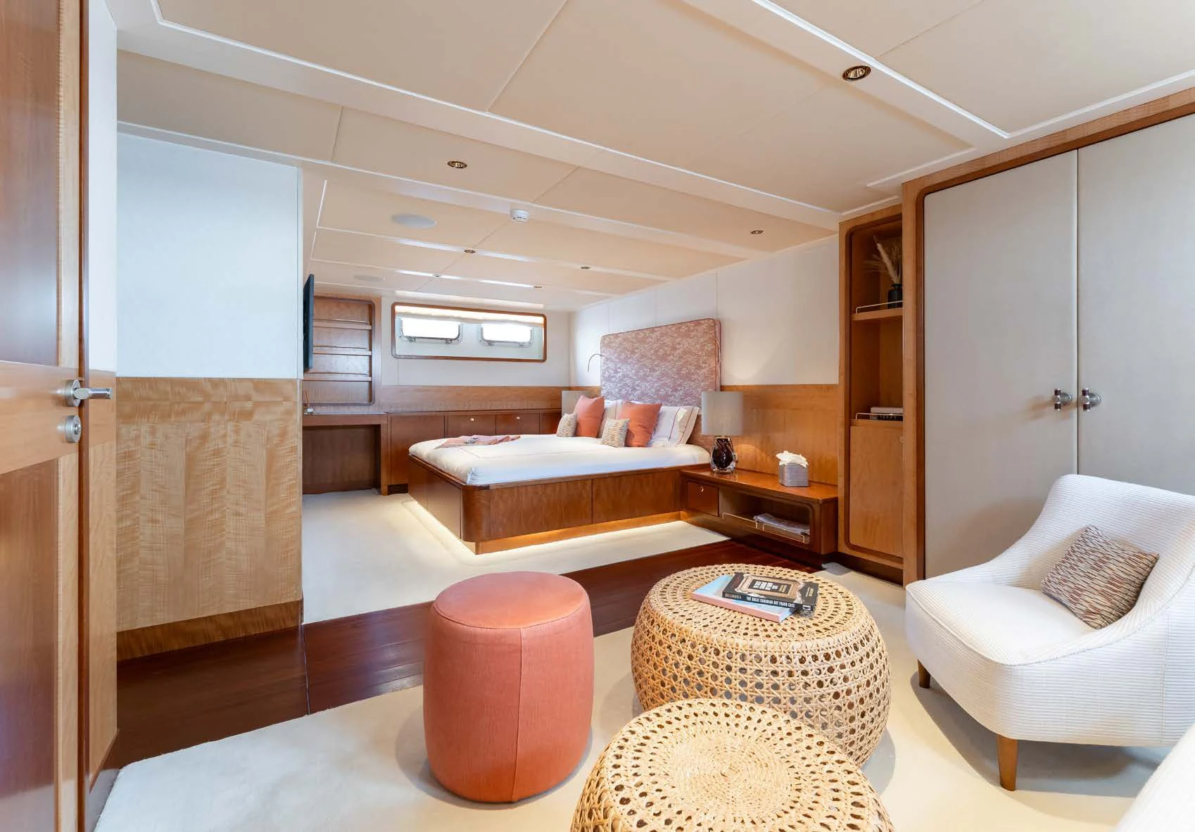 SYNTHESIS 66 can comfortably accommodate up to 10 guests across five beautiful cabins. The owner’s full-beam master cabin can be found on the main deck through a private walkthrough—which can be converted into an additional cabin if required. This master suite contains an en-suite with a playful mosaic design, accessible via a dressing and vanity area. Her guest suites include a full-beam VIP stateroom with a separate lounge area, queen bed and vanity area; two convertible twin or double cabins and a single non-convertible twin cabin. All of her cabins feature en-suites and ample storage. She also has an additional five cabins for up to nine crew, including a captain’s double cabin aft of the bridge, and another four on the lower deck: three twins and one single.
