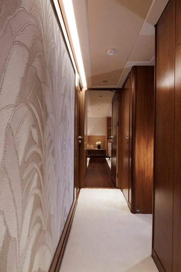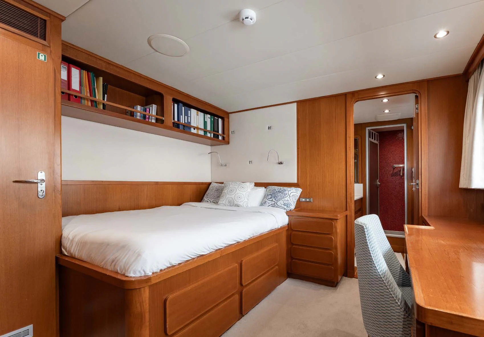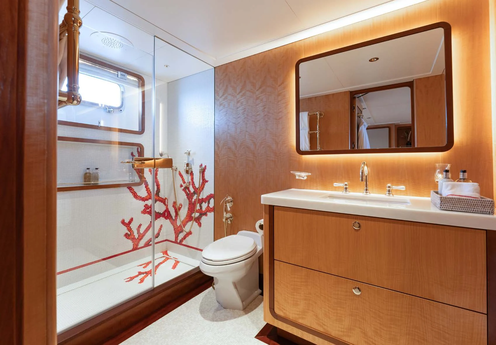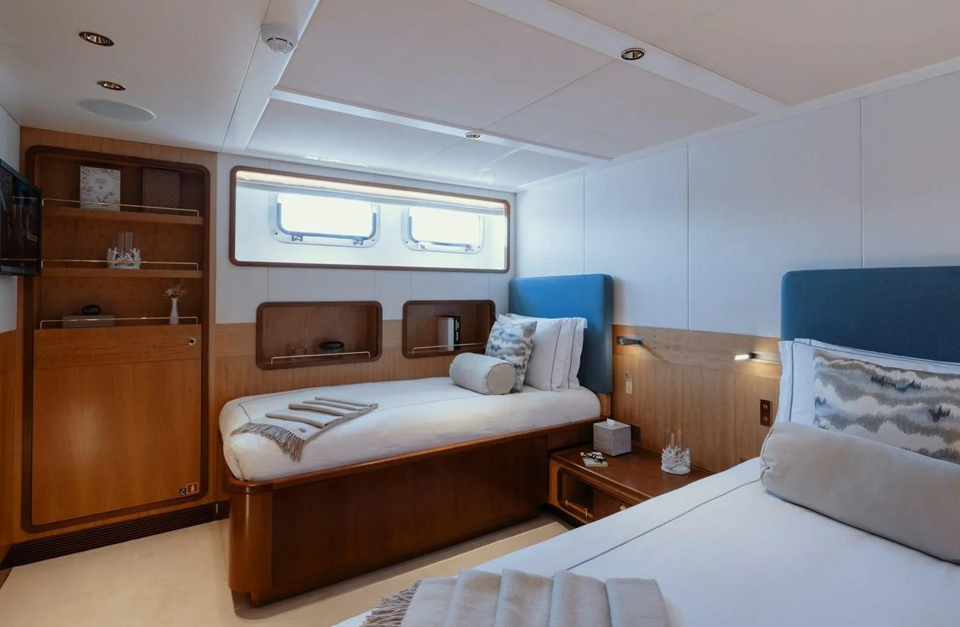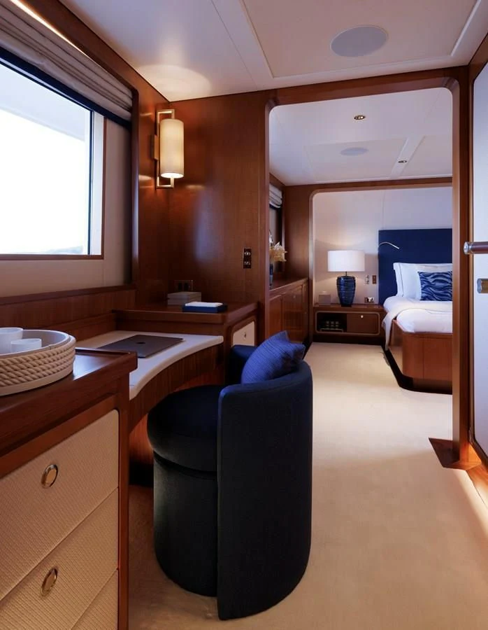 SYNTHESIS 66 can comfortably accommodate up to 10 guests across five beautiful cabins. The owner’s full-beam master cabin can be found on the main deck through a private walkthrough—which can be converted into an additional cabin if required. This master suite contains an en-suite with a playful mosaic design, accessible via a dressing and vanity area. Her guest suites include a full-beam VIP stateroom with a separate lounge area, queen bed and vanity area; two convertible twin or double cabins and a single non-convertible twin cabin. All of her cabins feature en-suites and ample storage. She also has an additional five cabins for up to nine crew, including a captain’s double cabin aft of the bridge, and another four on the lower deck: three twins and one single.