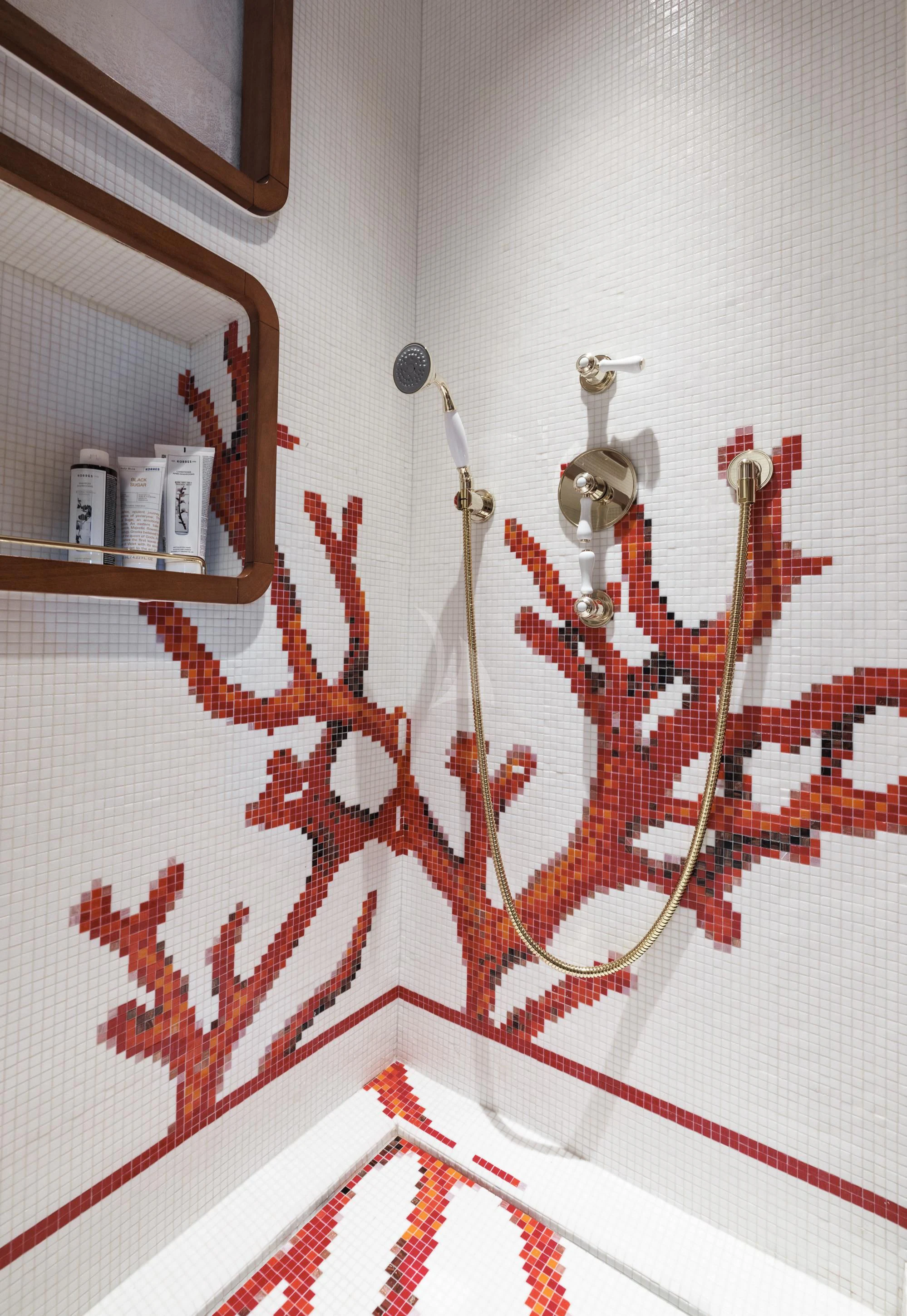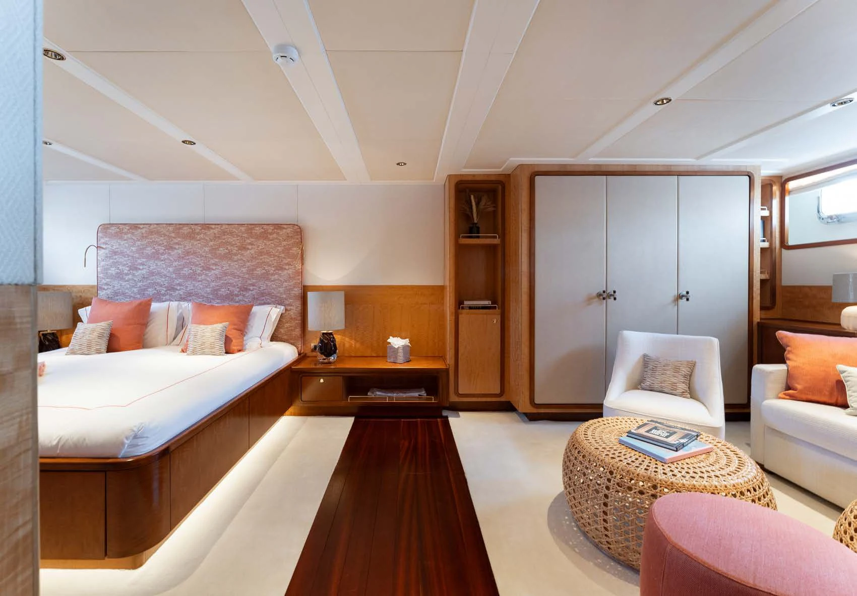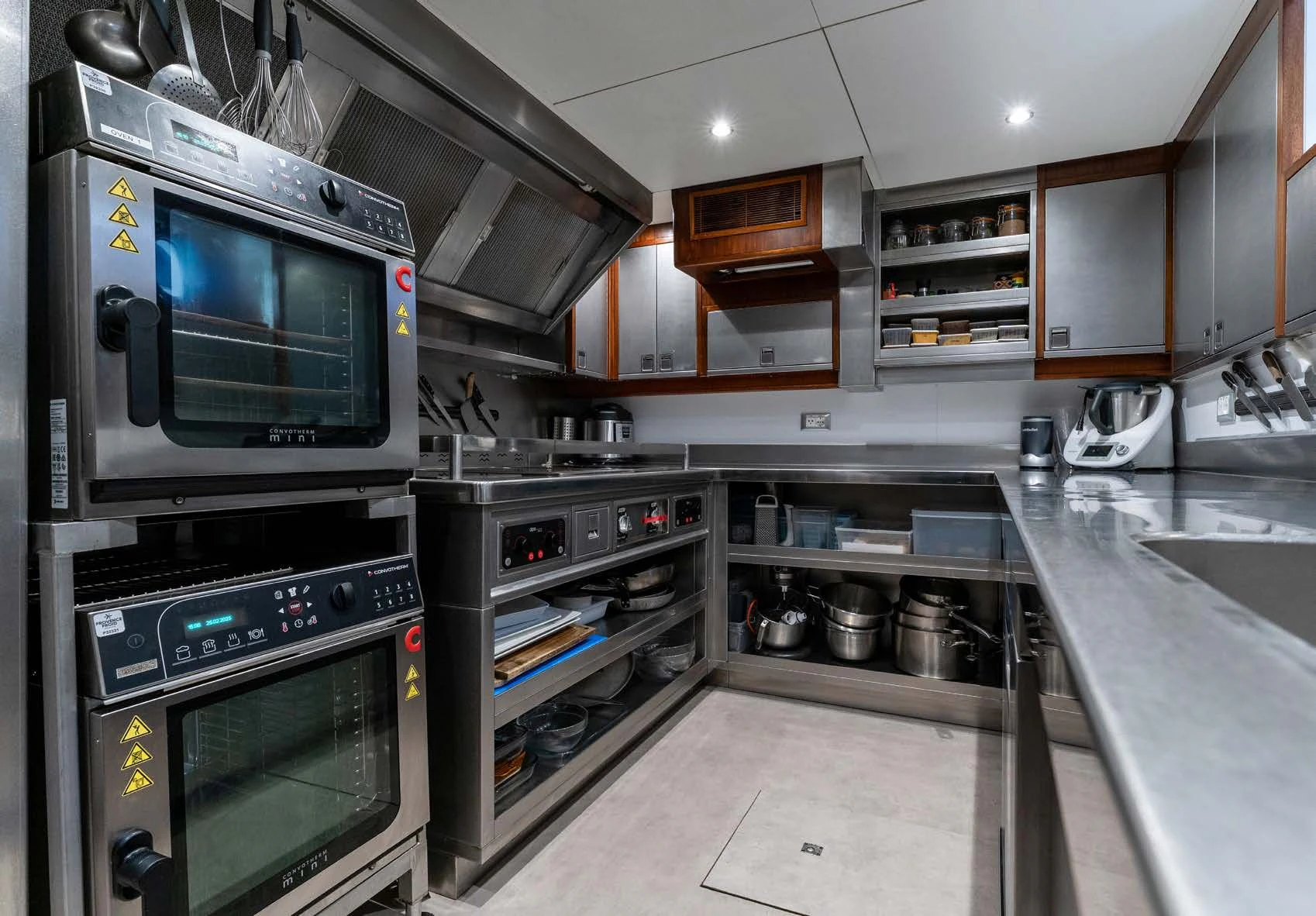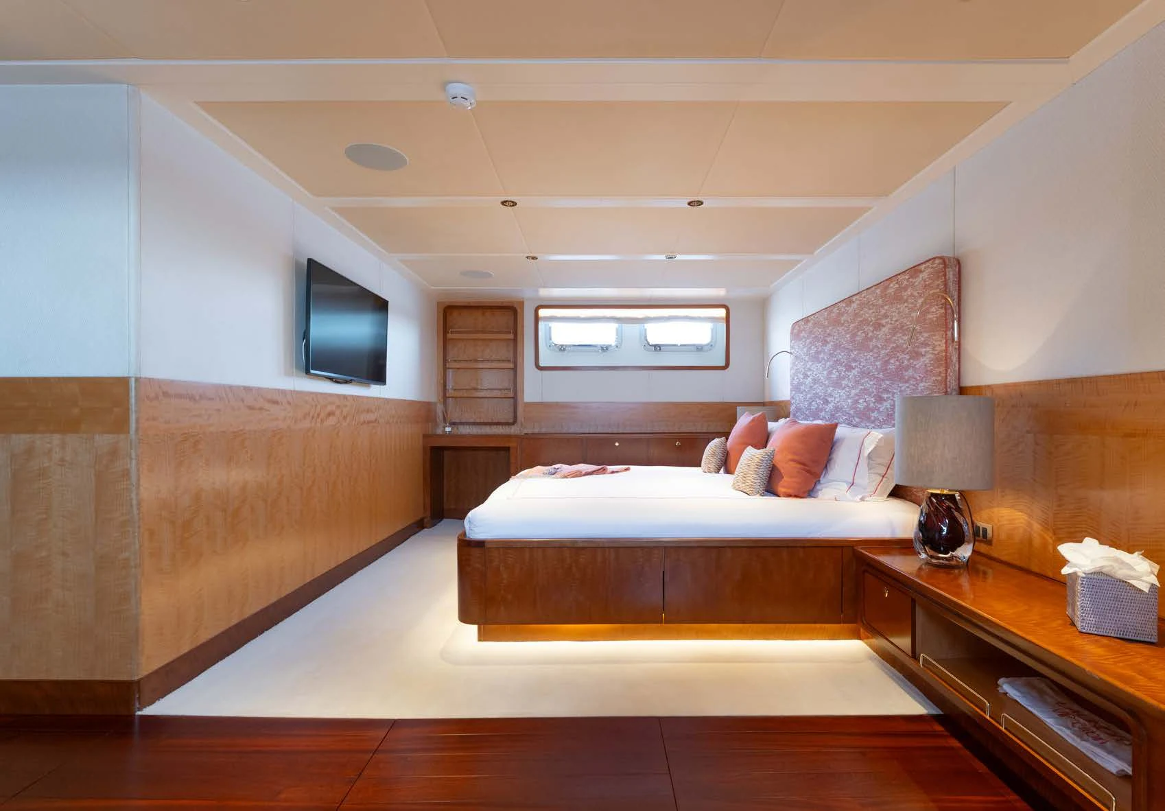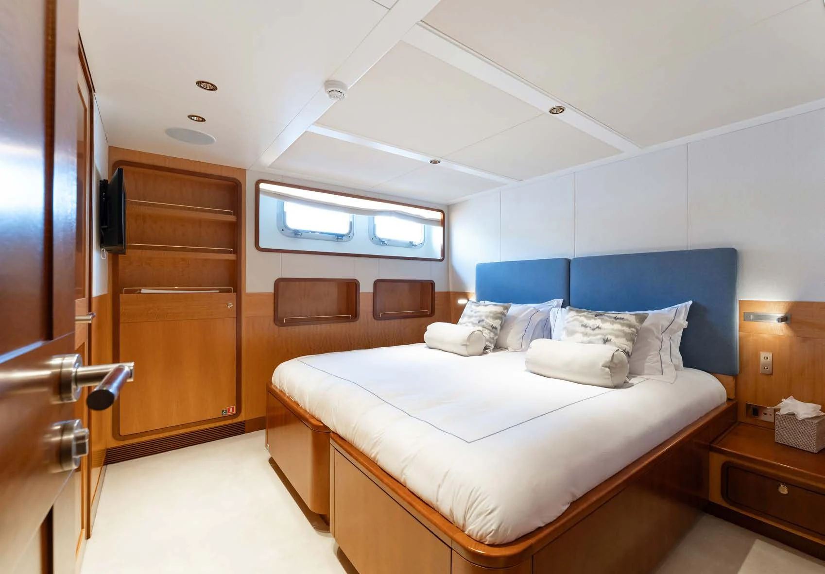 SYNTHESIS 66 can comfortably accommodate up to 10 guests across five beautiful cabins. The owner’s full-beam master cabin can be found on the main deck through a private walkthrough—which can be converted into an additional cabin if required. This master suite contains an en-suite with a playful mosaic design, accessible via a dressing and vanity area. Her guest suites include a full-beam VIP stateroom with a separate lounge area, queen bed and vanity area; two convertible twin or double cabins and a single non-convertible twin cabin. All of her cabins feature en-suites and ample storage. She also has an additional five cabins for up to nine crew, including a captain’s double cabin aft of the bridge, and another four on the lower deck: three twins and one single.
