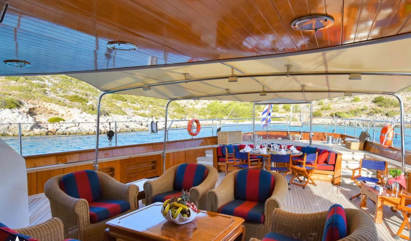 The exterior design of TAMARITA is a harmonious medley of strength and grace. Crafted from robust steel, her hull withstands all sea conditions while maintaining an elegant silhouette. Her beam stretches to an impressive 30 feet (9.2 meters), providing plentiful deck space for guests to bask under the sun or enjoy alfresco dining under the stars. The yacht's cruising speed gracefully glides at 10 knots, reaching up to a maximum speed of 14 knots, ideal for those who appreciate both leisurely exploration and thrilling adventure.