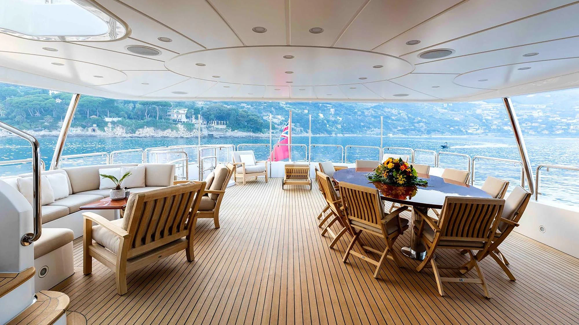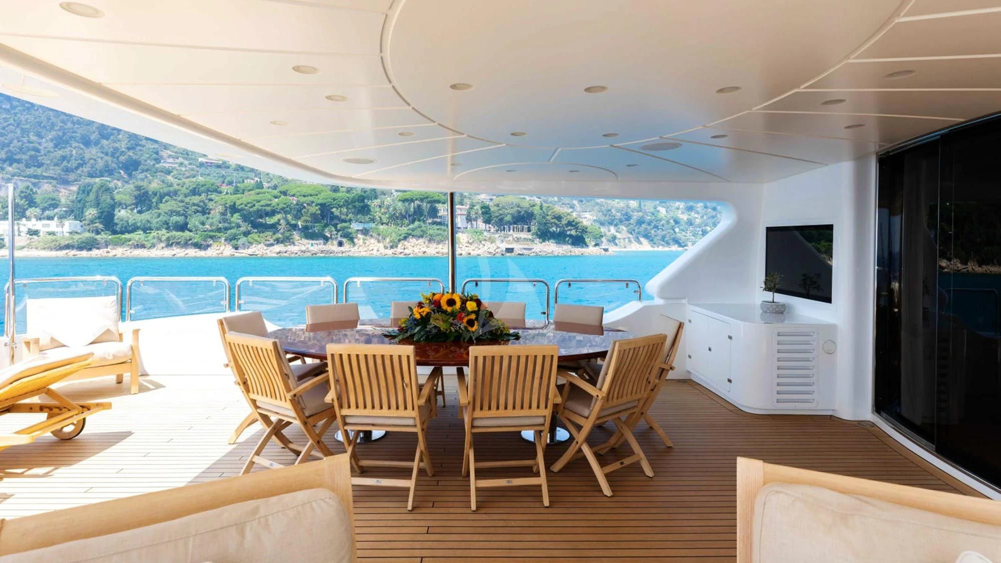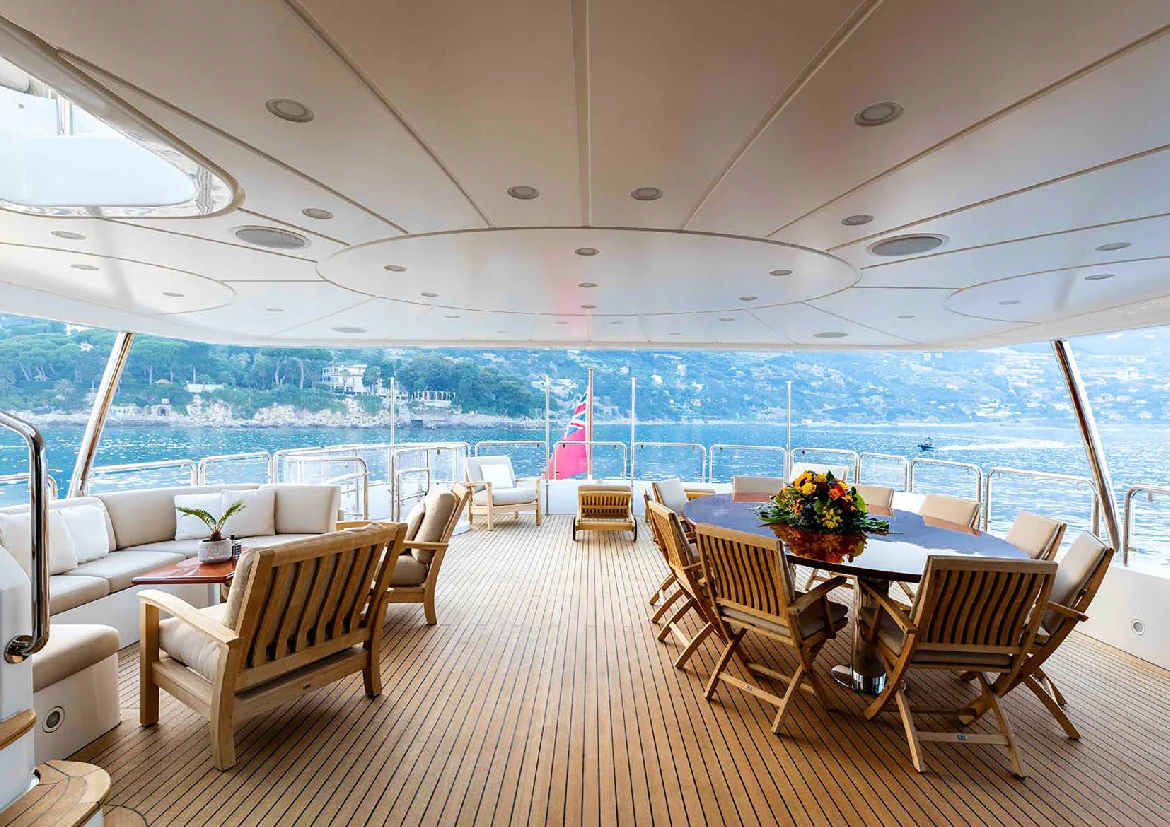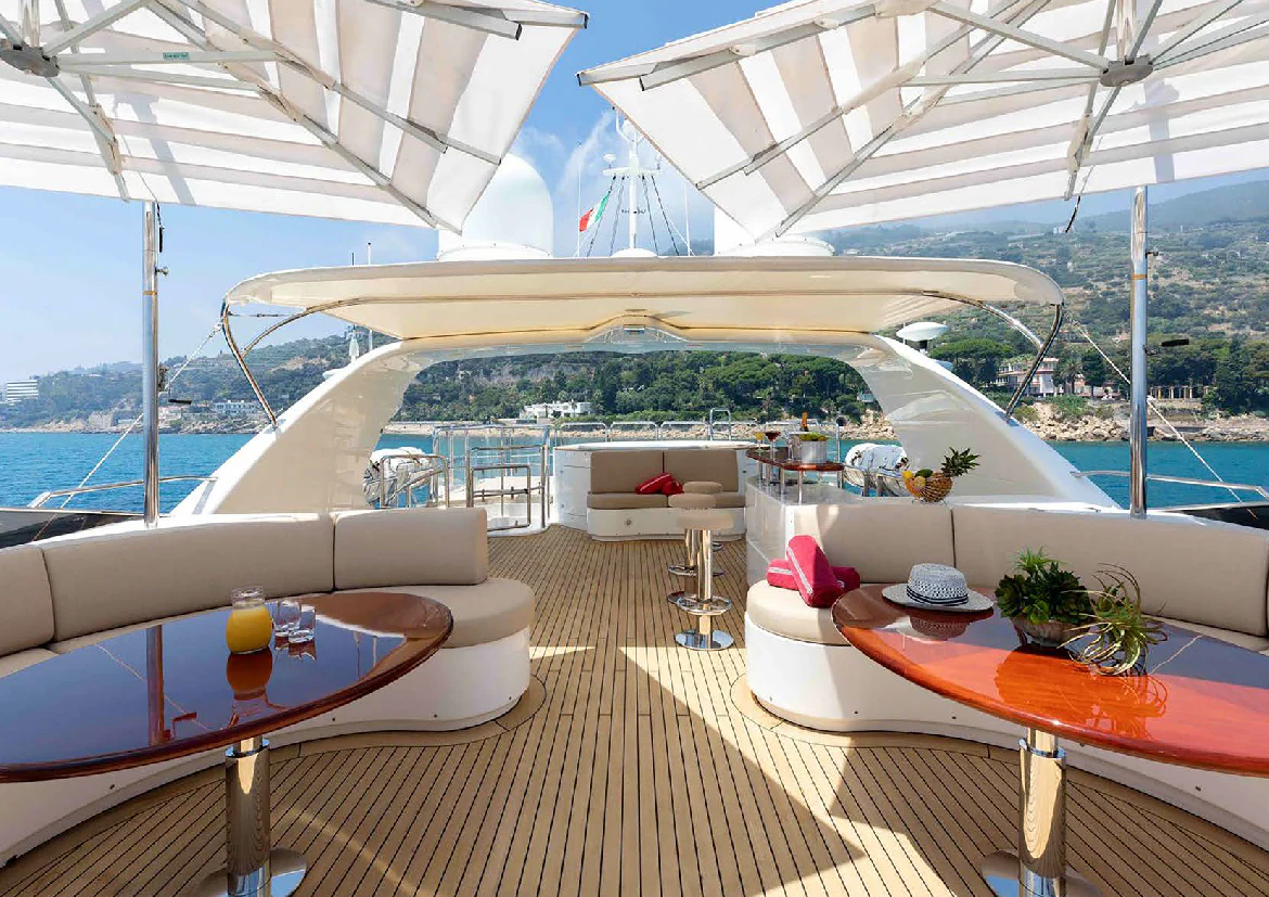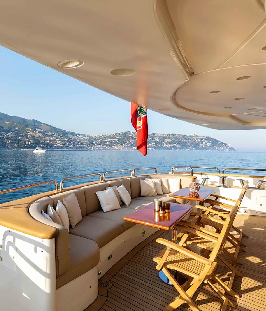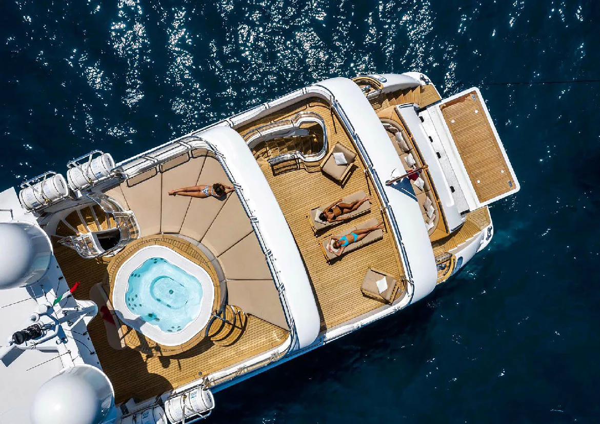 The exterior design of MI AMORE JULIA is truly captivating, featuring sleek lines that exude grace and power. Her spacious decks provide ample room for relaxation or entertainment, complete with a Jacuzzi and At-Anchor Stabilizers for ultimate comfort at sea. The sundeck invites guests to bask under the sun or enjoy alfresco dining with panoramic ocean views. Her expansive exterior spaces are perfect for social gatherings or peaceful solitude amidst the calming rhythm of the waves.