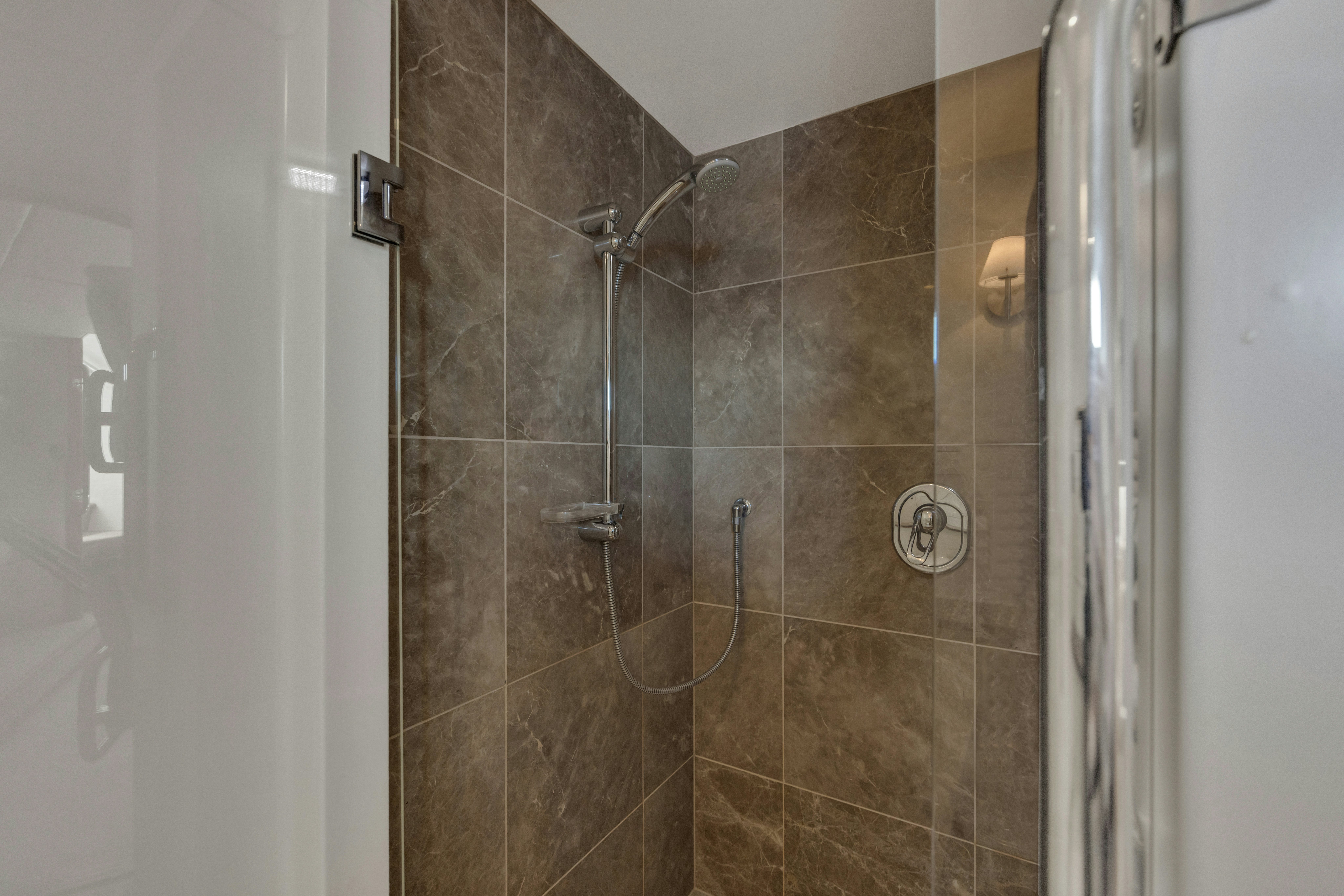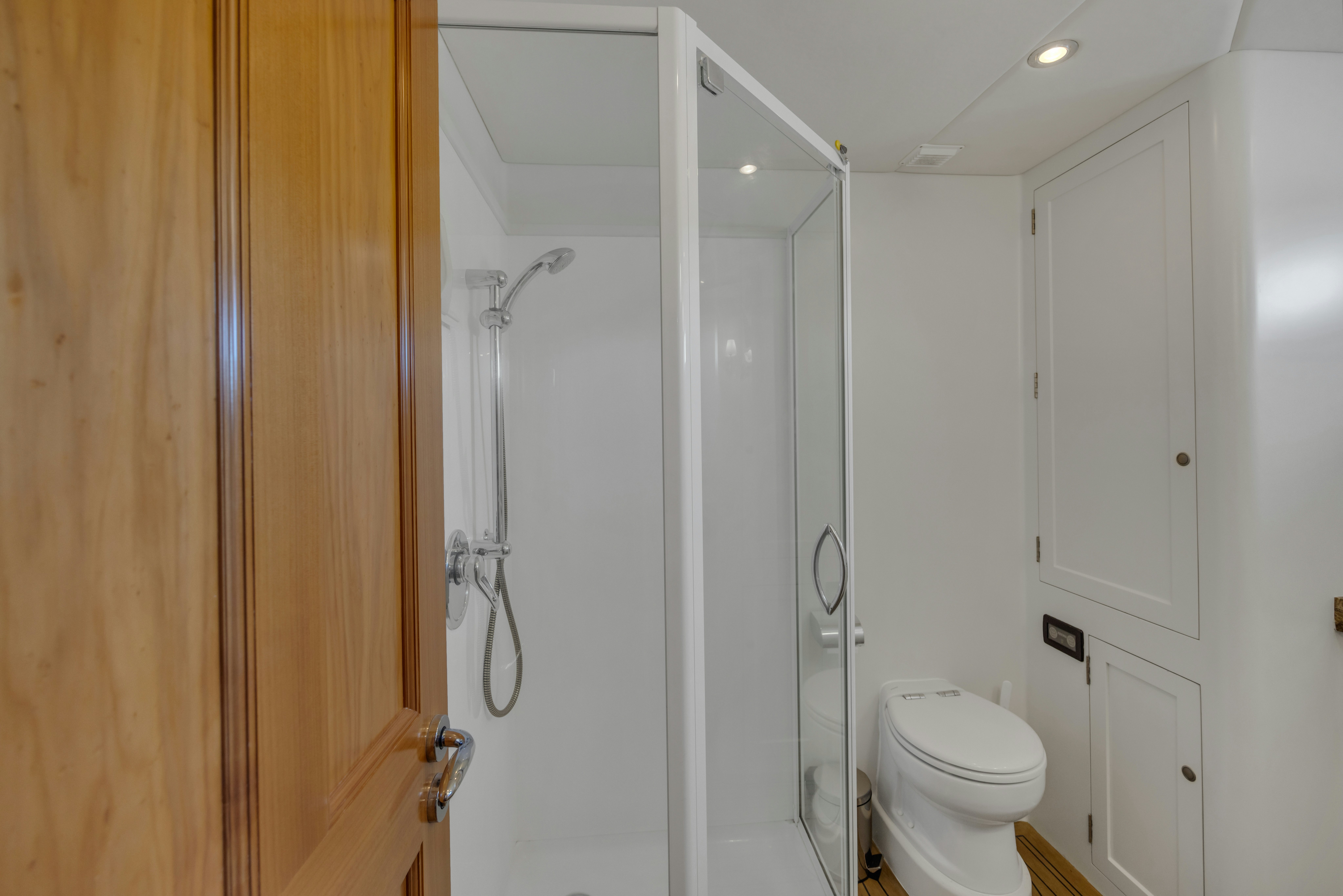 Accommodation is straightforward and spacious. TASMAN sleeps up to eight guests in four cabins, with the full-beam master suite positioned aft for privacy. It’s accessed via a private staircase from the salon and offers direct access to the swim platform—something you rarely see on a yacht of this size and type. The three additional guest cabins are located on the lower deck, each with its own ensuite, and there’s separate crew accommodation for up to three, allowing the onboard experience to remain smooth and discreet.