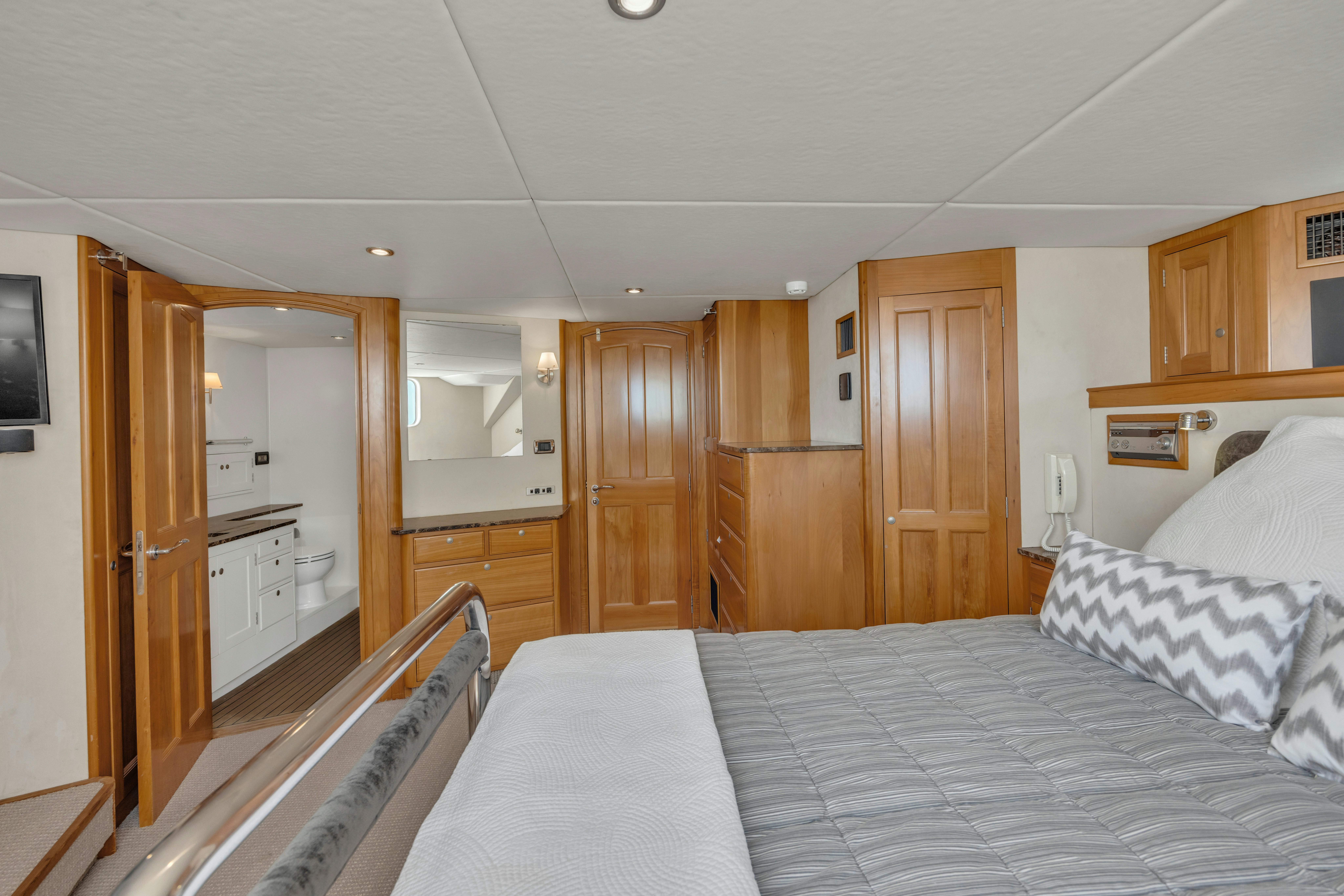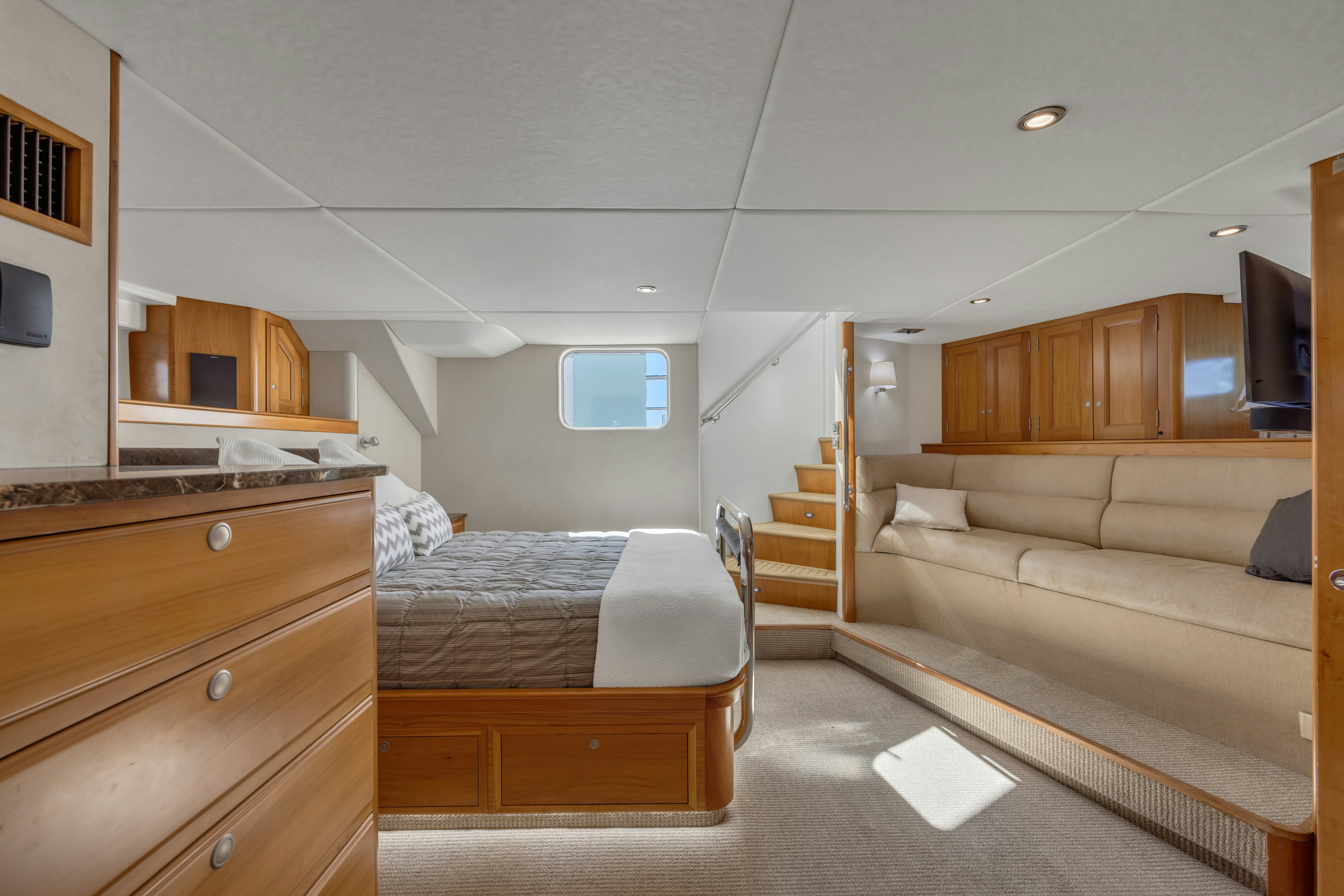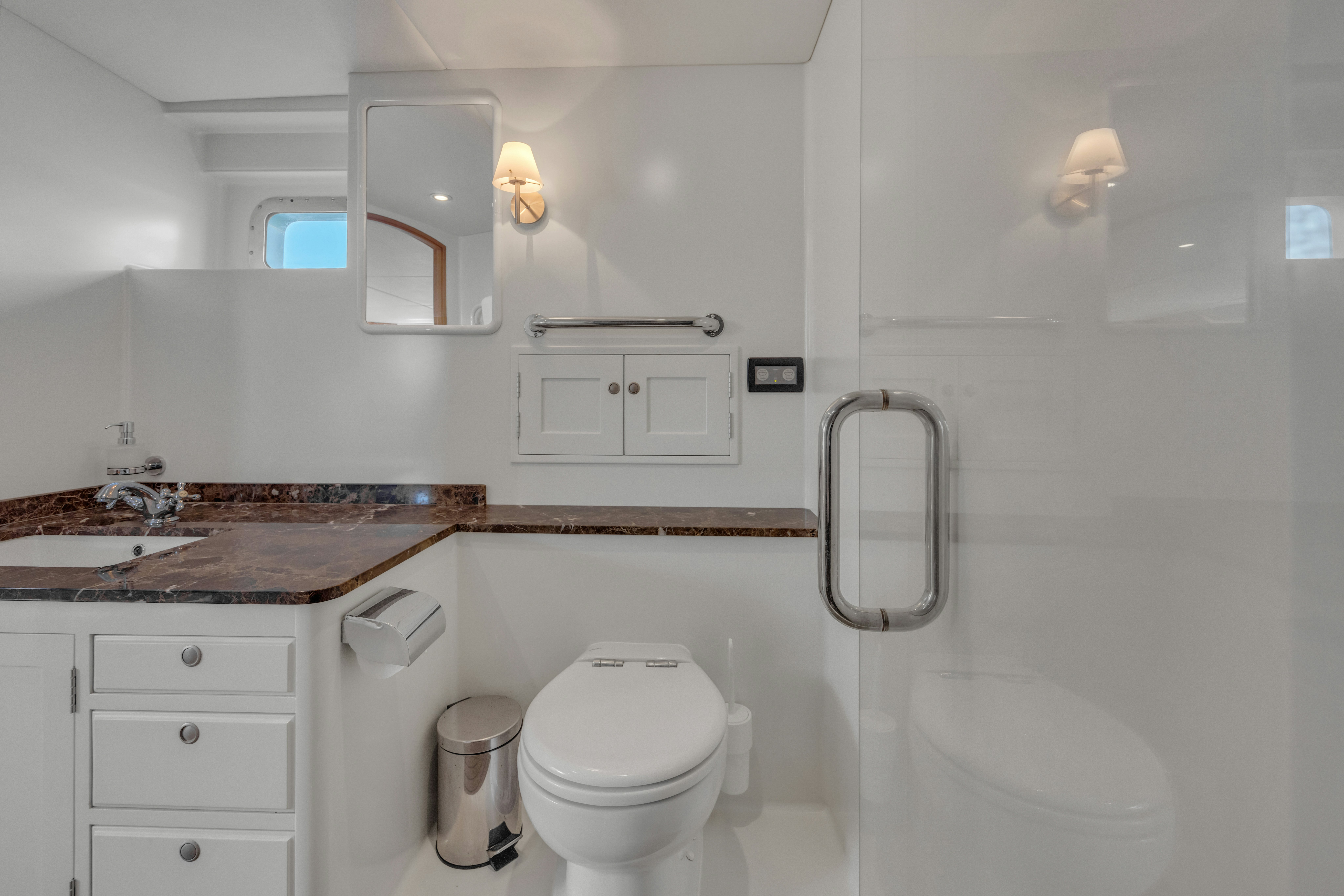 Inside, her layout is practical and welcoming. The main salon is surrounded by large windows, flooding the space with natural light and creating a strong connection to the sea. There’s formal dining for six, a lounge area with a comfortable sofa and coffee table, and plenty of storage for life on board. The galley feels like home, finished in black marble with wooden cupboards and stainless-steel trim, and it’s fully fitted with an induction hob, oven, and all the amenities needed for extended cruising.