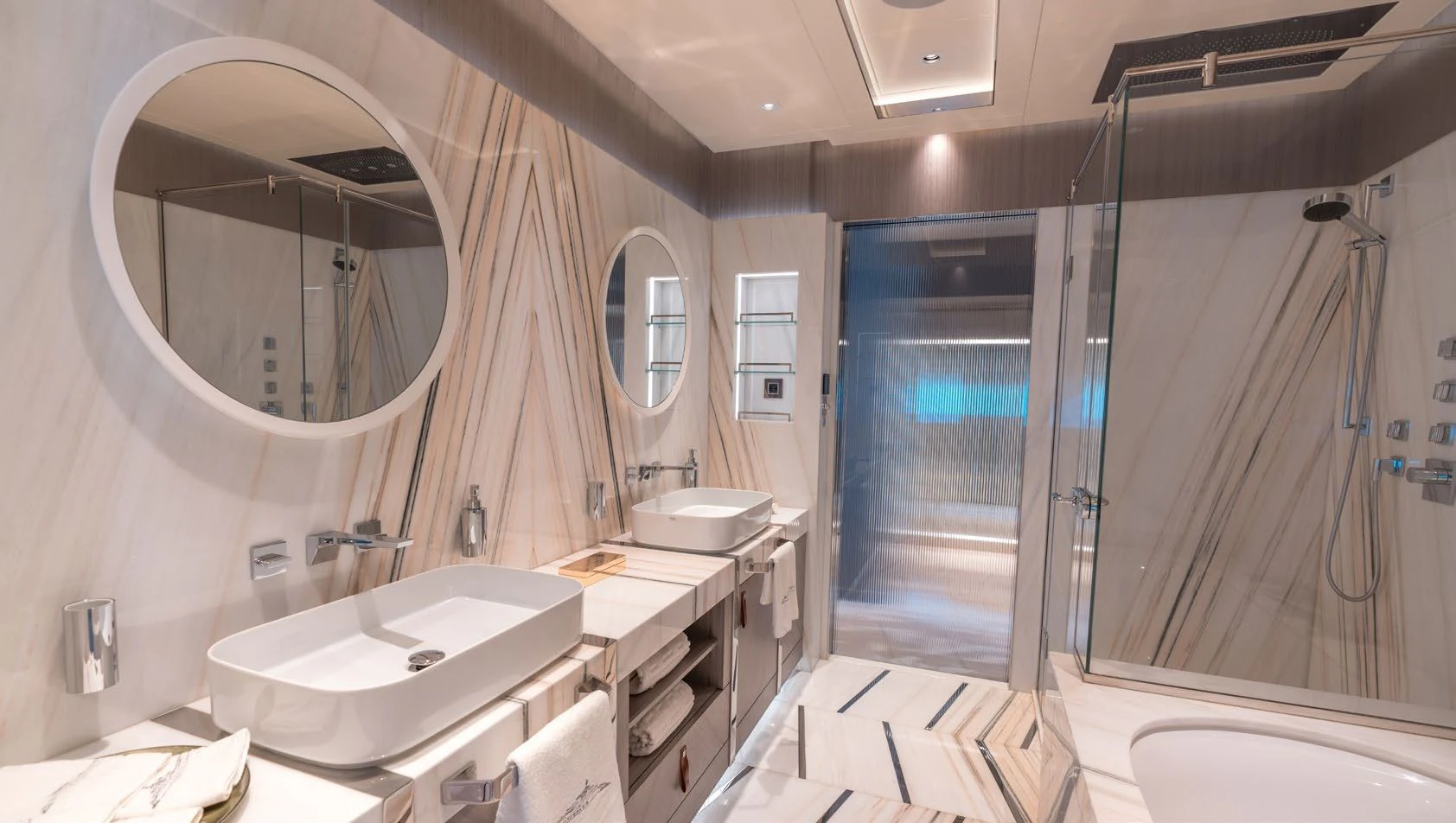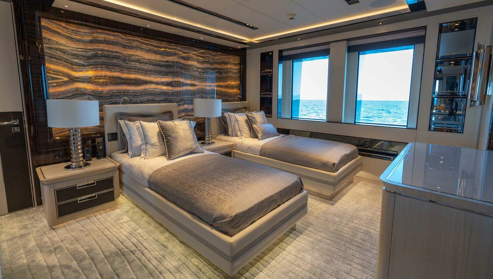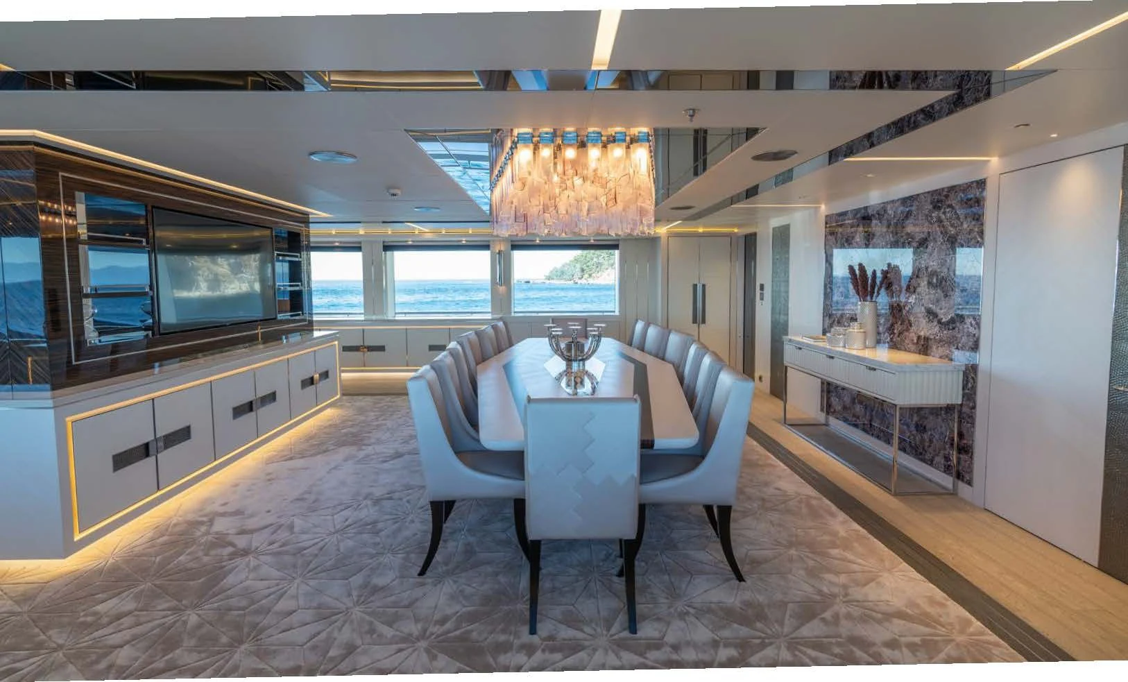 Inside TATIANA, opulence abounds with eight lavish cabins accommodating up to twelve guests along with twenty-four crew members ensuring impeccable service round-the-clock. Each stateroom exudes elegance featuring unique design elements that blend contemporary aesthetics with timeless comfort. The master suite stands as a paragon of luxury living offering breathtaking views alongside state-of-the-art amenities. Additional guest rooms are equally resplendent providing tranquil retreats after days filled with adventure.