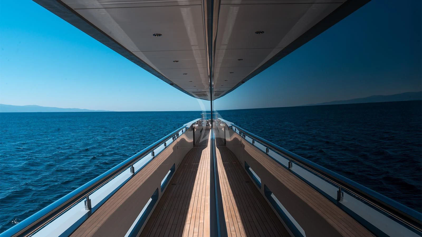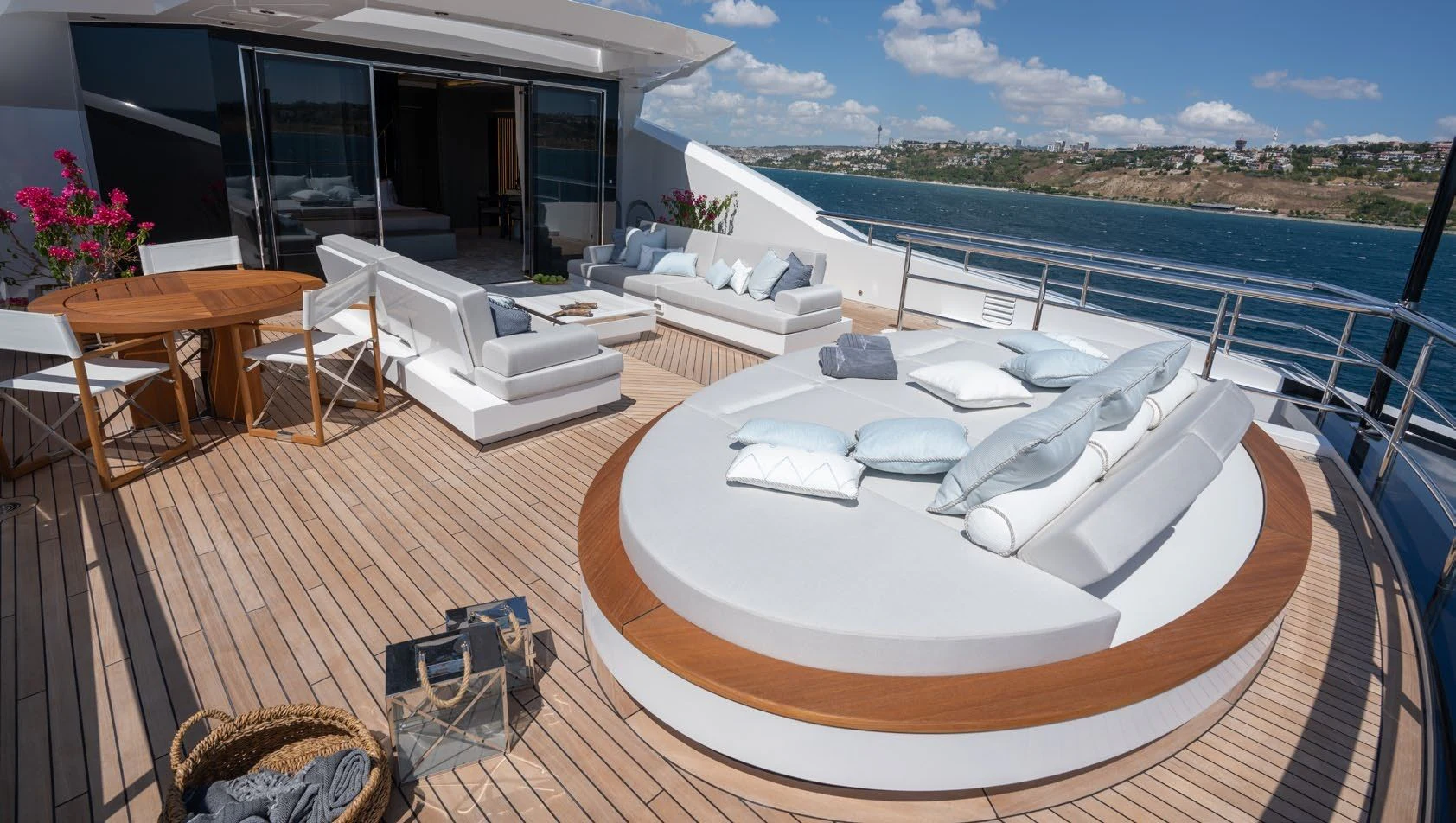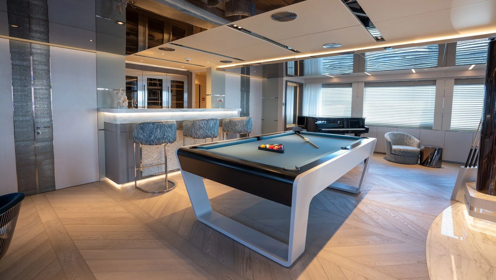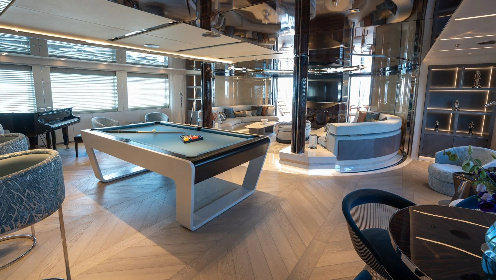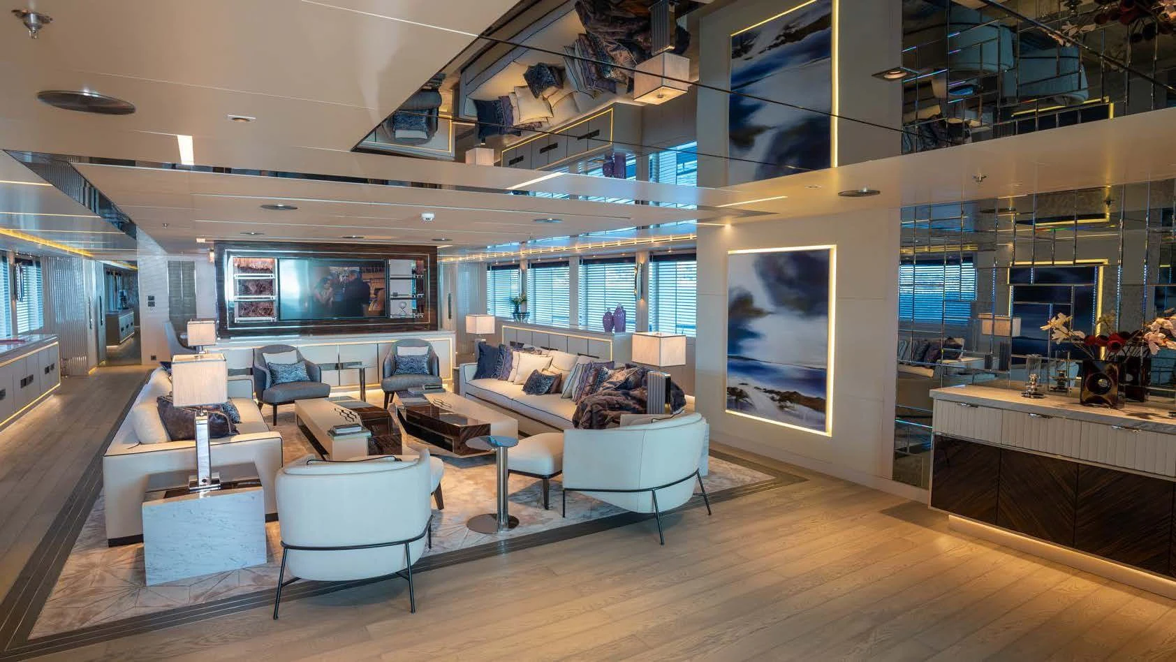 As you step onto TATIANA's deck, you are greeted by expansive sun decks offering panoramic views of your surroundings. An alfresco dining area invites guests to indulge in gourmet meals under starlit skies while lounging areas provide ample space for relaxation and socializing. A notable exterior feature includes the helipad, ready for those who wish to arrive or depart with style and ease. The yacht also hosts an impressive beach club where guests can enjoy water activities or unwind close to the sea level.